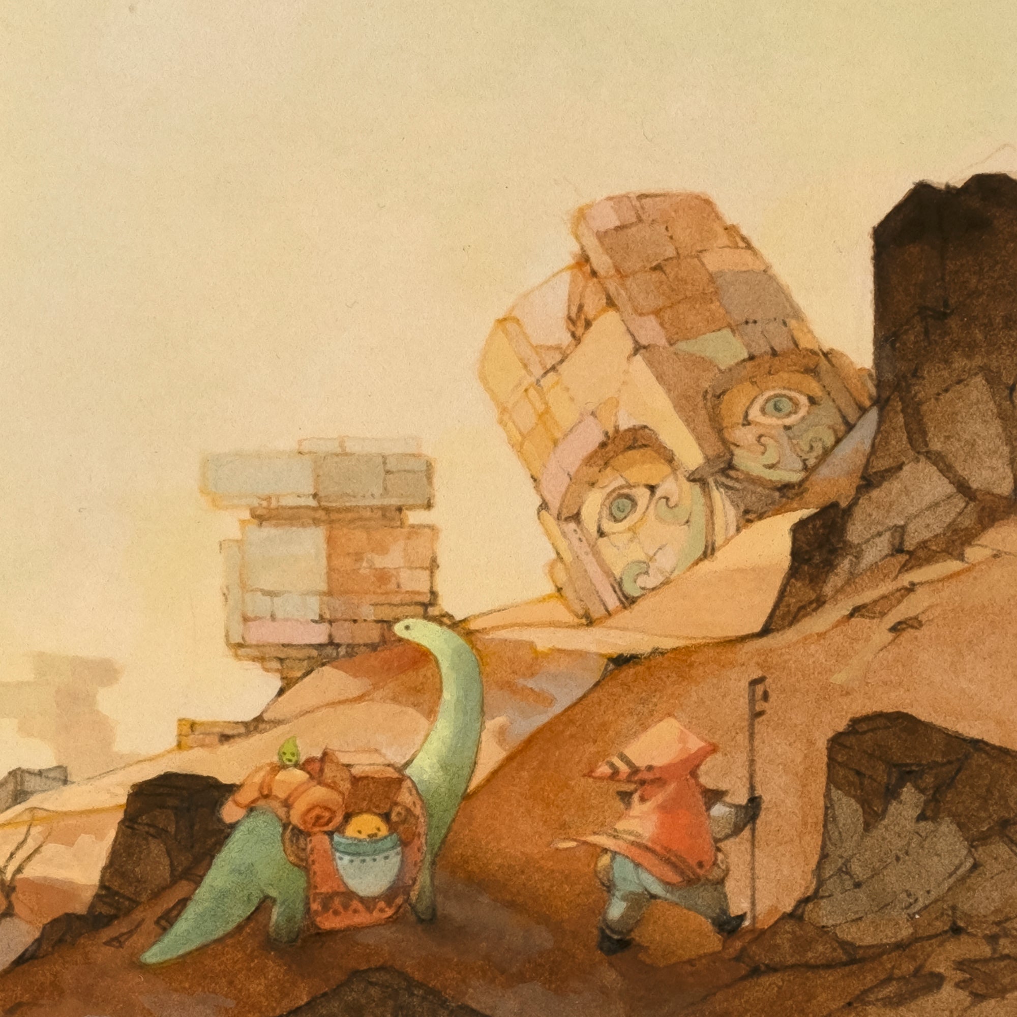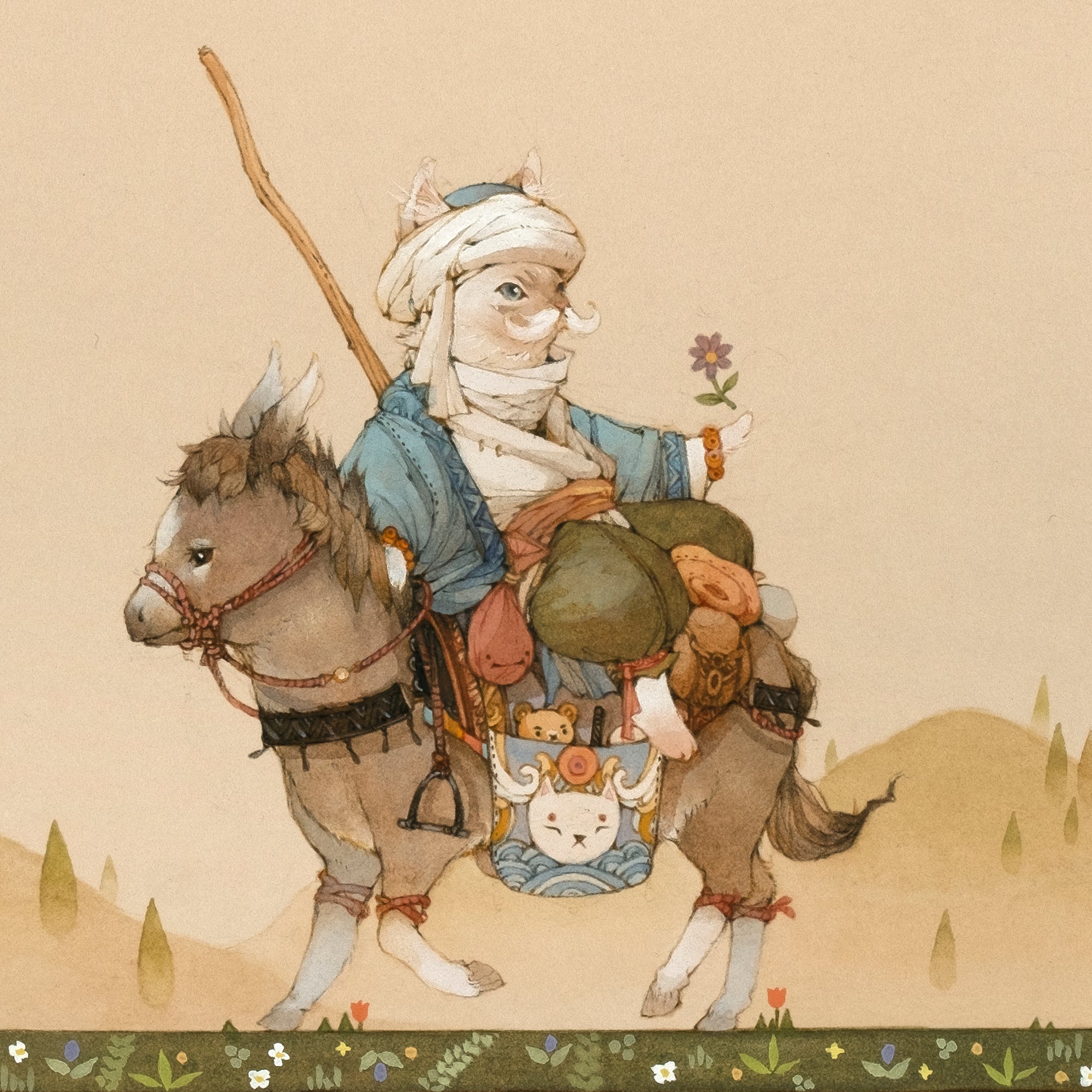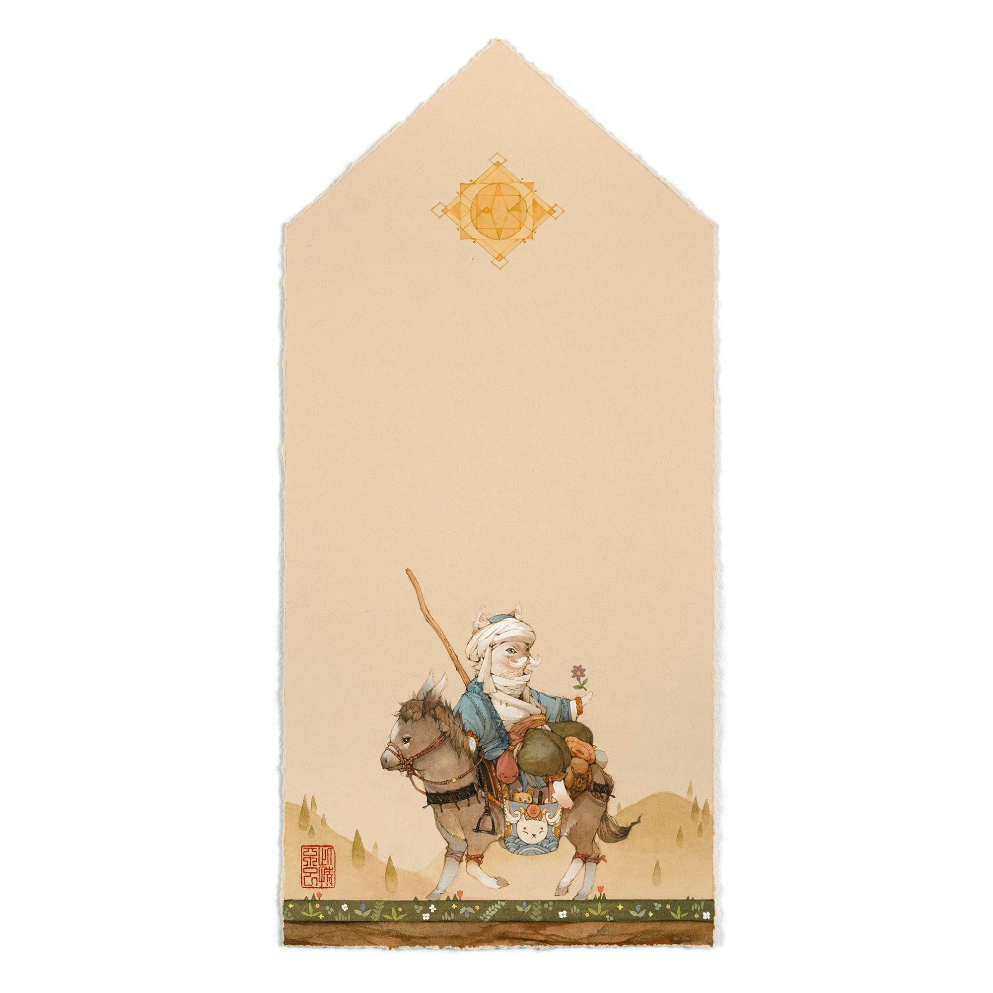 Karzelek monks travelling through the east to spread the holy word; the Ixian gate opens; adventurers, creatures and familiars make their way to distant lands. A wise cat rides a donkey helping all those he comes across or playing tricks on them.