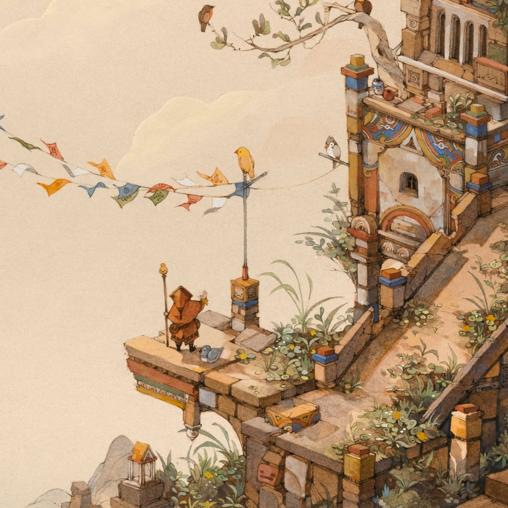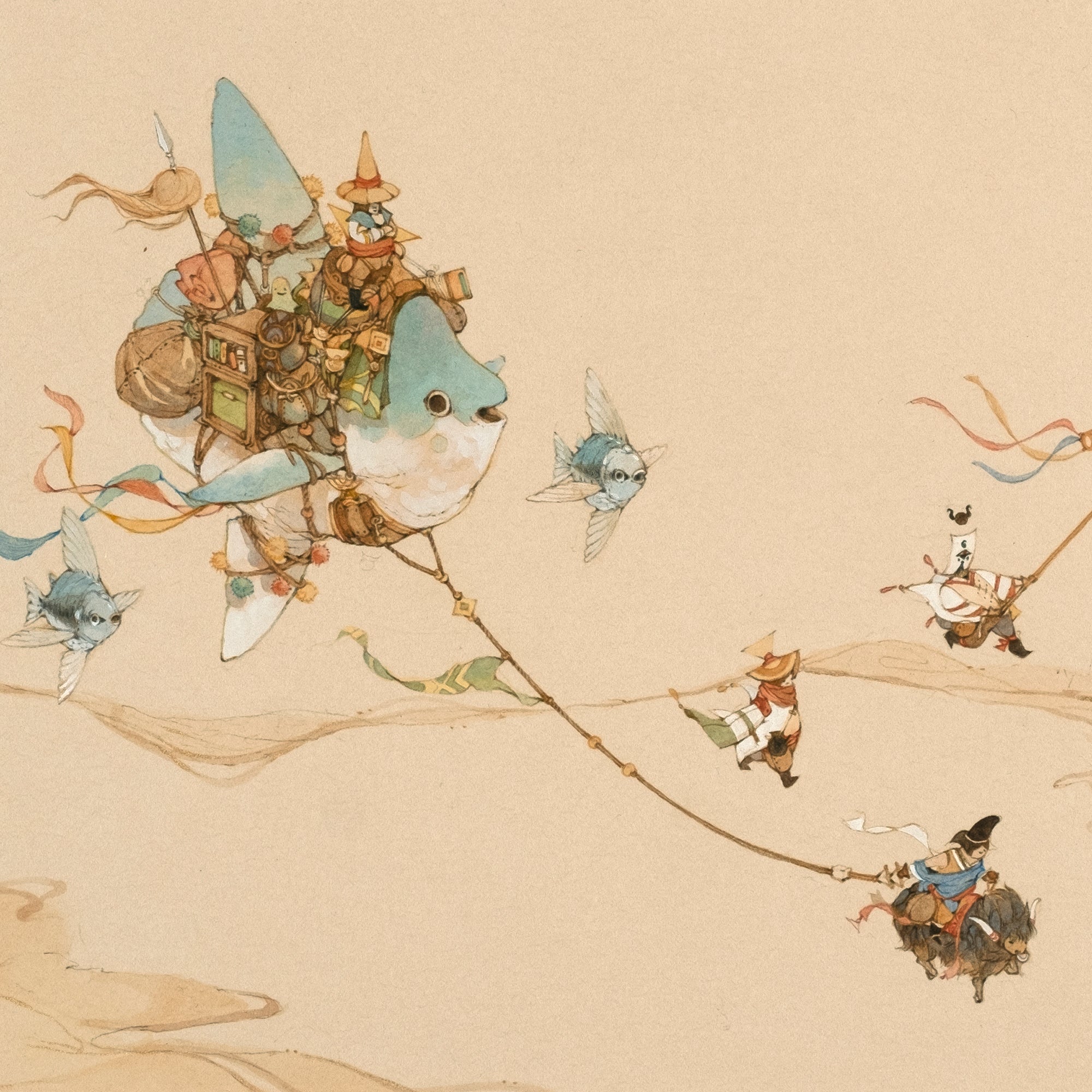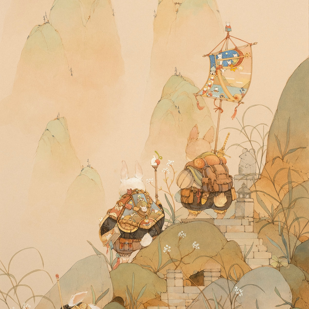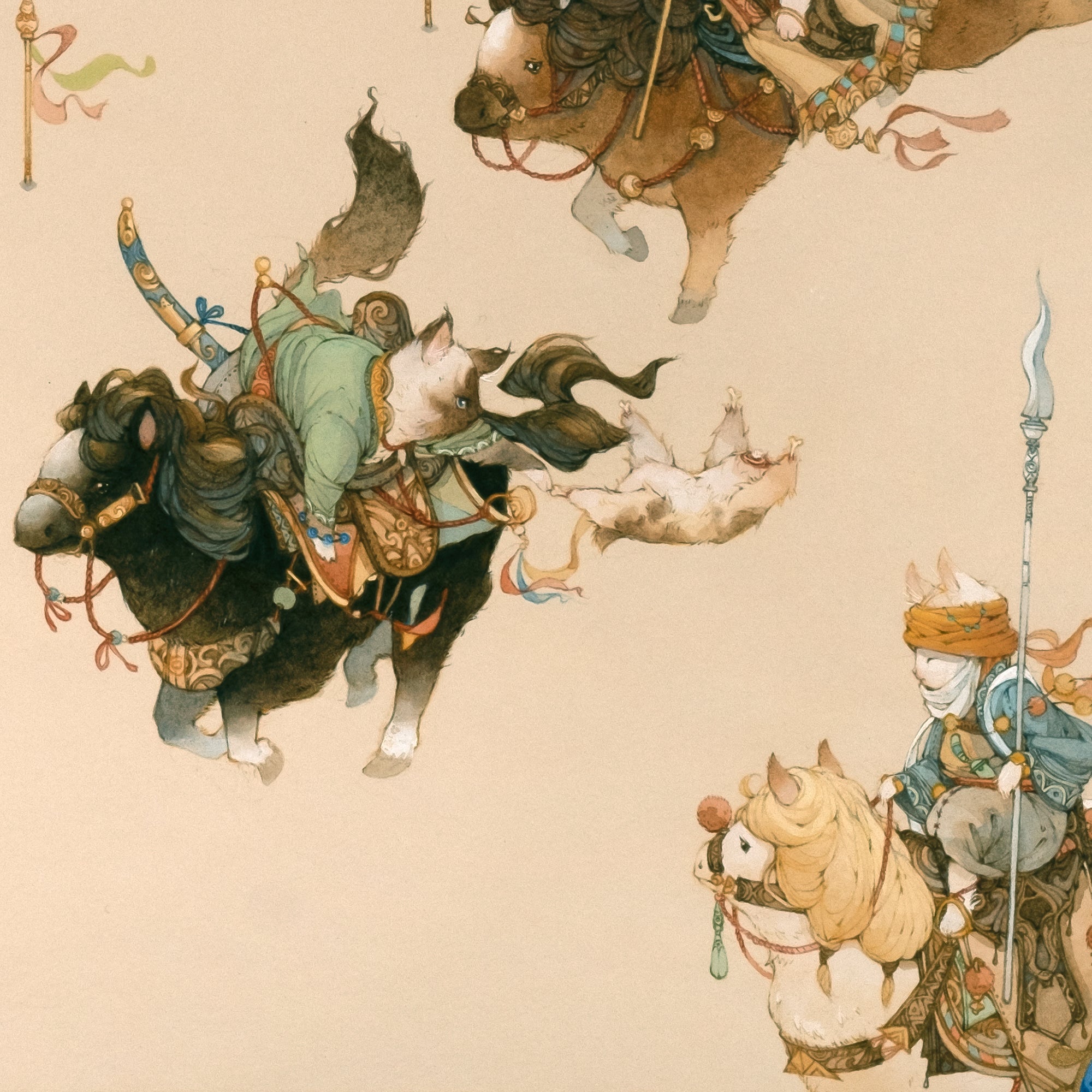 Karzelek monks travelling through the east to spread the holy word; the Ixian gate opens; adventurers, creatures and familiars make their way to distant lands. A wise cat rides a donkey helping all those he comes across or playing tricks on them.