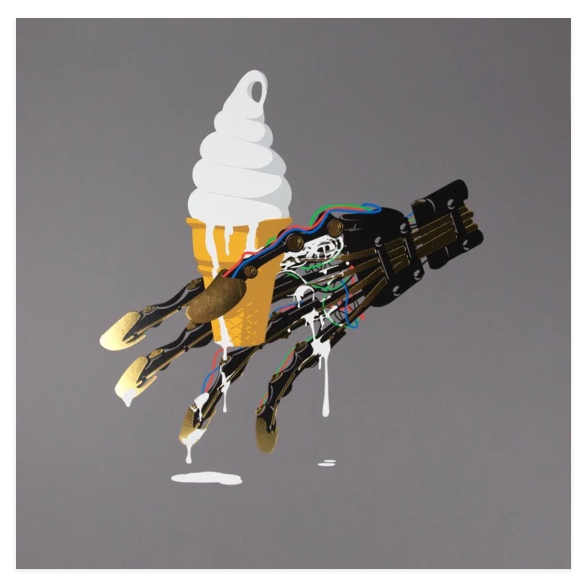 Print type: signed limited edition serigraph print with matte fluorescent and high gloss black ink, and gold foil stamp