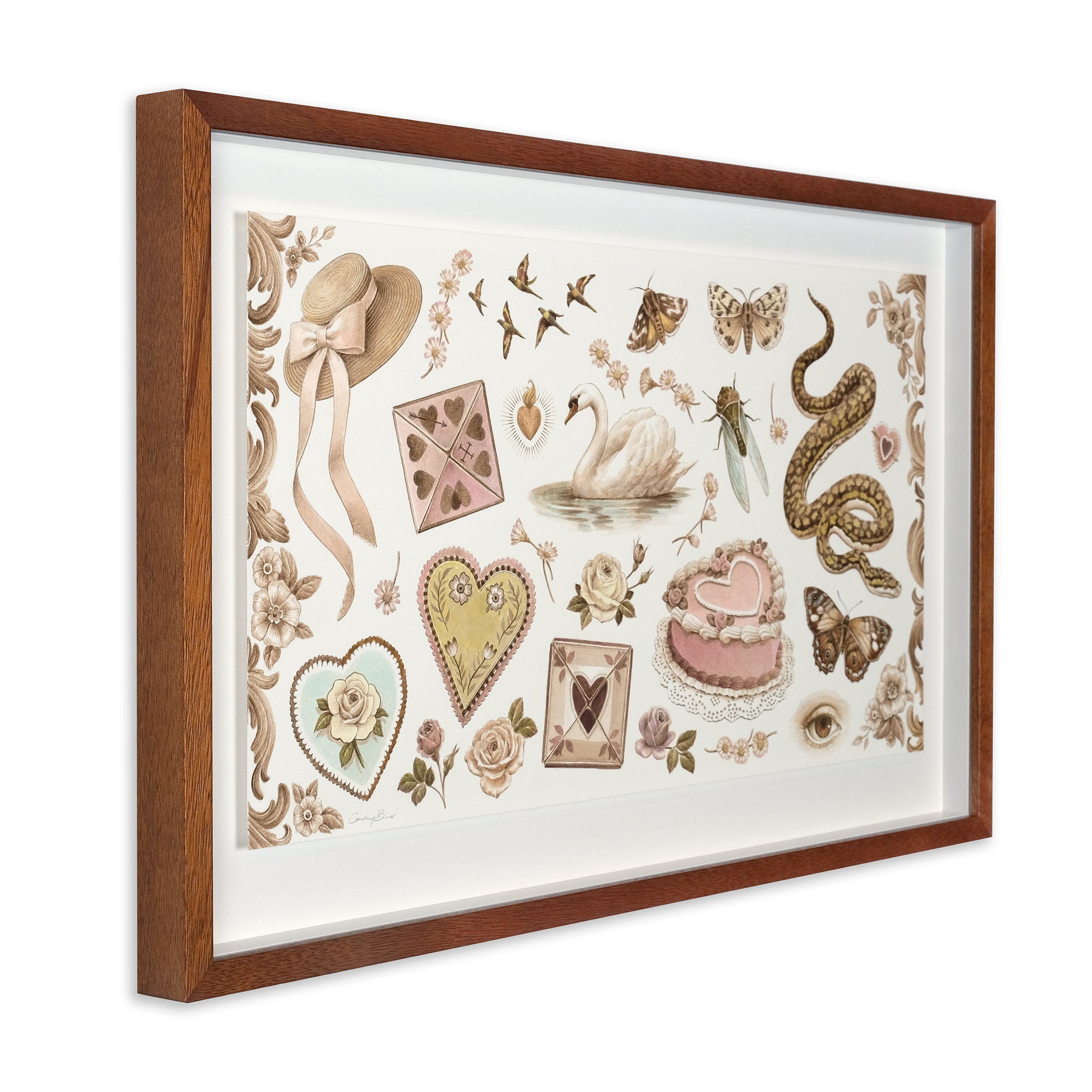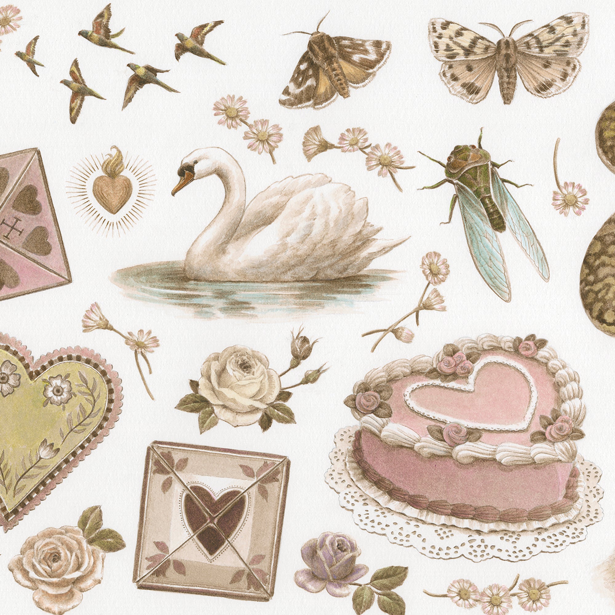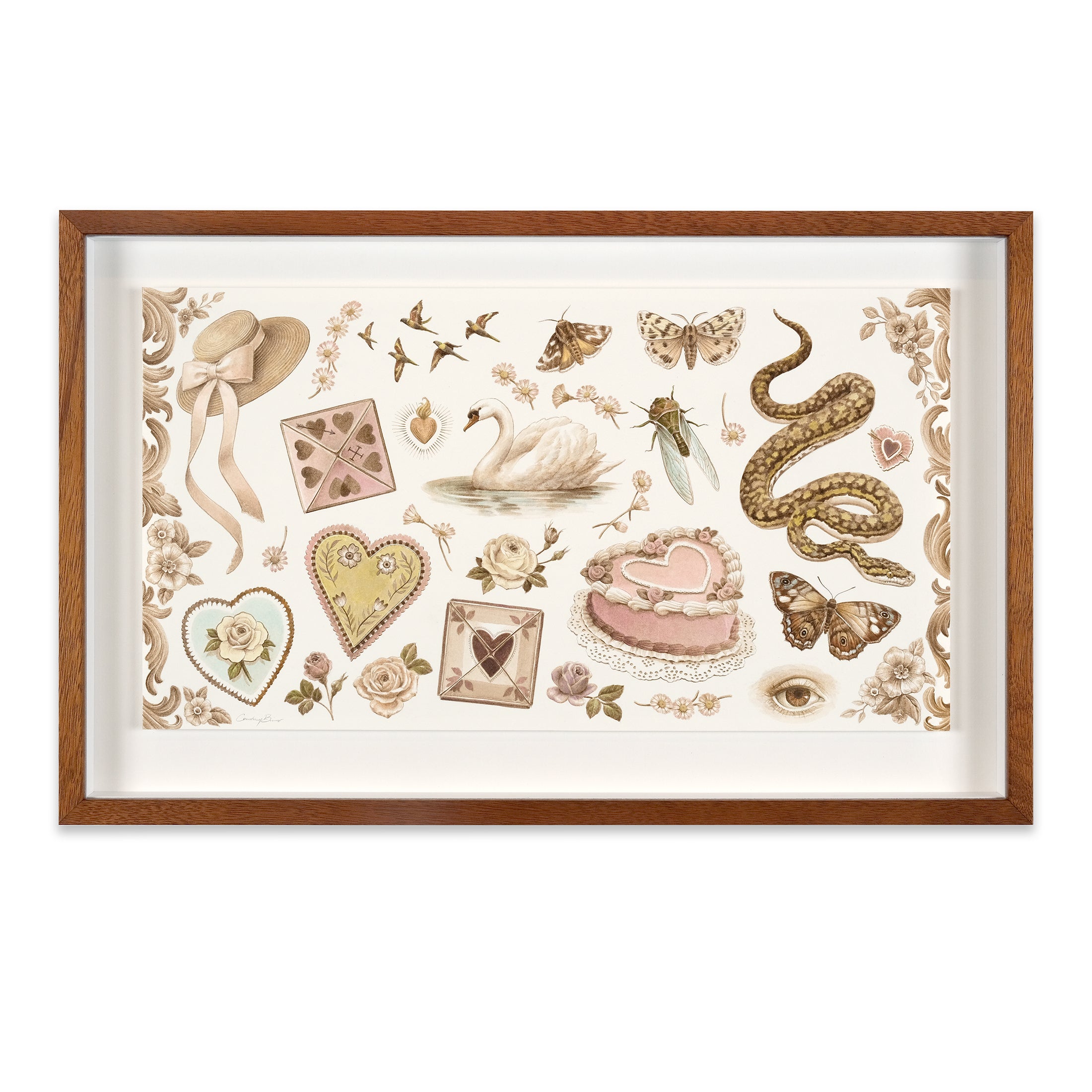 Courtney grew up in the outskirts of Brisbane collecting dead beetles, dressing up as Ursula from The Little Mermaid and drawing pink unicorns and prehistoric birds. She graduated with a degree in interior design from Brisbane's Queensland University of Technology before becoming a full-time illustrator in 2008. Since then she has had numerous solo shows across Australia and the US and collaborated with national and international brands. Courtney’s work explores her curiosity with the natural world, specifically the interplay between prey and predator through adaptation and metamorphosis. Behind the ornamental and ethereal charm of flowers, animals and female figures lies the cunning and unsettling underbelly of nature. She depicts scenes where animals become entangled within weaving hair and vines, nesting in skeletal remnants that hint at humanity’s impermanence.