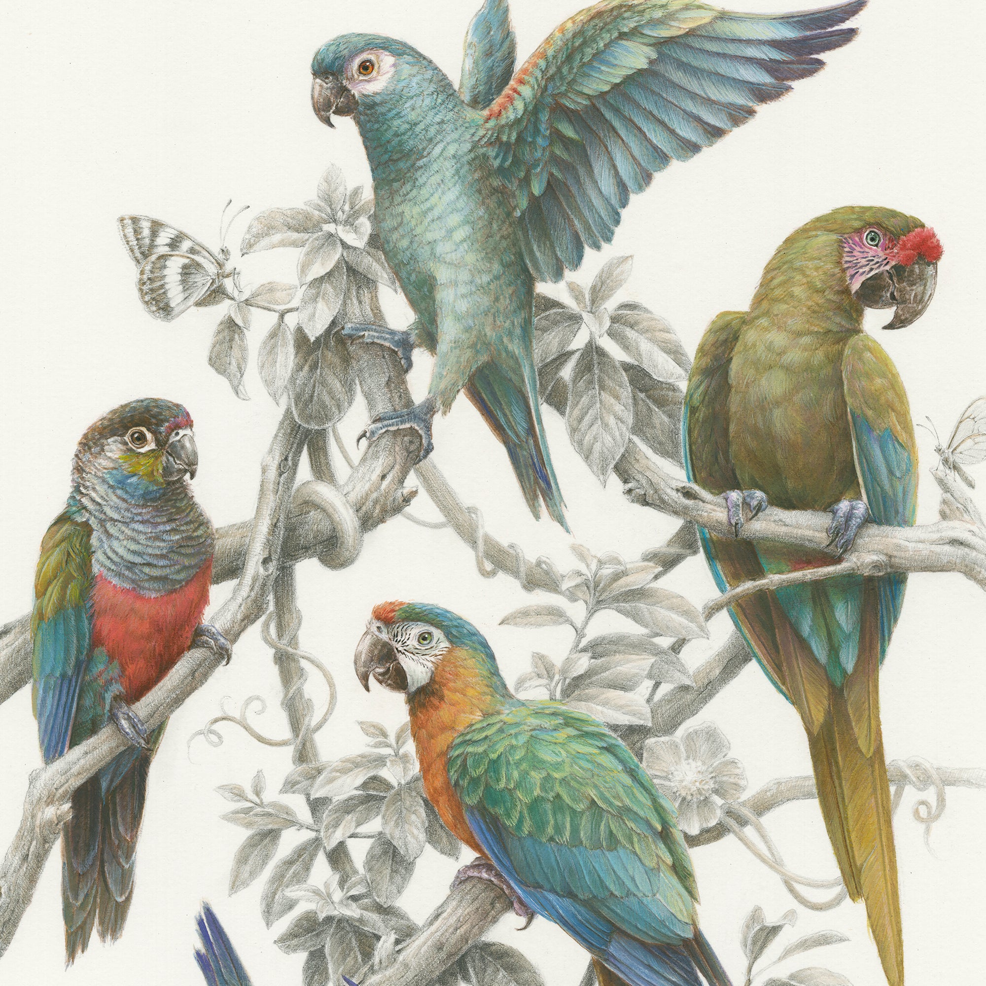 Magical realism is a theme I have always been drawn to. Taking inspiration from science fiction, mythology and folktales, 80s fantasy films, and natural history illustration, my work depicts detailed imaginary worlds that are connected to something that already exists and that we are familiar with. They are inhabited by creatures both local and exotic that engage with the viewer in a playful way, inviting one to create their own narrative.