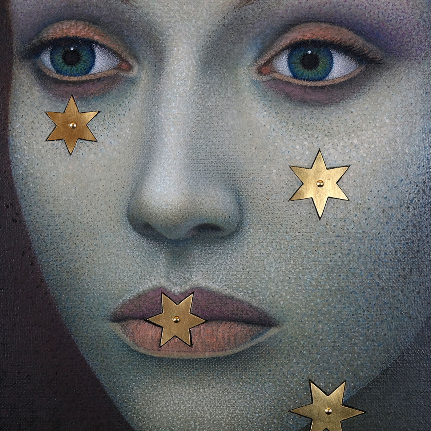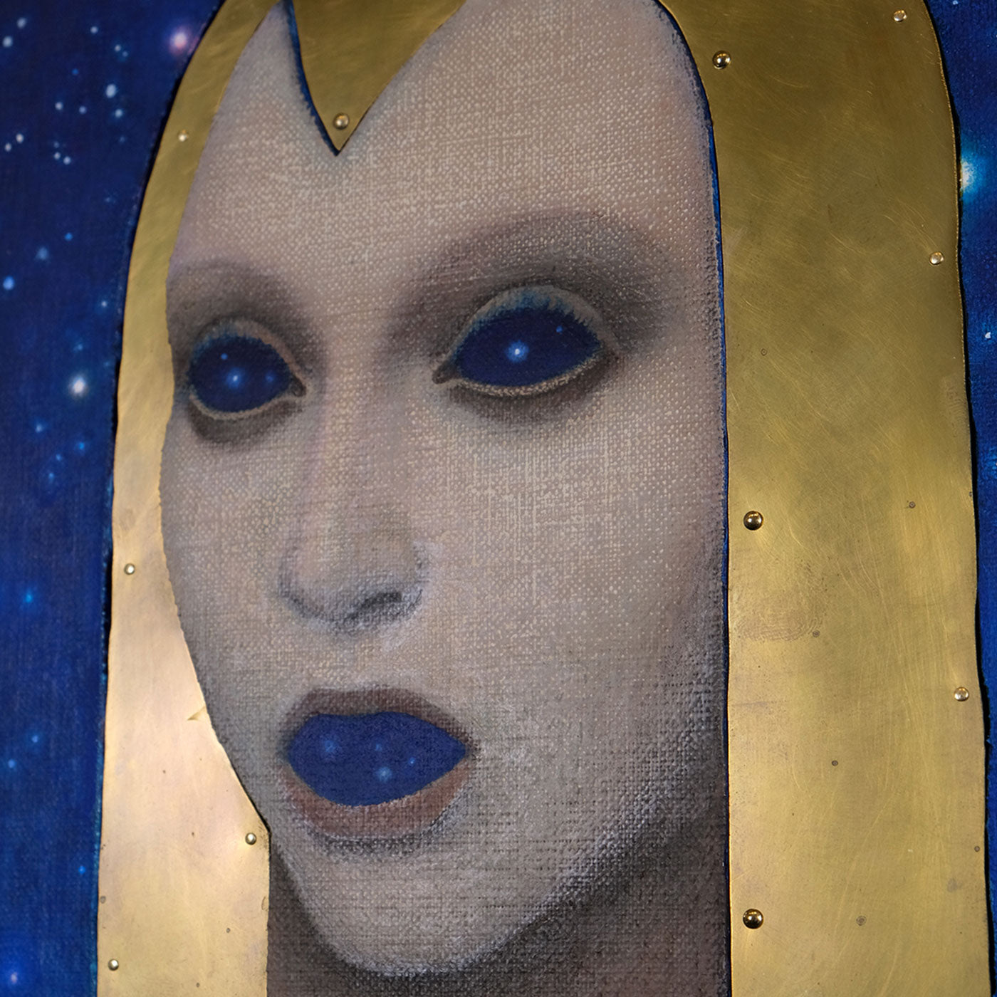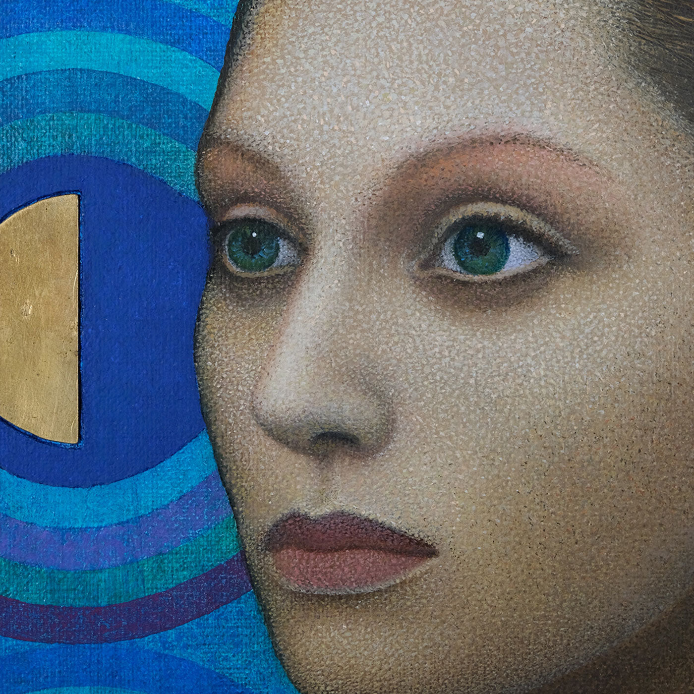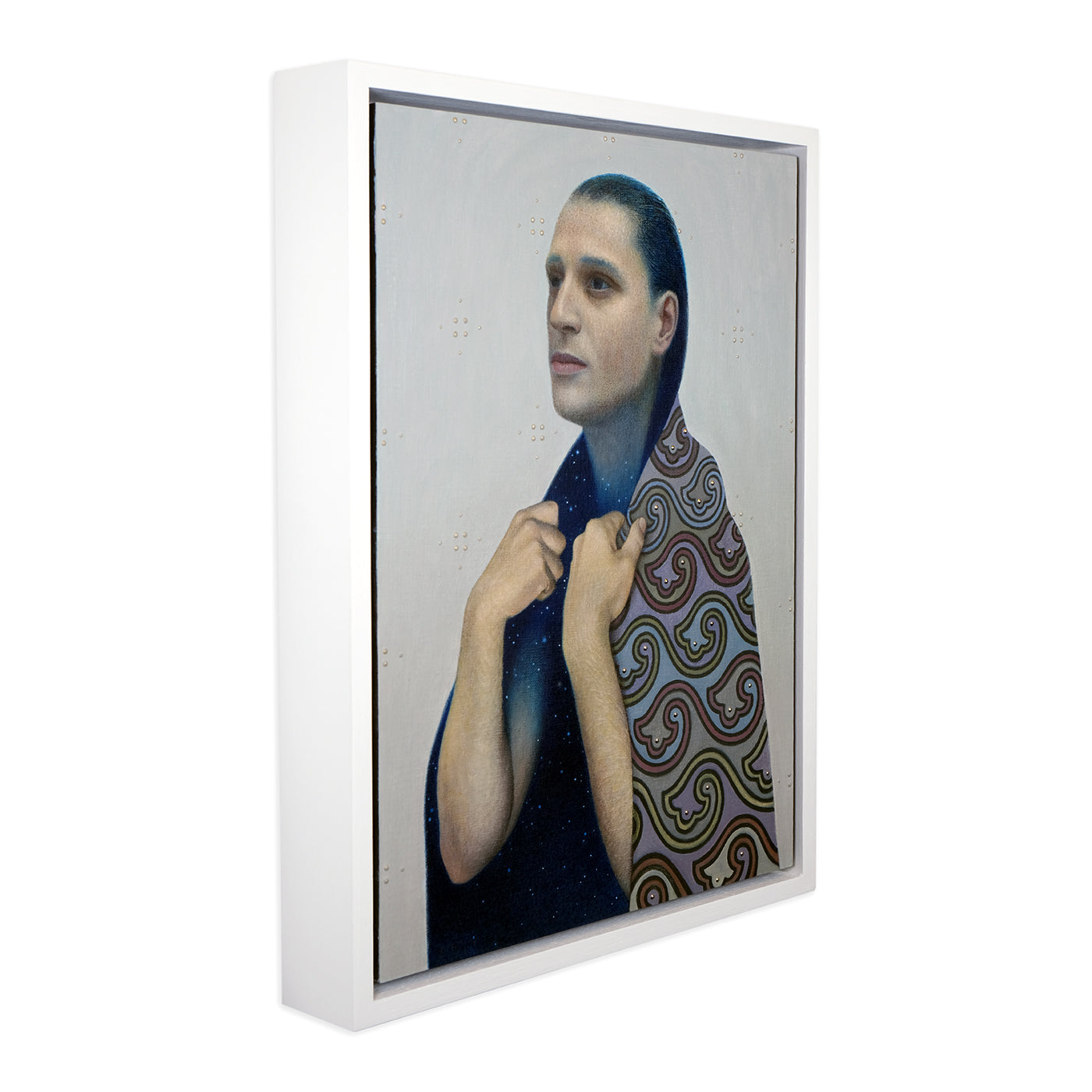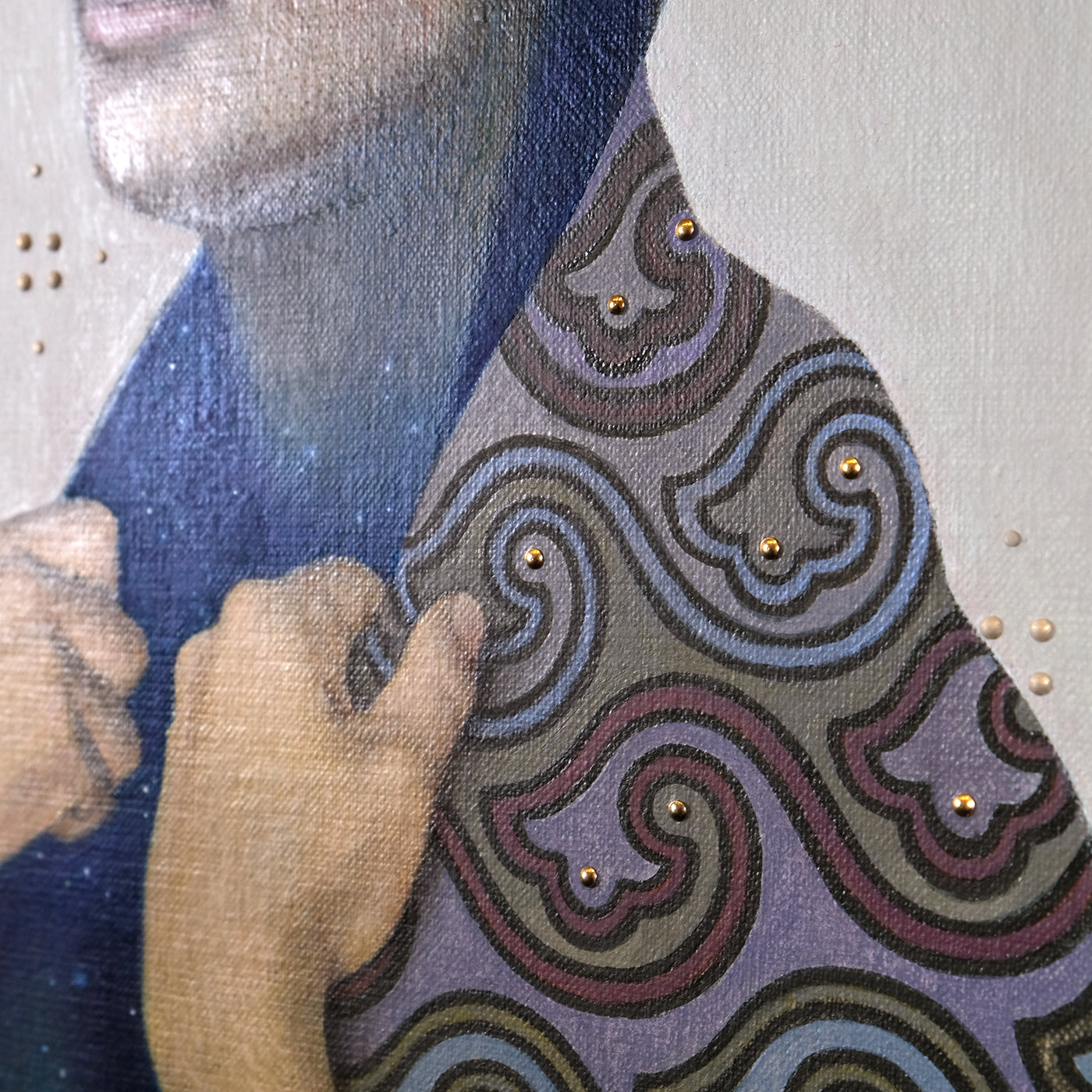 From an early age he's been captivated by the mythology and folklore of the Highlands and Islands and many of these tales relate to anthropomorphic deities within the environment. As a result, much of his work combines portraiture with pattern and symbols such as mountains, clouds and birds, and alludes to themes of ideology and transcendence.