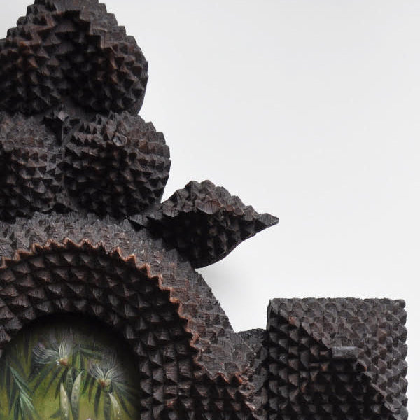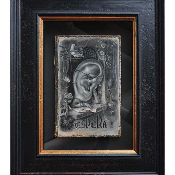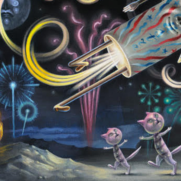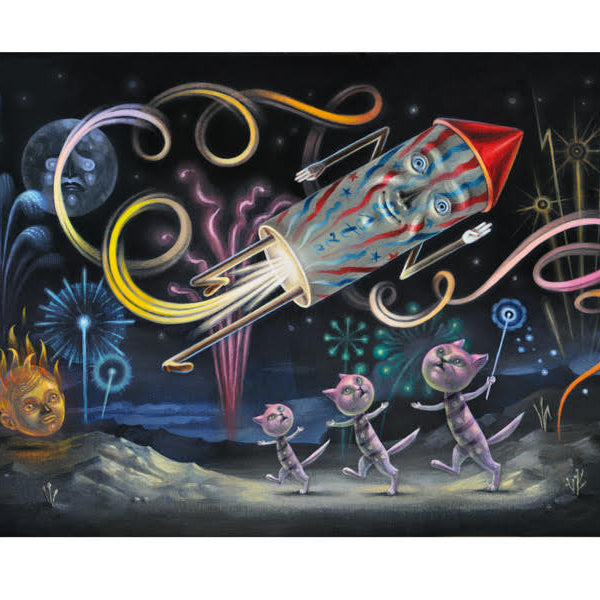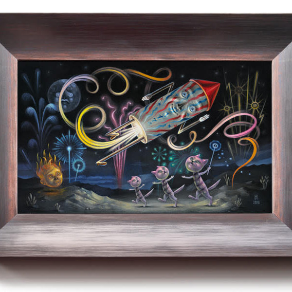 Femke's show title, Fernweh, comes from German and means a longing for the unknown or not wanting to go home. There are three original works for this exhibition with three different stories. One is a painted book cover called A Espera ('the waiting'), a romantic/melancholic setting with a twist, inspired by a 'lady waving from a window' old black & white postcard from my collection. Then there are two panels. One is a fireworks inspired piece called Freestyler, and one larger panel in a beautiful handmade tramp art frame called Les Ambianceurs, inspired by the dandy, like 'sapeurs'.
