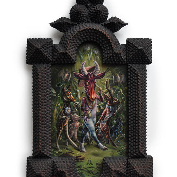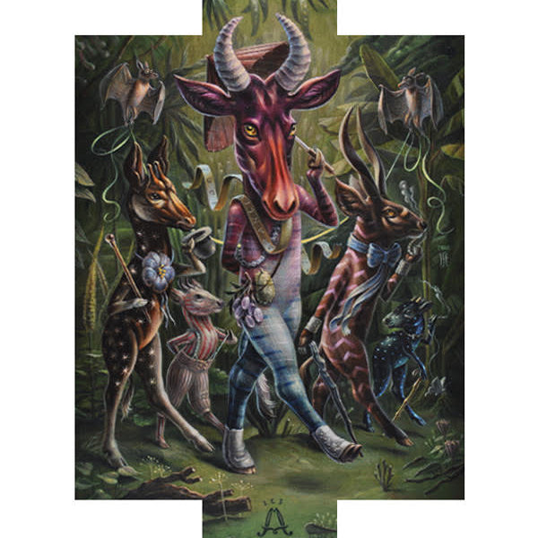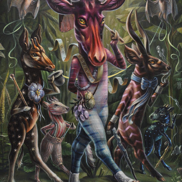Femke Hiemstra is a Dutch painter. Though her career began as an illustrator, her works became so elaborate that she then turned her hand to fine art. Within her paintings she portrays a Grimm-esque world, where highly detailed animal characters are set against dark, surreal settings.