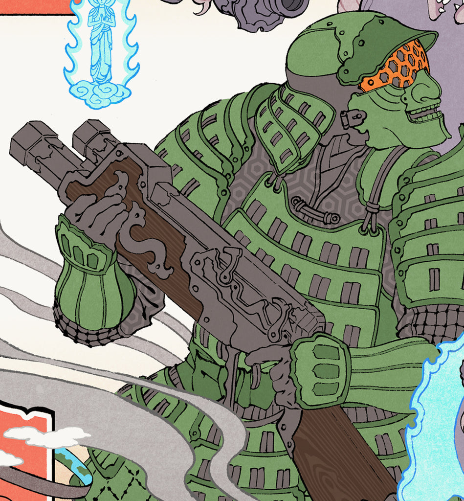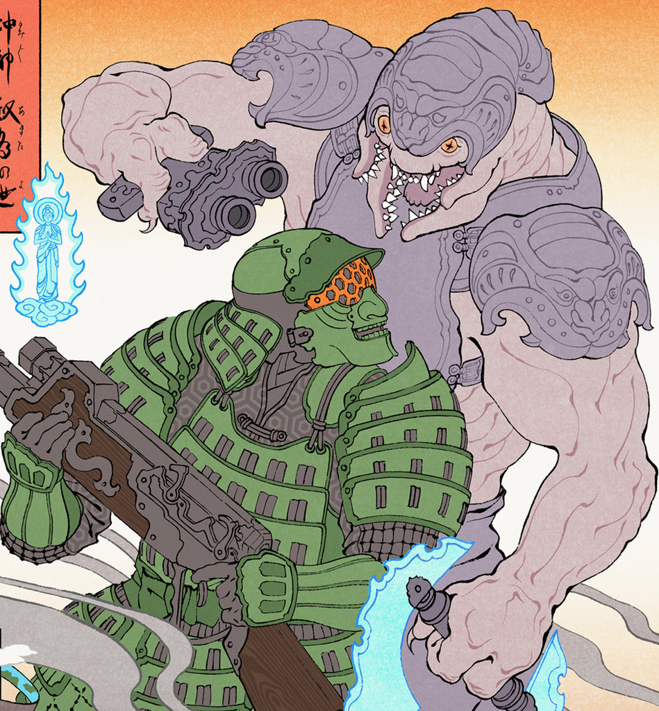 'For years people have been asking me to adapt this series into an Ukiyo-e style image. At first I was too intimidated to try. Almost nothing in the this game lends itself to easy adaptation into an 1800s Japanese style. But as time passed, I grew more comfortable interpreting sci-fi material in this art form, and I finally felt ready to to give it a try. I am pleased with the results!