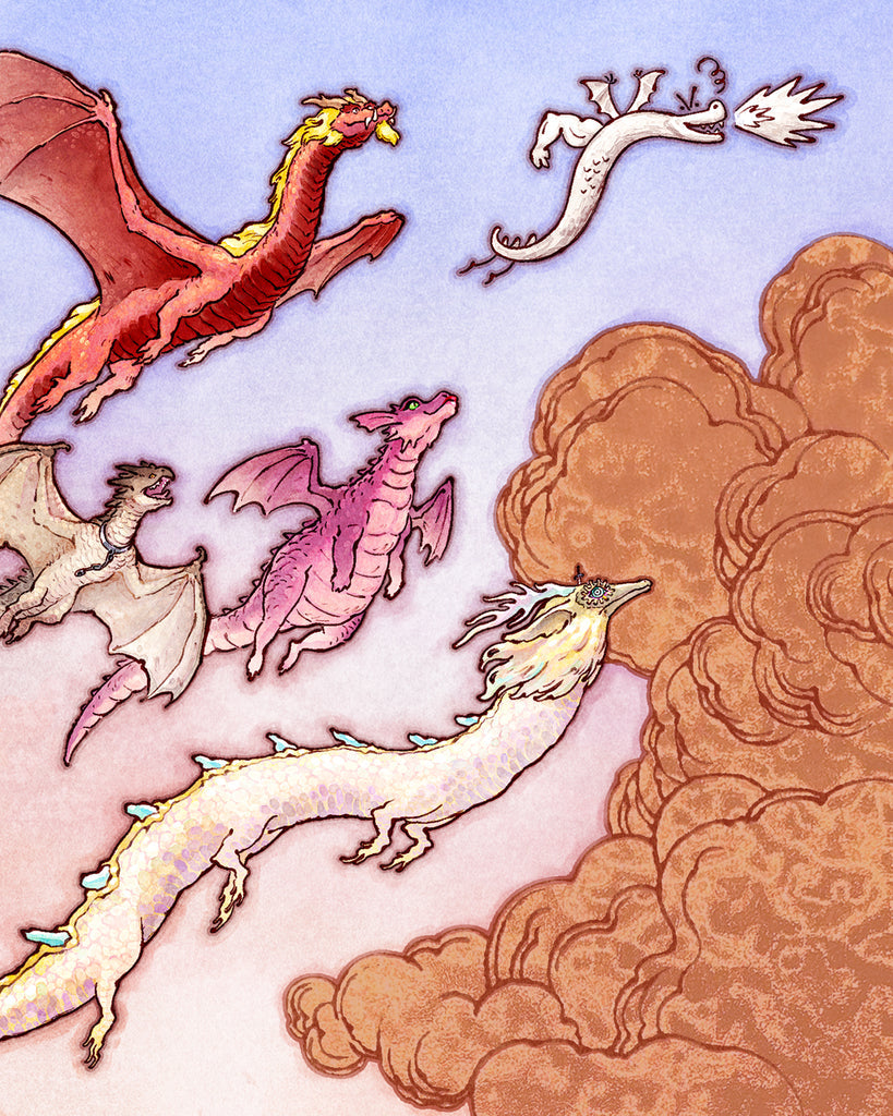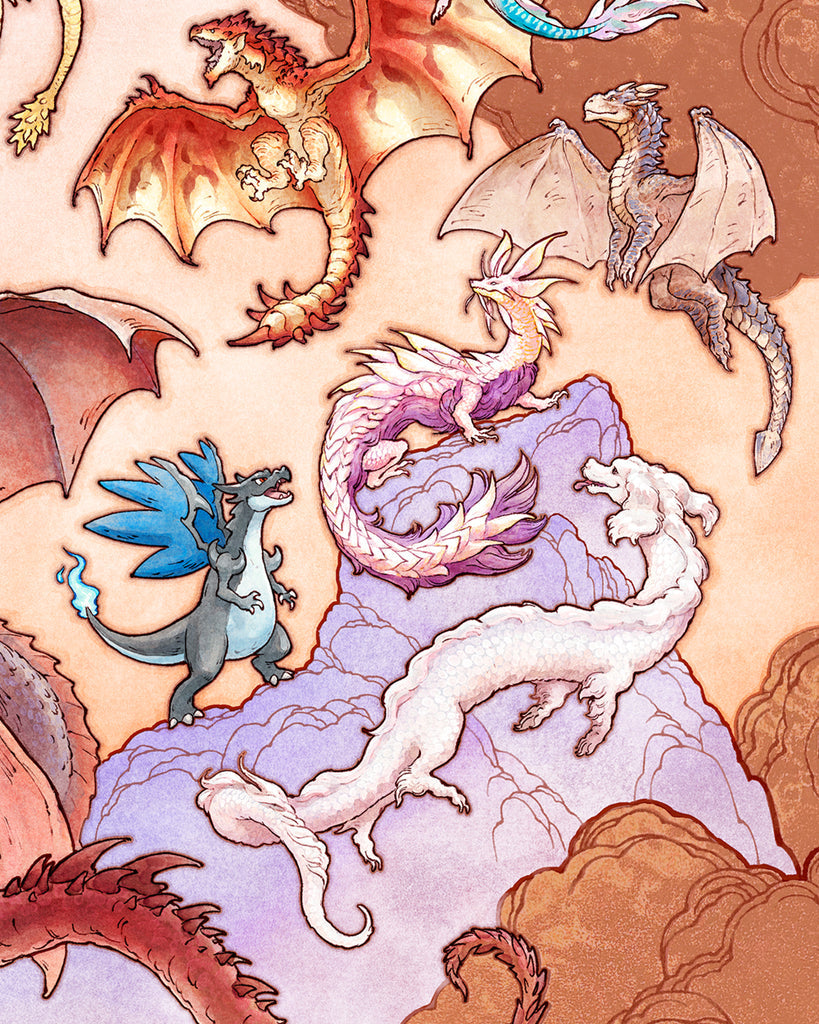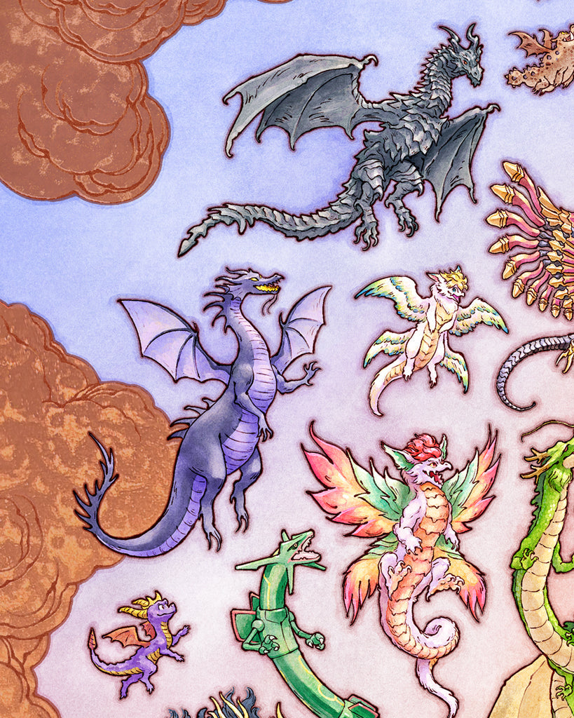 I wanted to create an art print that celebrates all the wonderful dragons from popular books, movies and games. I know I wasn't able to fit everyone's favorites into this image, but I hope there are enough here to warm your heart.
