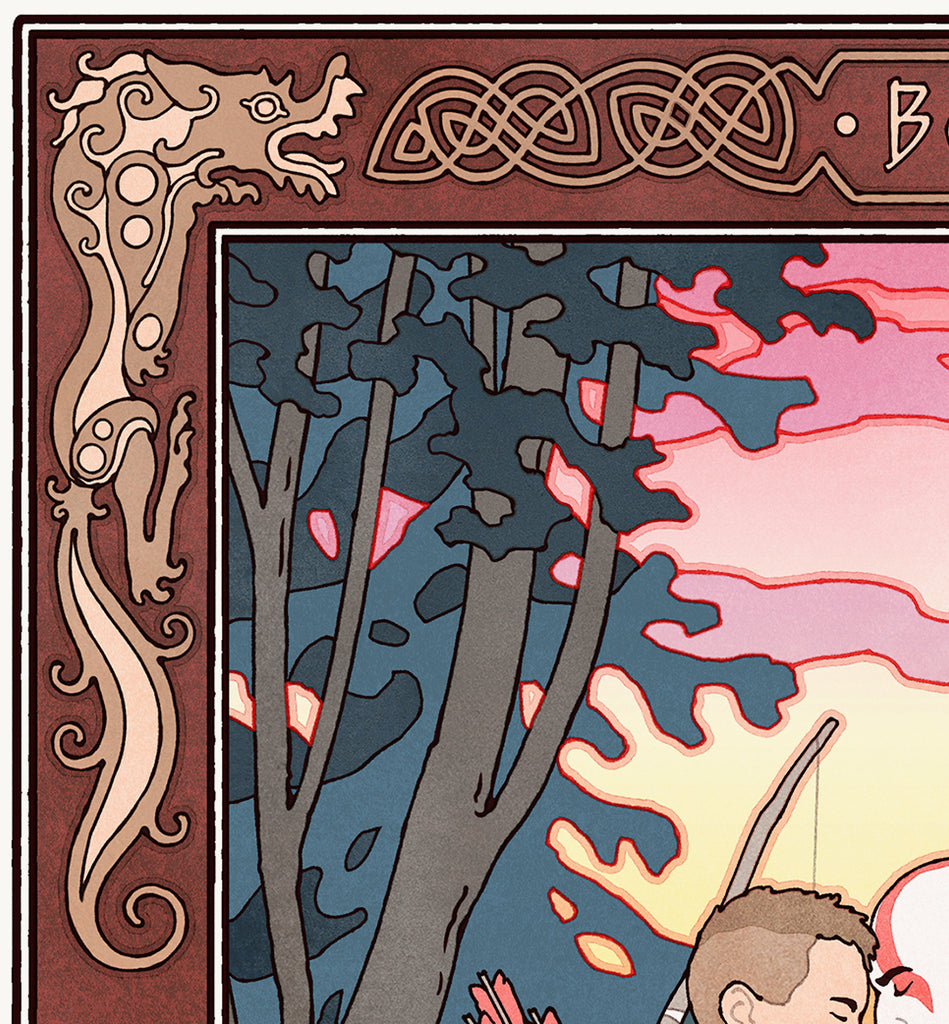 I usually work in a Japanese Ukiyo-e aesthetic, but I also occasionally dabble in other styles. This piece is inspired by the great Russian designer, Ivan Bilibin. Bilibin was a genius at depicting epic scenes from folklore, always adding his unique Art Nouveau and Arts and Crafts sensibilities.