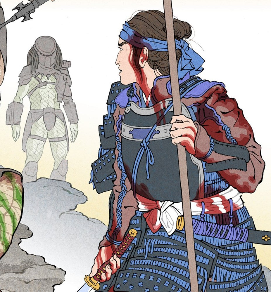 I normally try to adapt every element to match an 1800s Ukiyo-e aesthetic. In this case, however, I decided not to change the off-world hunters' design. I think keeping them this way better supports the narrative that they are strange, alien visitors who don't belong in our world.