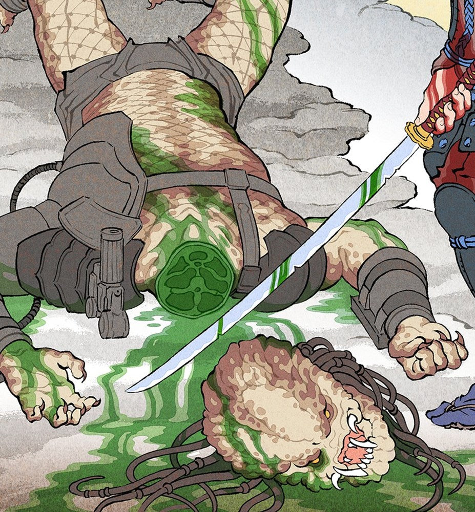 Japan has a rich history of depicting the horrific and the macabre. Some of my favorite pre-modern gothic artists include Hokusai, Kuniyoshi, Yoshitoshi and Kyosai. Because this tradition of frightening imagery already exists in abundance, it was very easy for me to adapt modern sci-fi horror into the Ukiyo-e style. I just had to follow in the footsteps of my art heroes!"