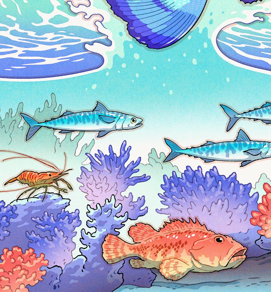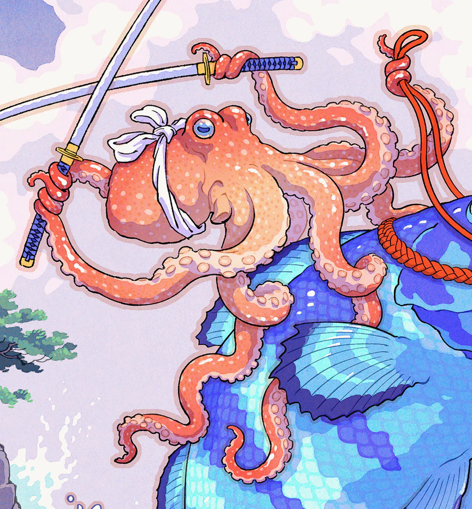 Meet Lord Takozaemon, the valiant octopus samurai who rides a swift blue fish through the Pearl Sea. With many blades and a watchful gaze, he defends his domain of coral castles.
