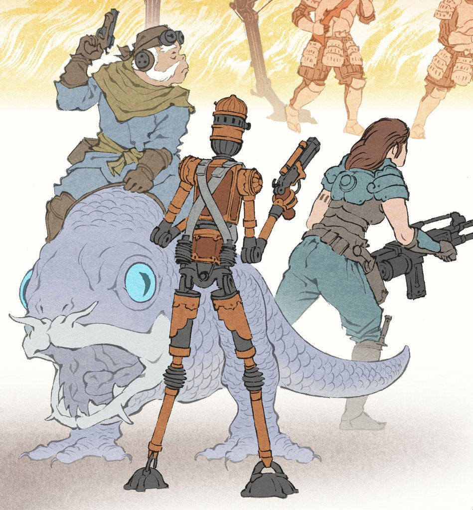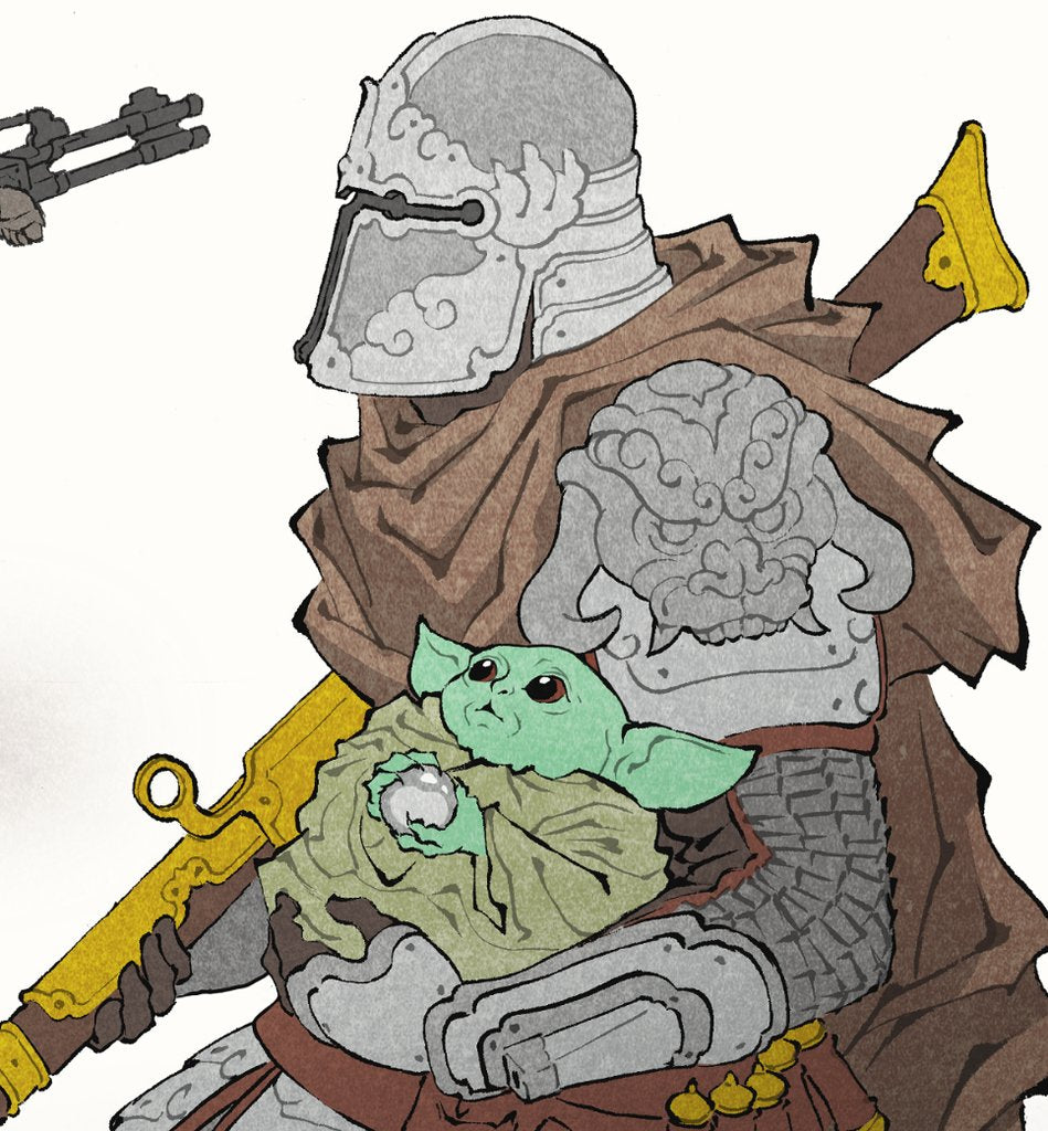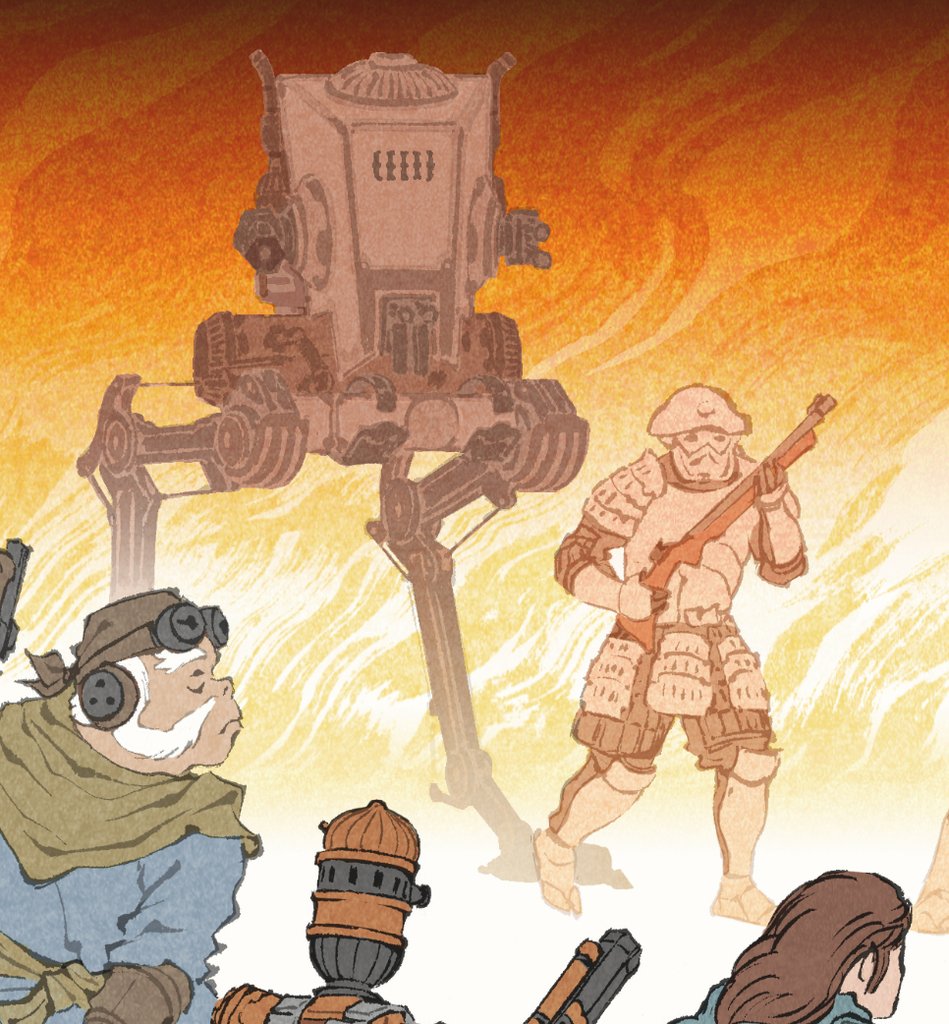 It's common knowledge that these stories were partly inspired by Japanese films and design. It only made sense that in returning these characters to an Ukiyo-e style, I also pay homage to another obvious source of inspiration: 'Lone Wolf and Cub'. It was also a lot of fun interpreting this sci-fi/fantasy world through the lens of Japanese steampunk, which isn't actually a thing, but I enjoy pretending it is.