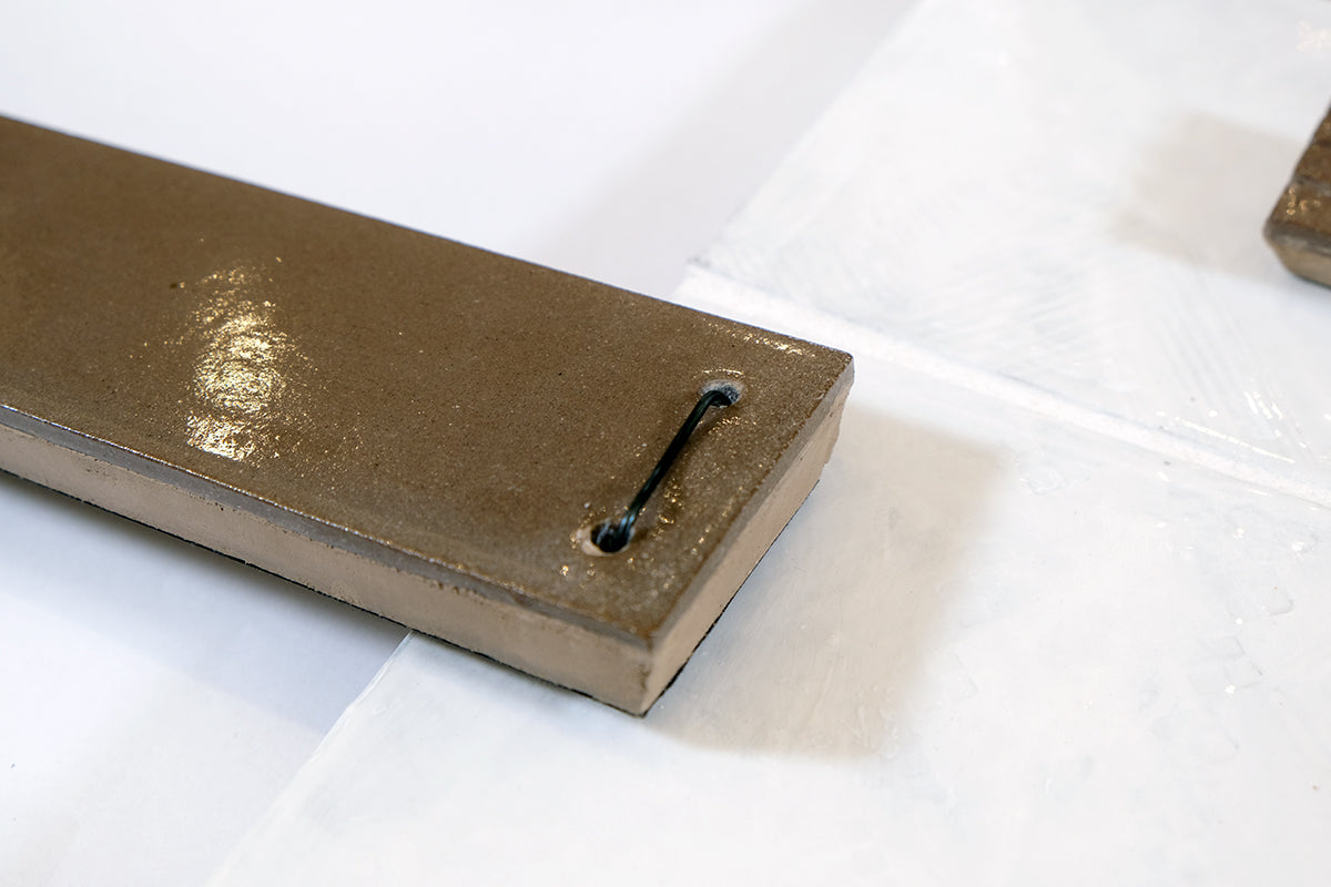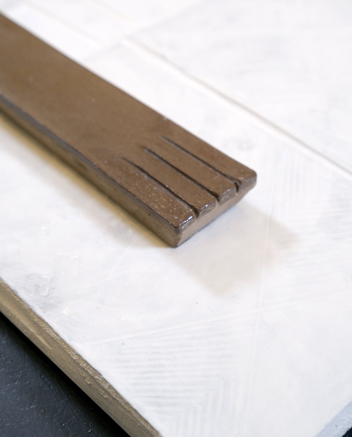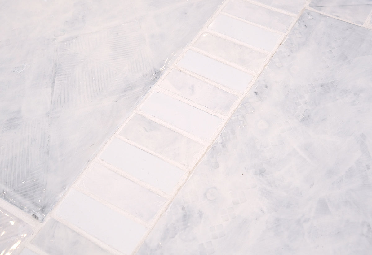 Medium- hand-made tiles mosaiced on timber panel. Glazed ceramic.