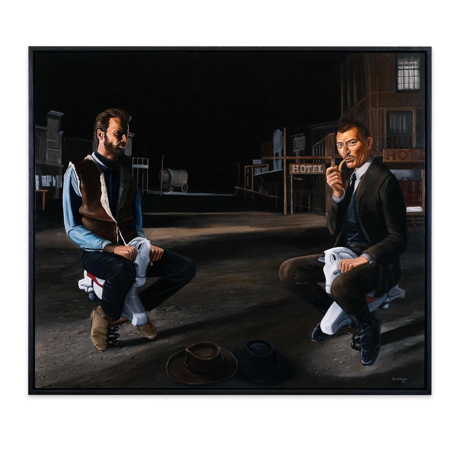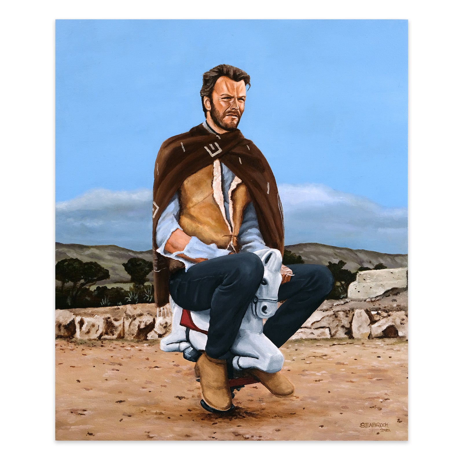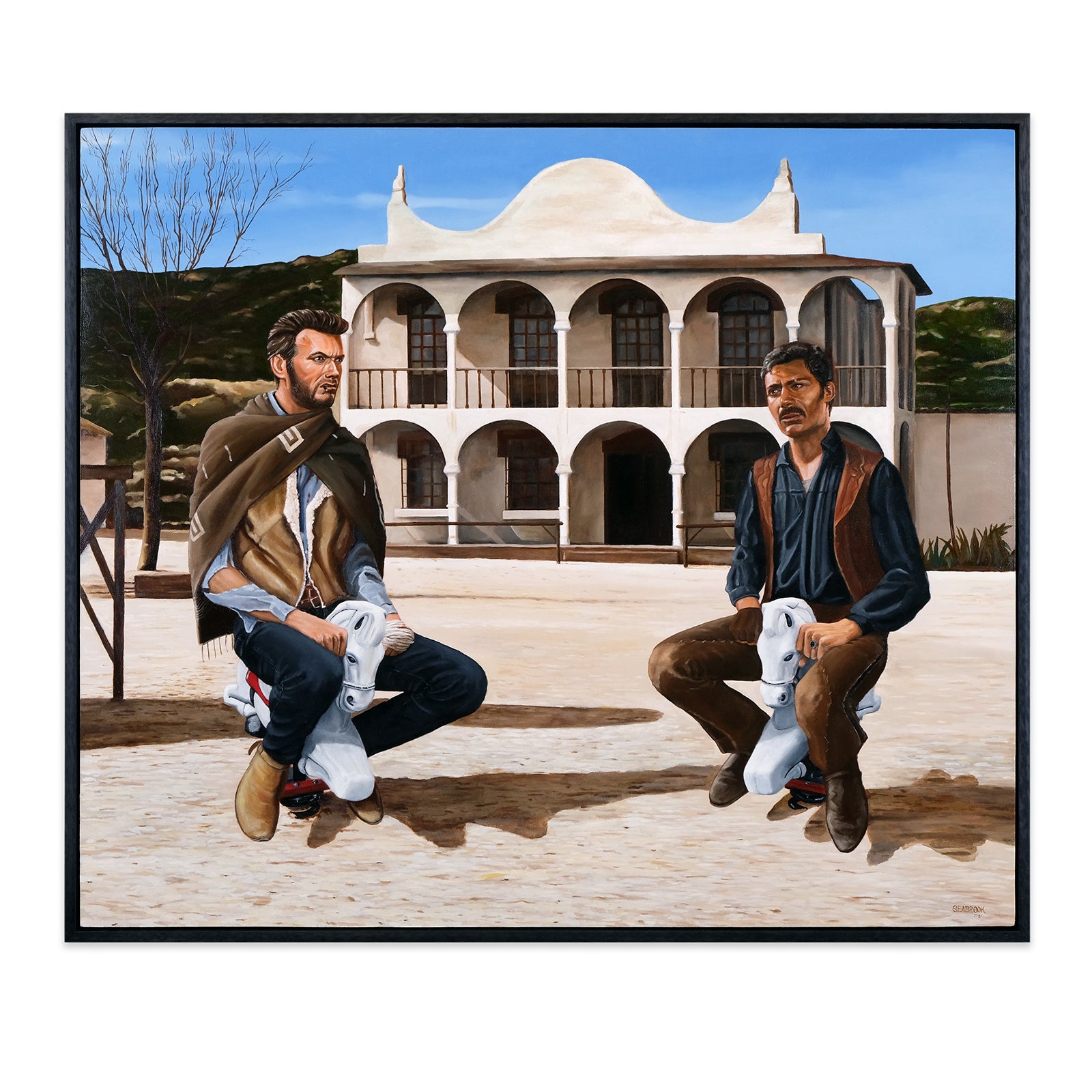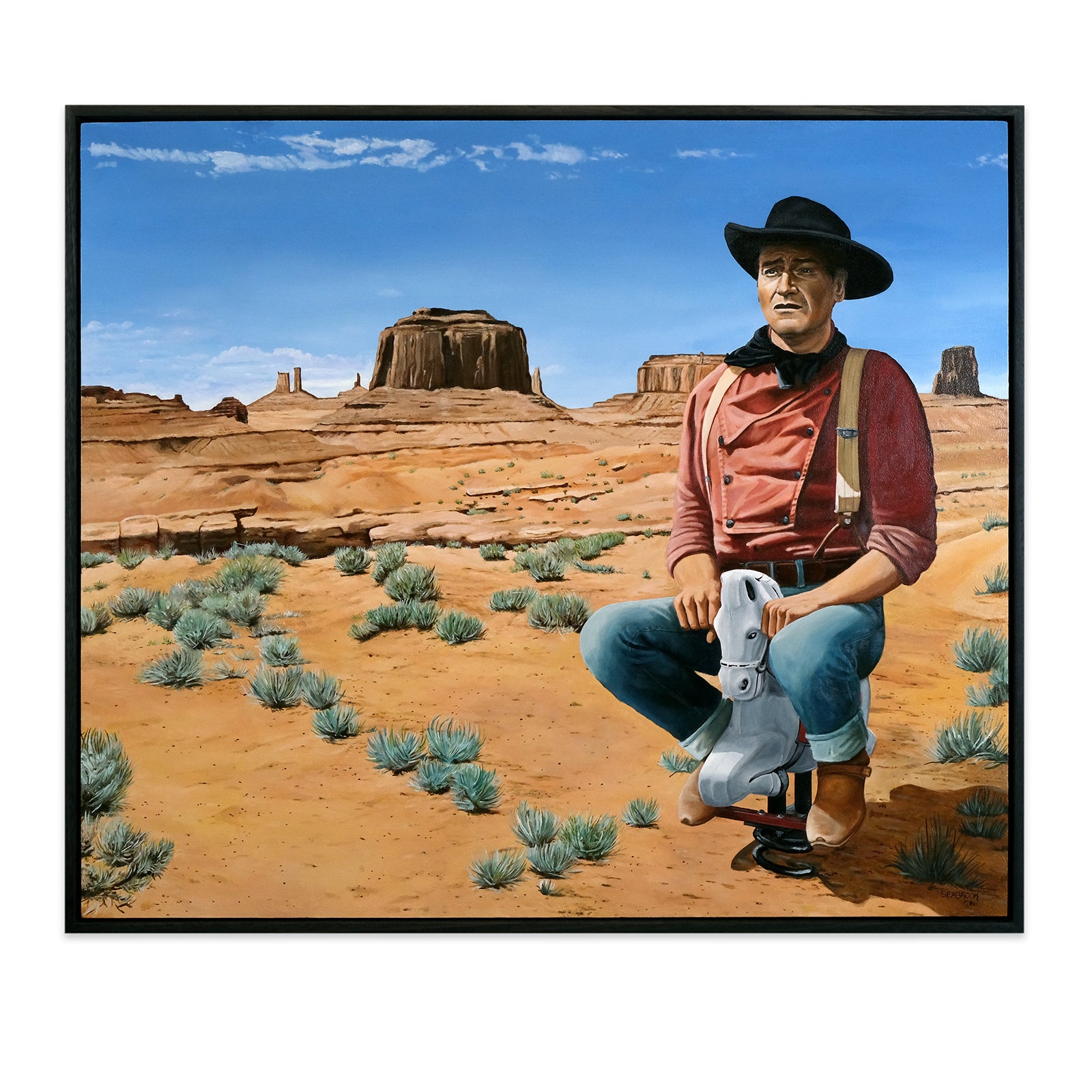 Ride on into the golden age of western movies. John Wayne in Technicolor. Whoa! Is that Clint Eastwood astride a playground pony, skewering the tough guy machismo? Or is it that how he chooses to relax? The iconography of the western ingrained itself in pop culture. Here the vistas and settings remain, but the stoic heroes portrayed in moments of repose. Behold a Pale Horsie is a series of oil paintings that invites you to join the Horsemen of the Apocalypse on a ride through Death Valley. (Can you hear Ennio Morricone?) Yeehaw!