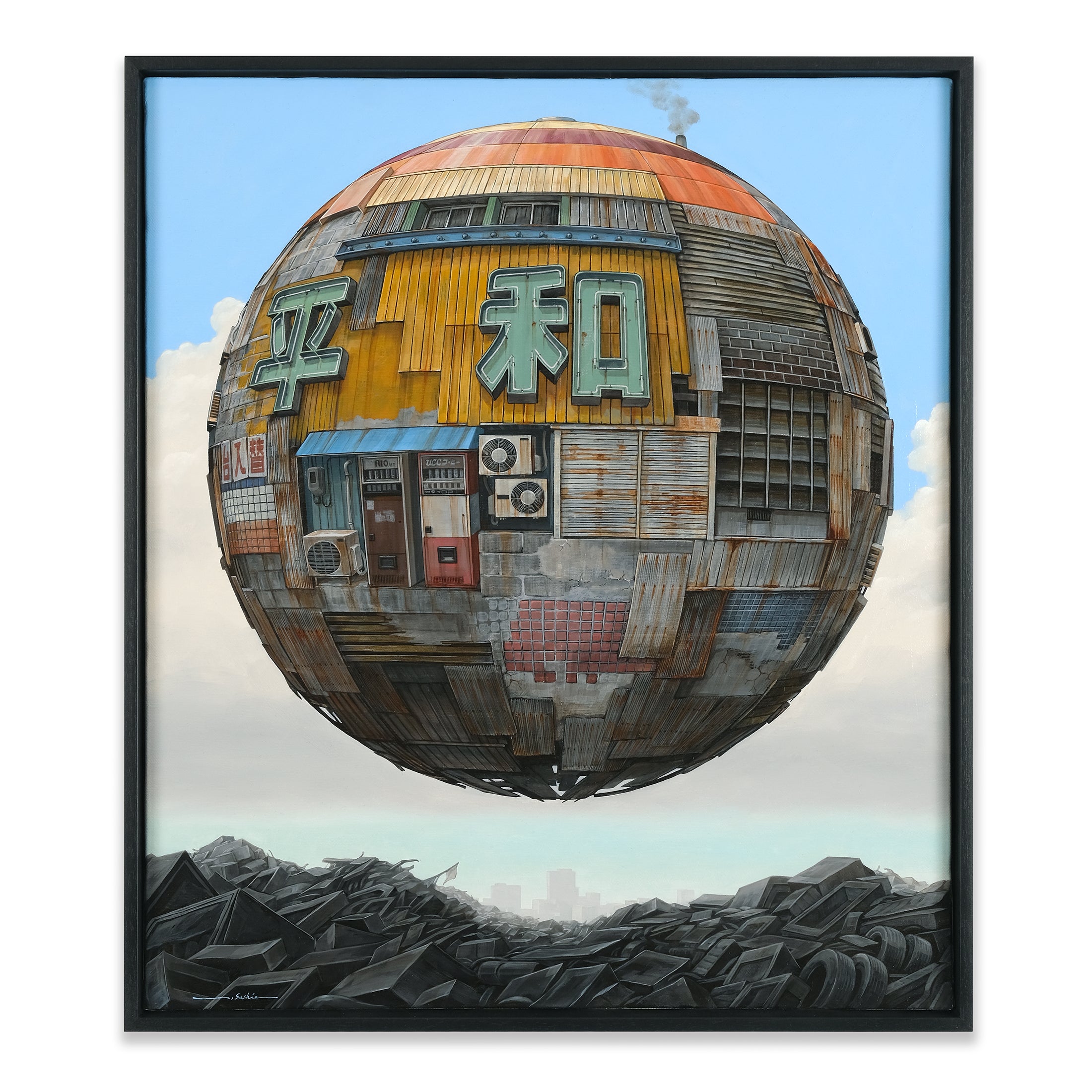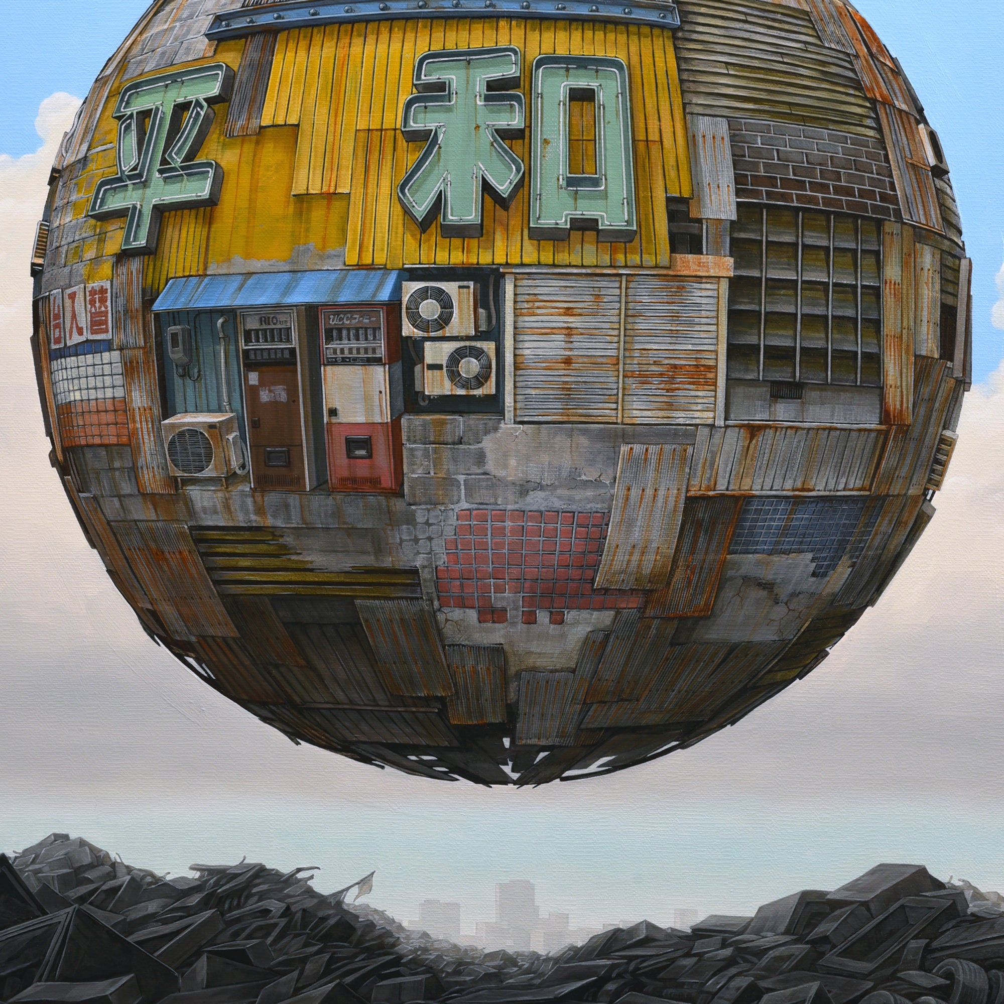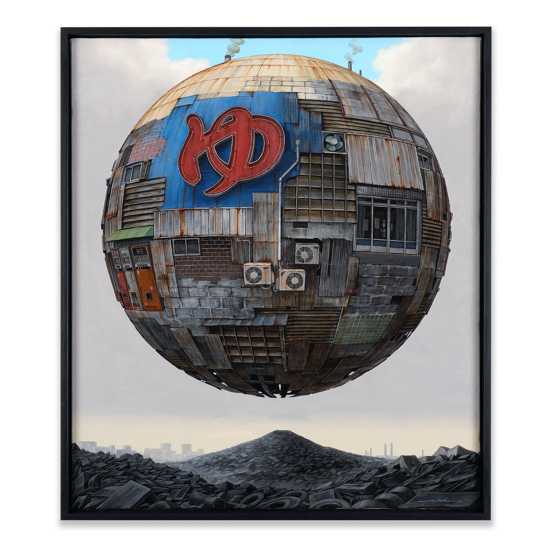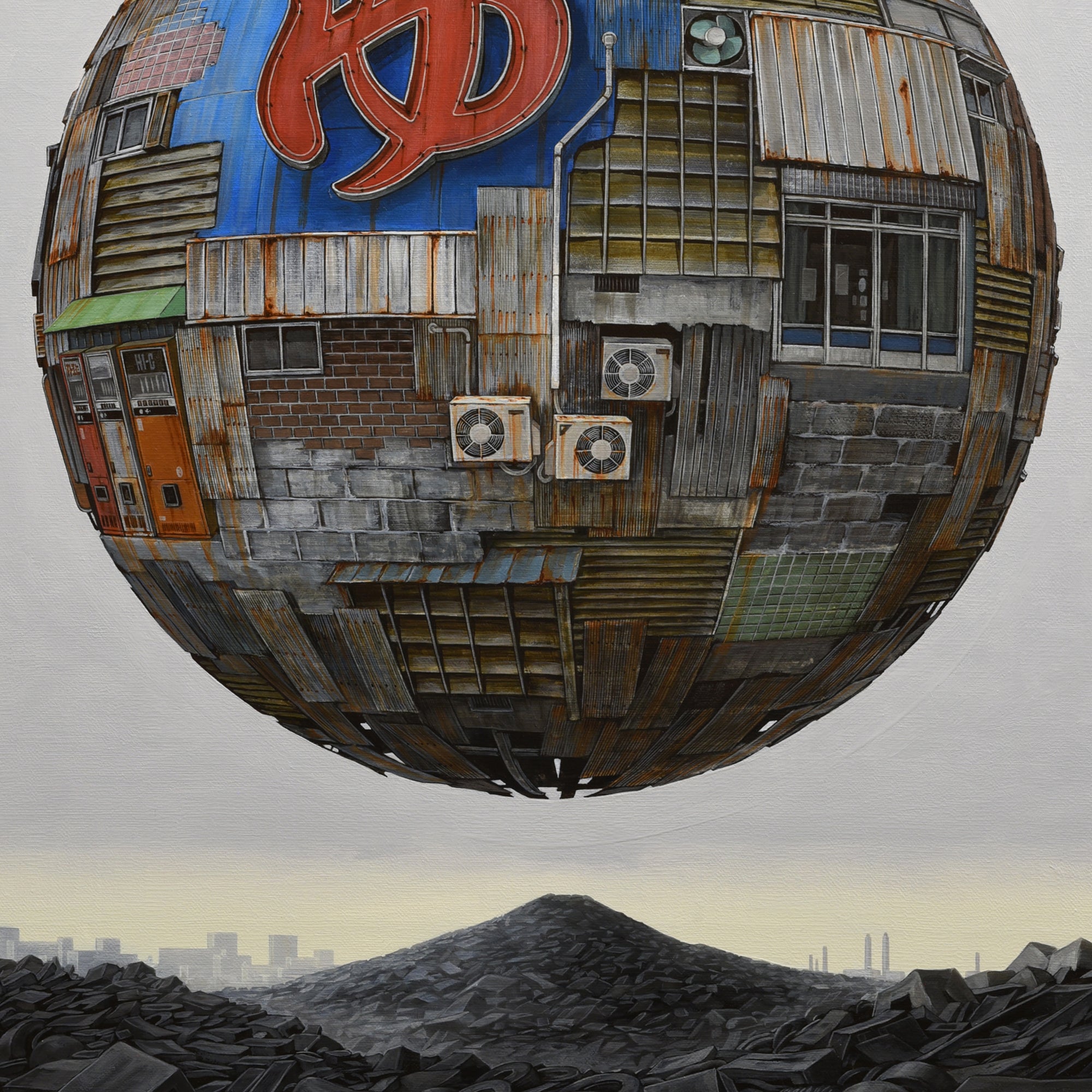 Sashie's home, Kanazawa is a miniature condensed version of the larger more populous cities in Japan. With a lifelong interest in model making and having grown up in a virtual diorama, Sashie's intricately detailed oil paintings depict a world where the common objects of modern industrialization take on often oppressive forms. These haunting vistas are often dominated by an orb, a substantial figure, made of an amalgamation of the remnants of human existence. The contrast between the detail and complexity of the orb and the surrounding environment impresses upon the viewer the co-existence of small microcosms within the larger outer world. Without showing preference to either world, Masakatsu Sashie paints two opposite worlds as equals with the intent of drawing the viewer into the space and having them reflect on society and its values.