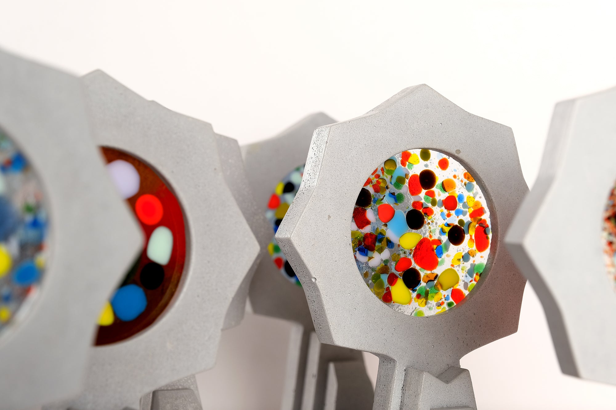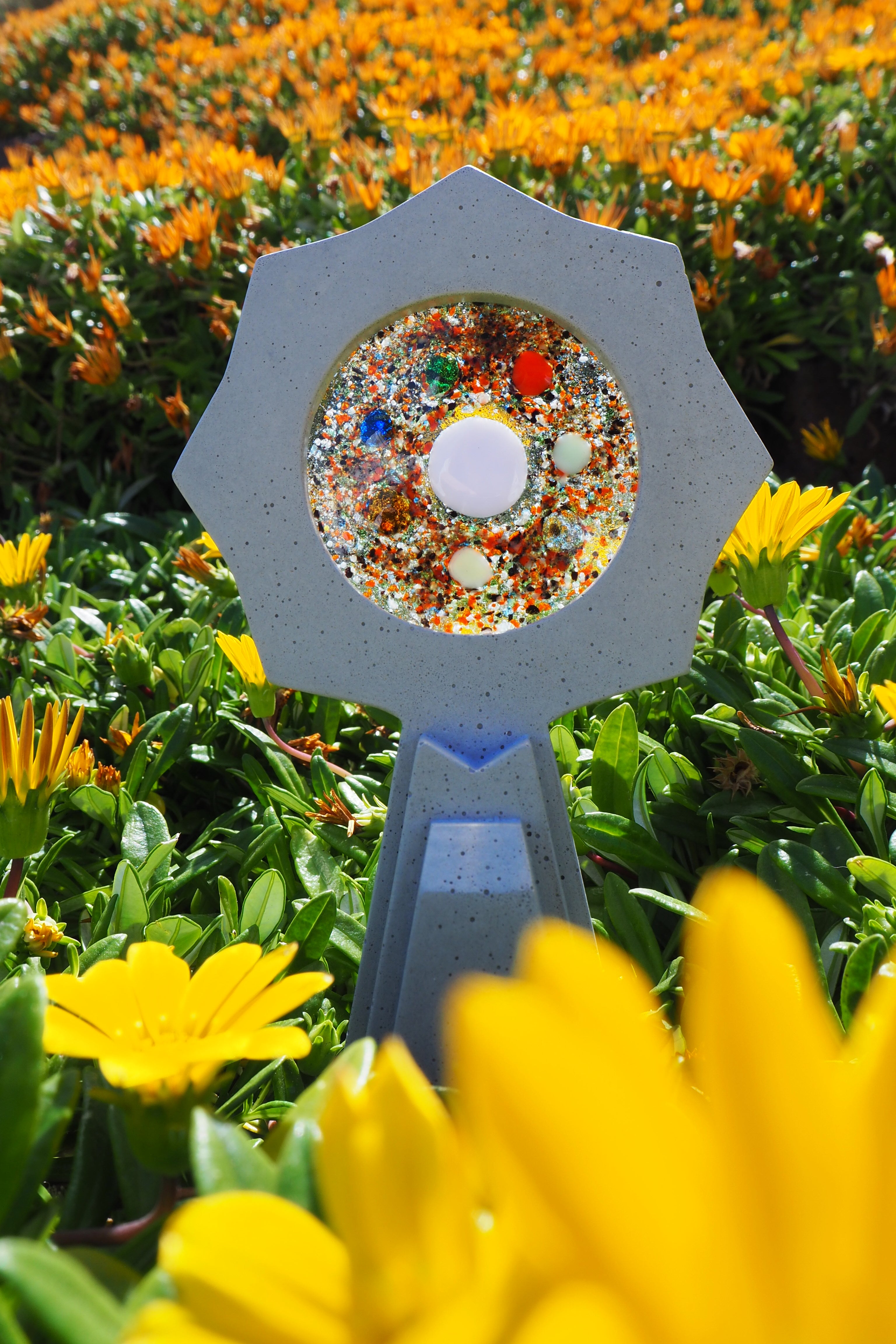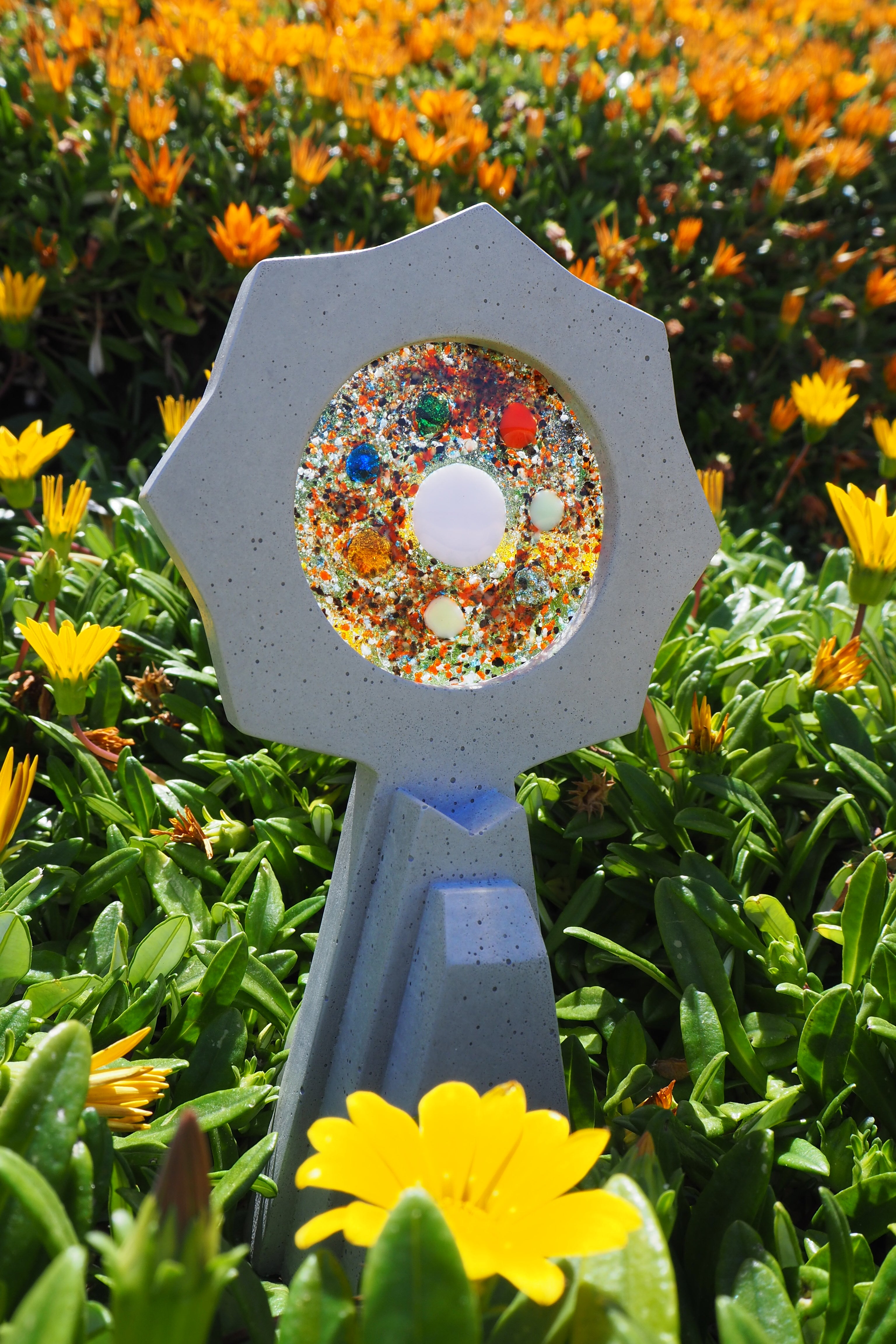 Medium: Unique fused glass disc set in waxed concrete sculpture with glass fibre reinforcement - one of a kind