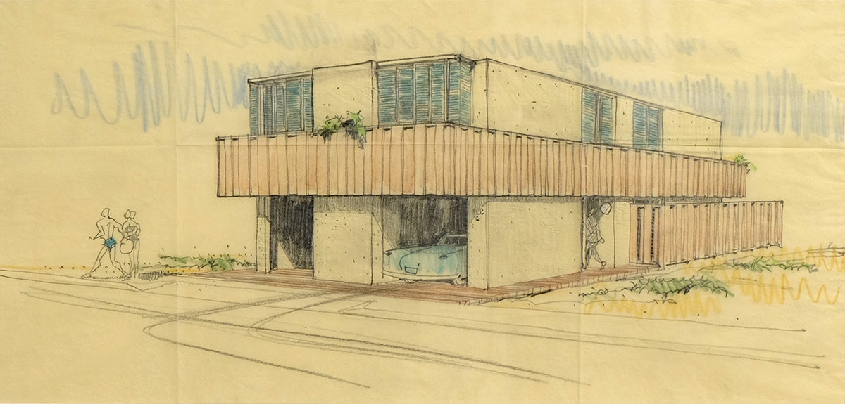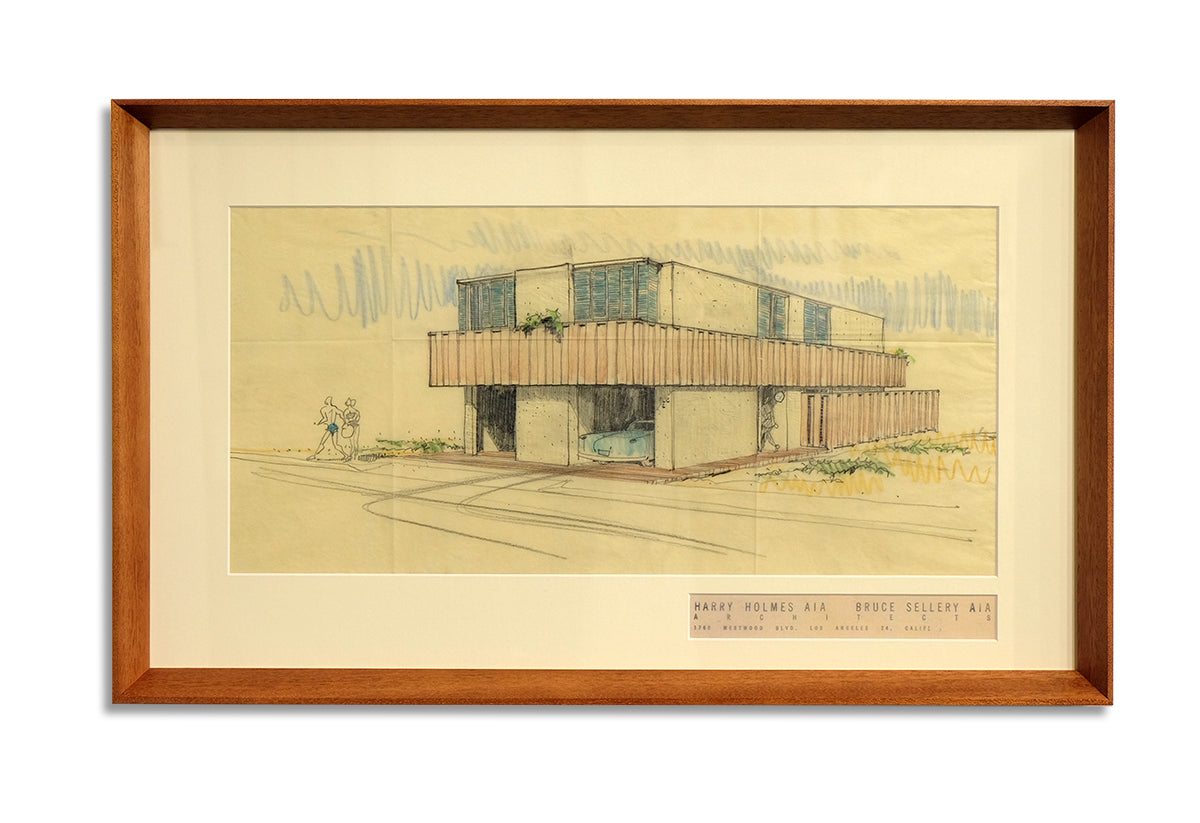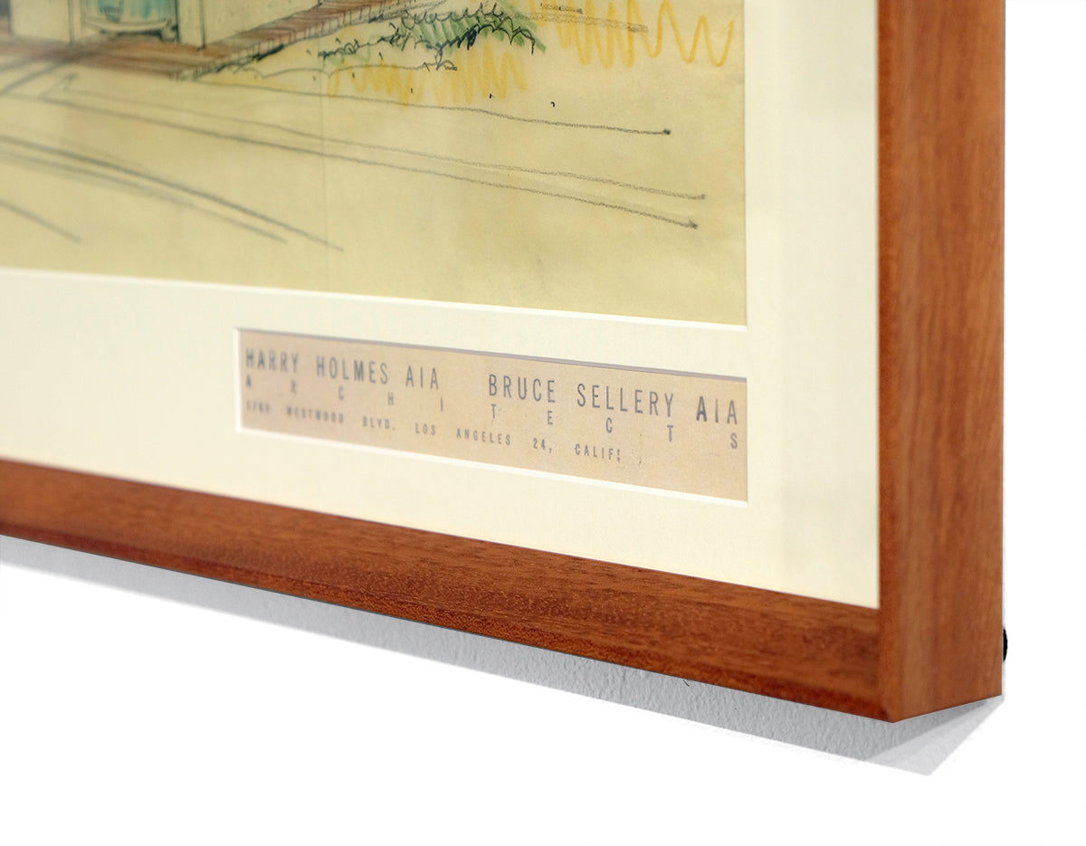 original architectural rendering artwork - graphite and coloured pencil on tracing paper (frame with architectural stamp)