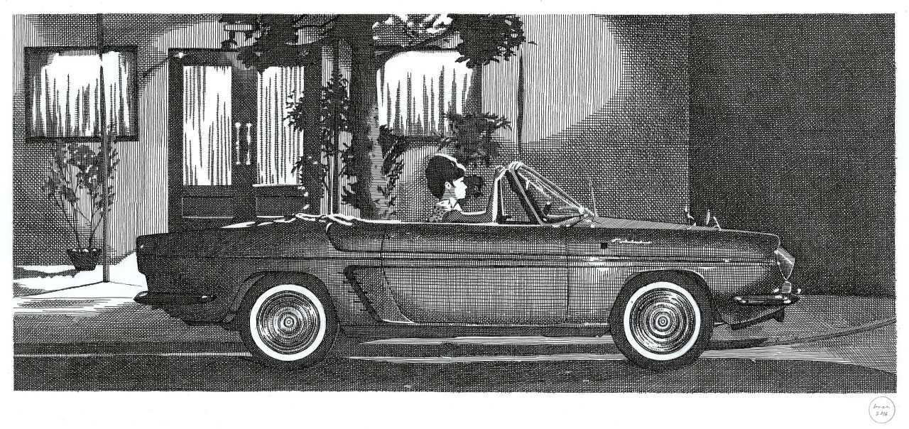 Medium: Ink on bristolboard, framed in new charcoal retro timber frame and white mat