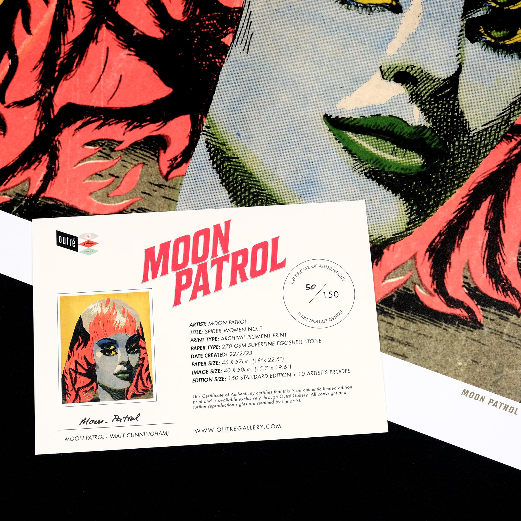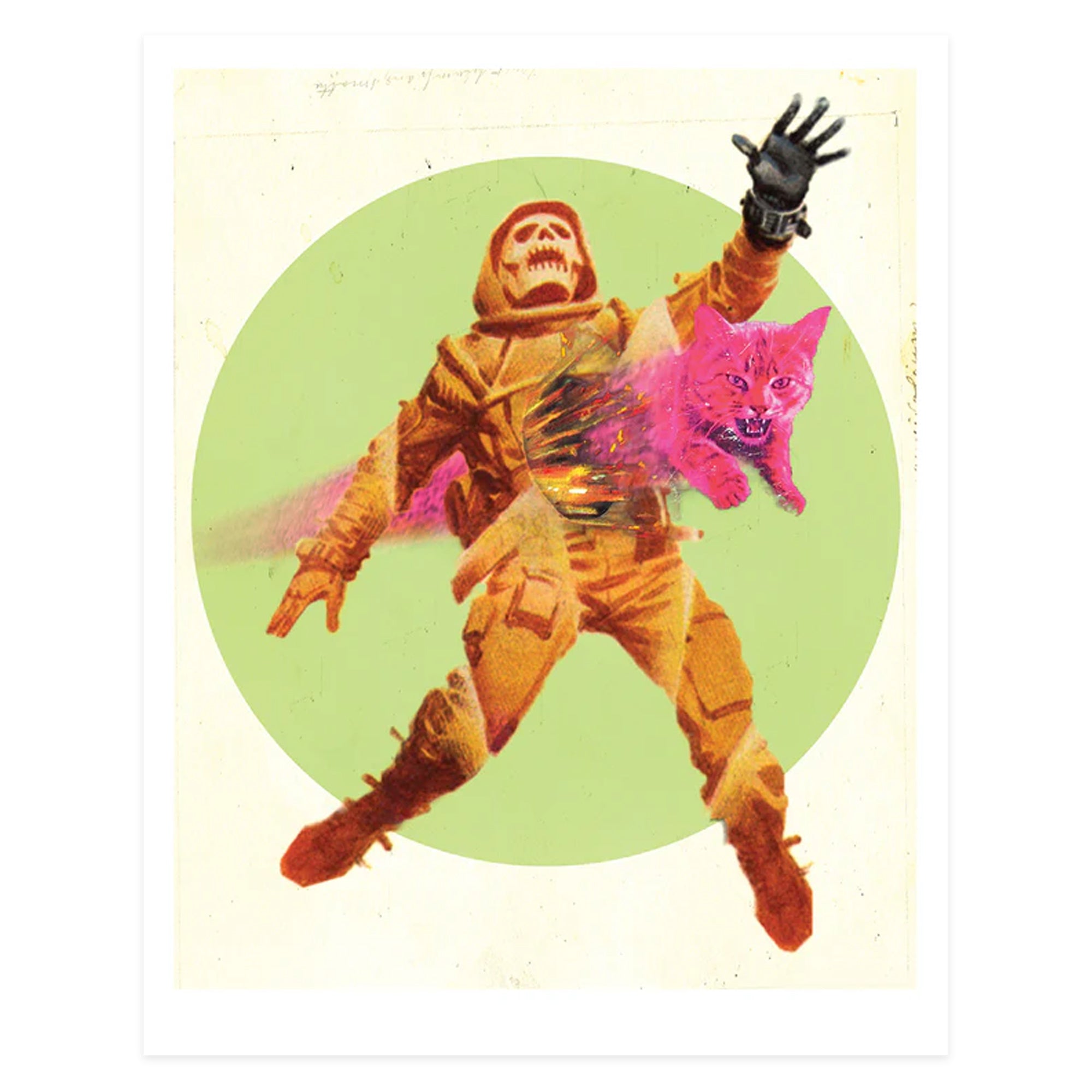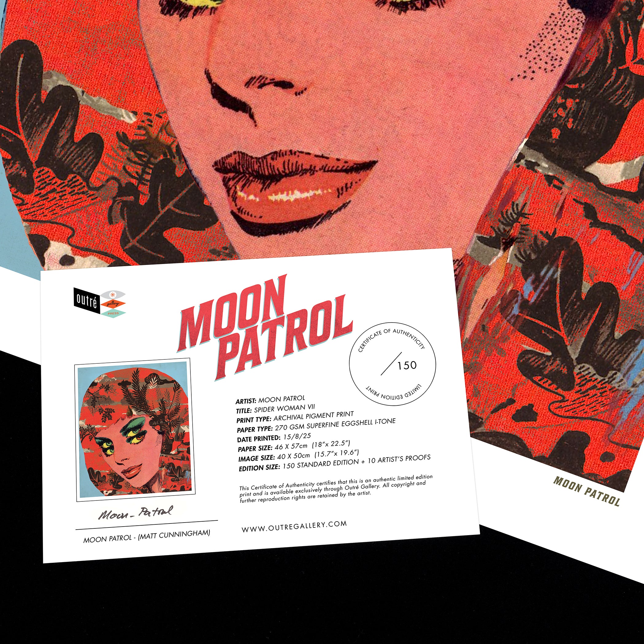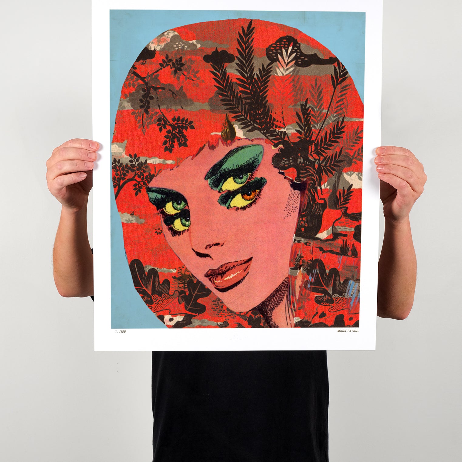 Moon Patrol is a Southern California based artist. Taking themes including 80s cartoons and video games, classic pulp illustrations, other worldly narratives Moon Patrol remixes these many and varied cues using a collage technique he compares to "Kid Koala's turntable albums, and in part by William Burroughs' cut-up technique”.
