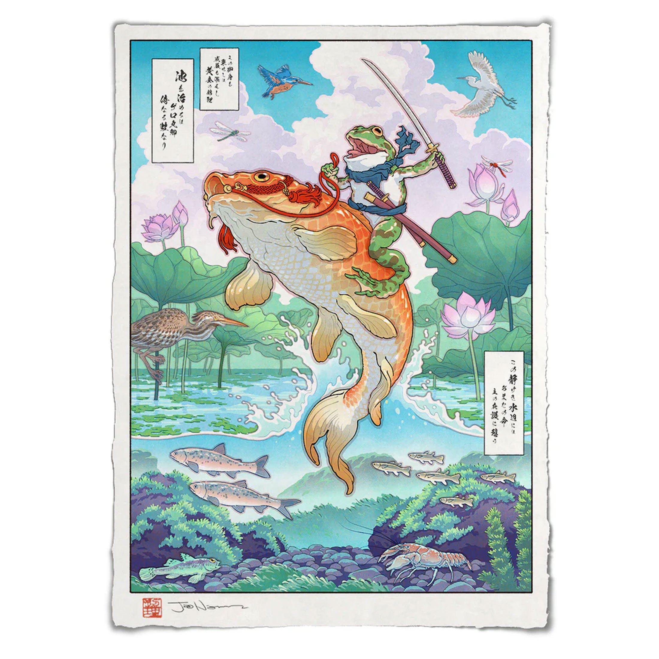 Meet Lord Gero, the noble frog samurai who rides atop a regal golden koi. With blade in hand and honor in his heart, he patrols his quiet pond.