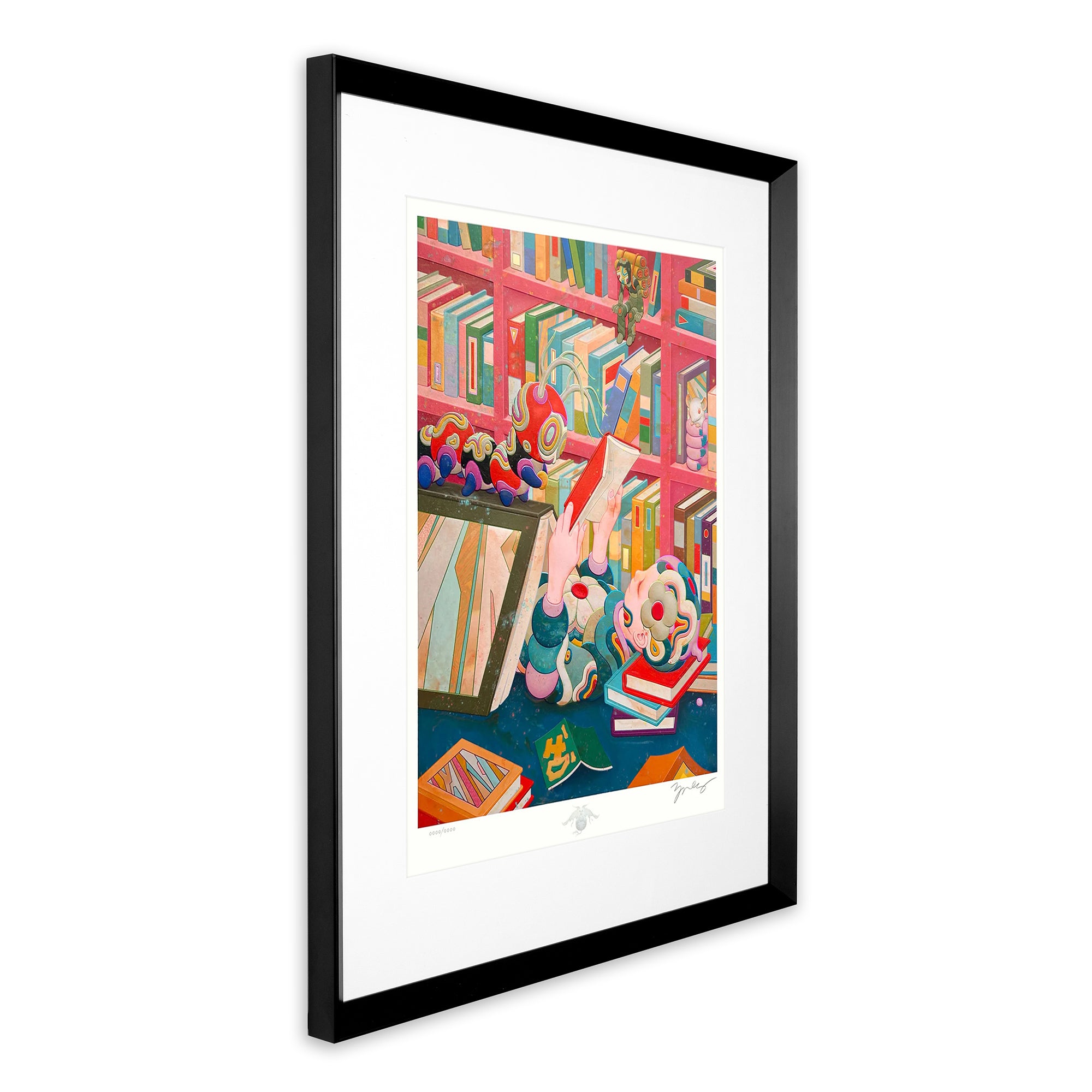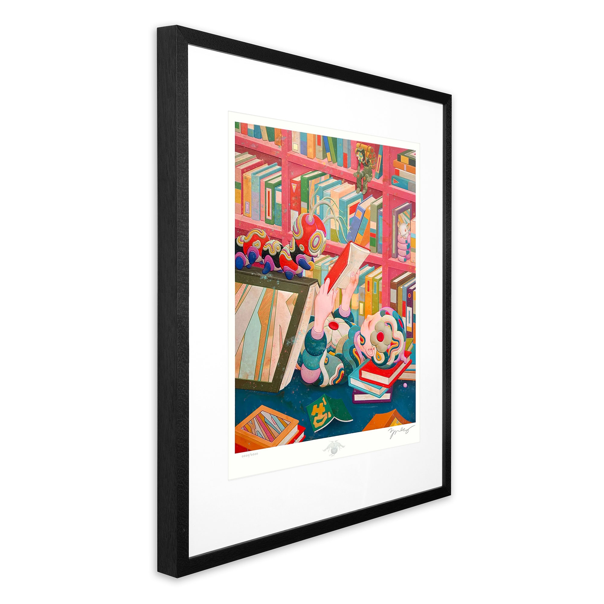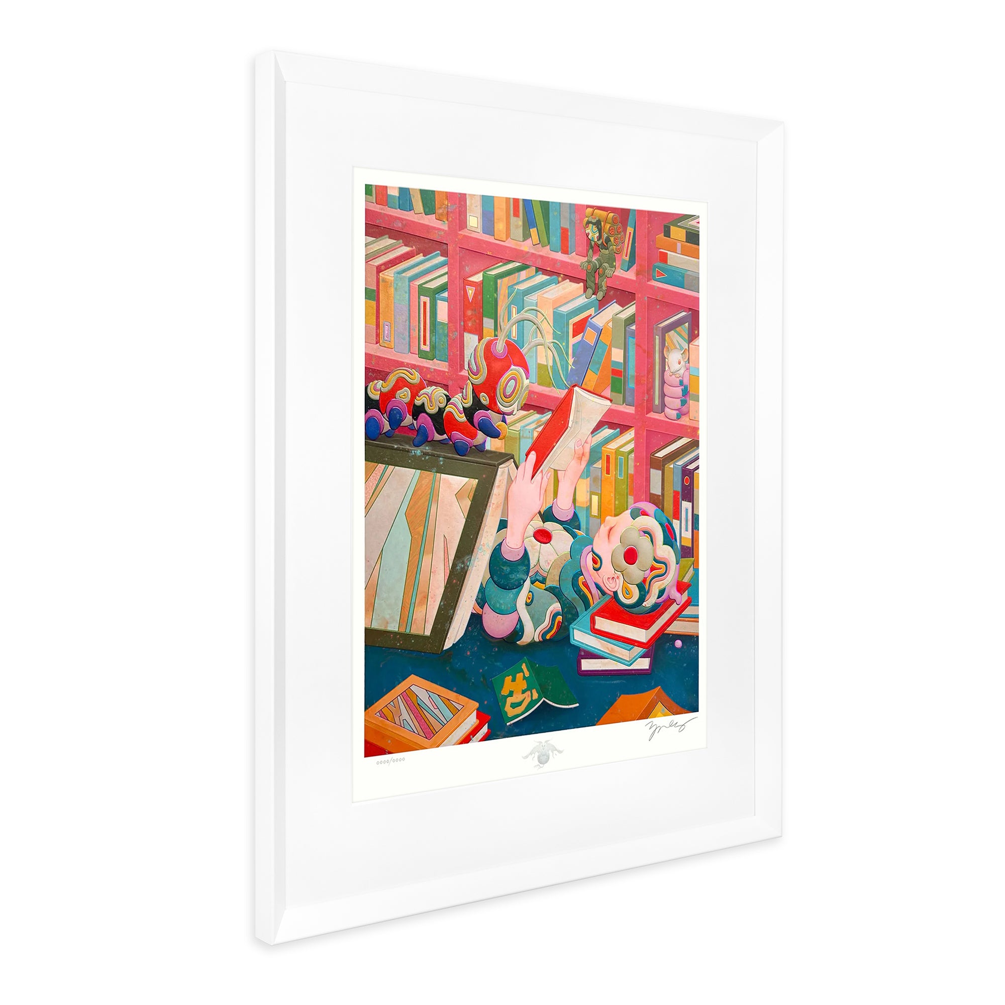 As the bookworm crawls over the spine and peers over the headband, the Bibliophile reads beneath a makeshift shelter. The pages become armor against the external world, while a battlefield of words takes shape within. The vast library teems with life as characters burst forth from the bindings. The covers gleam with numerous layered foils, pressed into delicate relief. Having devoured countless volumes, the worm transforms into a moth—forever embossed in paper.