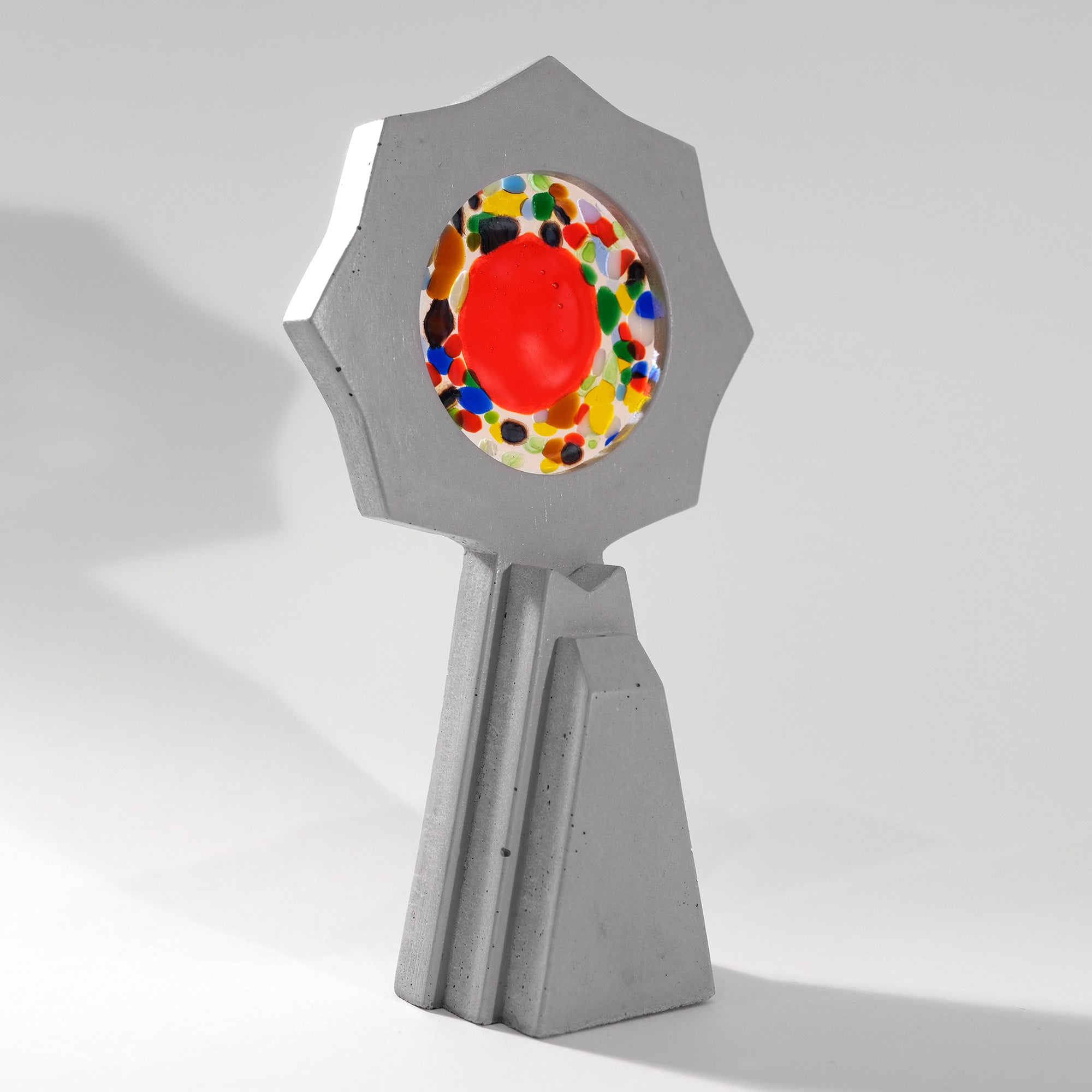 Medium: Unique fused glass disc set in waxed concrete sculpture with glass fibre reinforcement - one of a kind