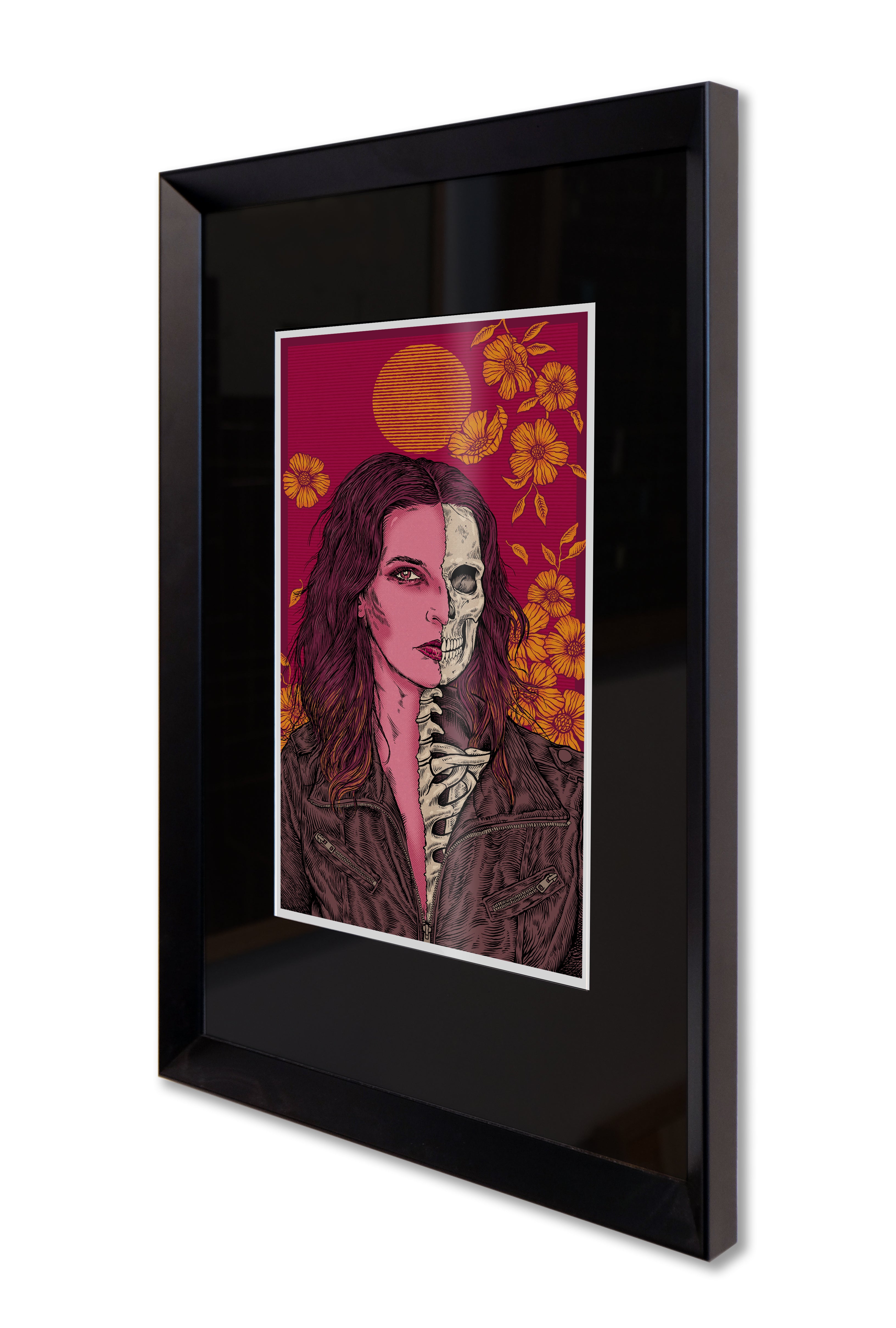 Framed size: 30 x 45 cm (Framed in a black mini retro frame with a black mat.)