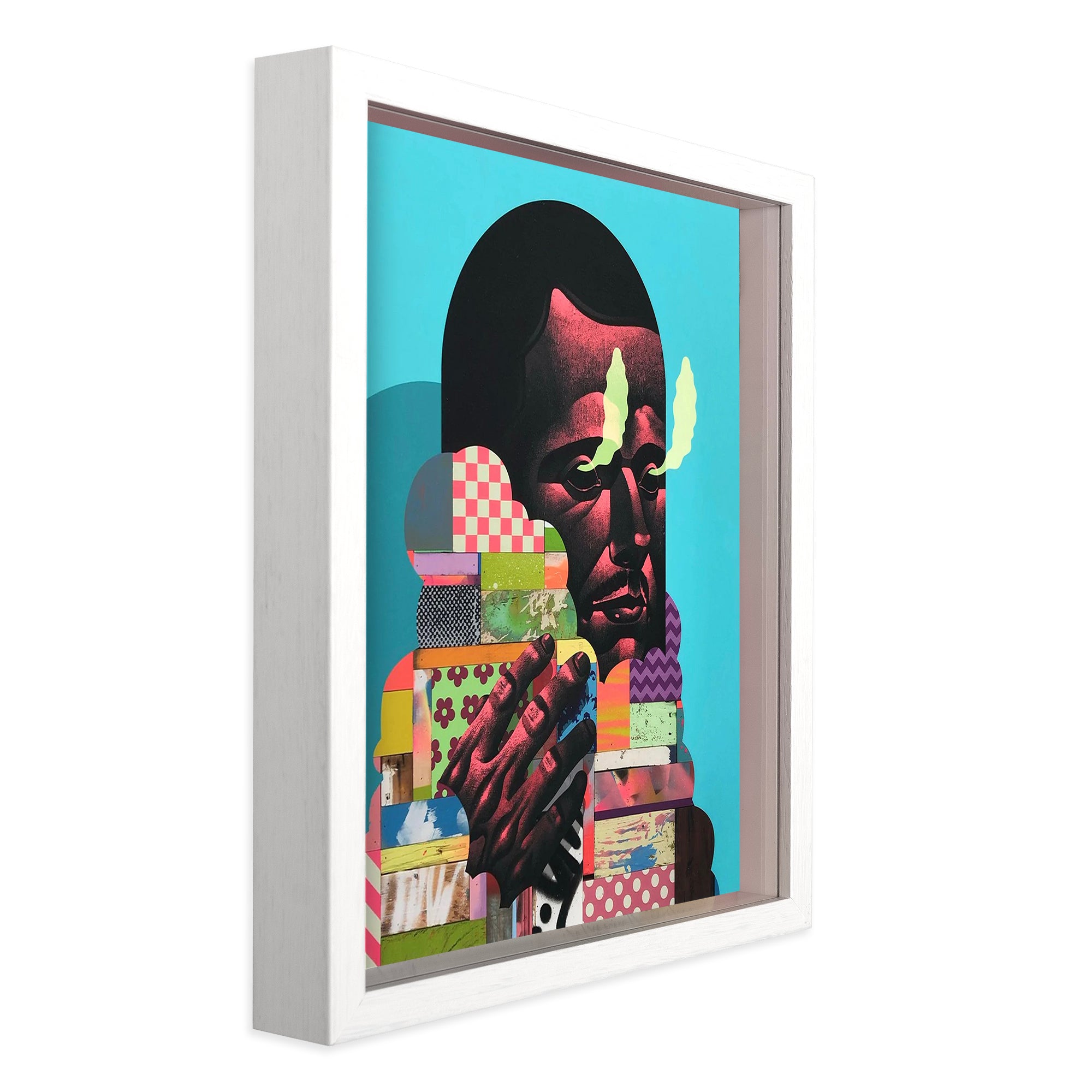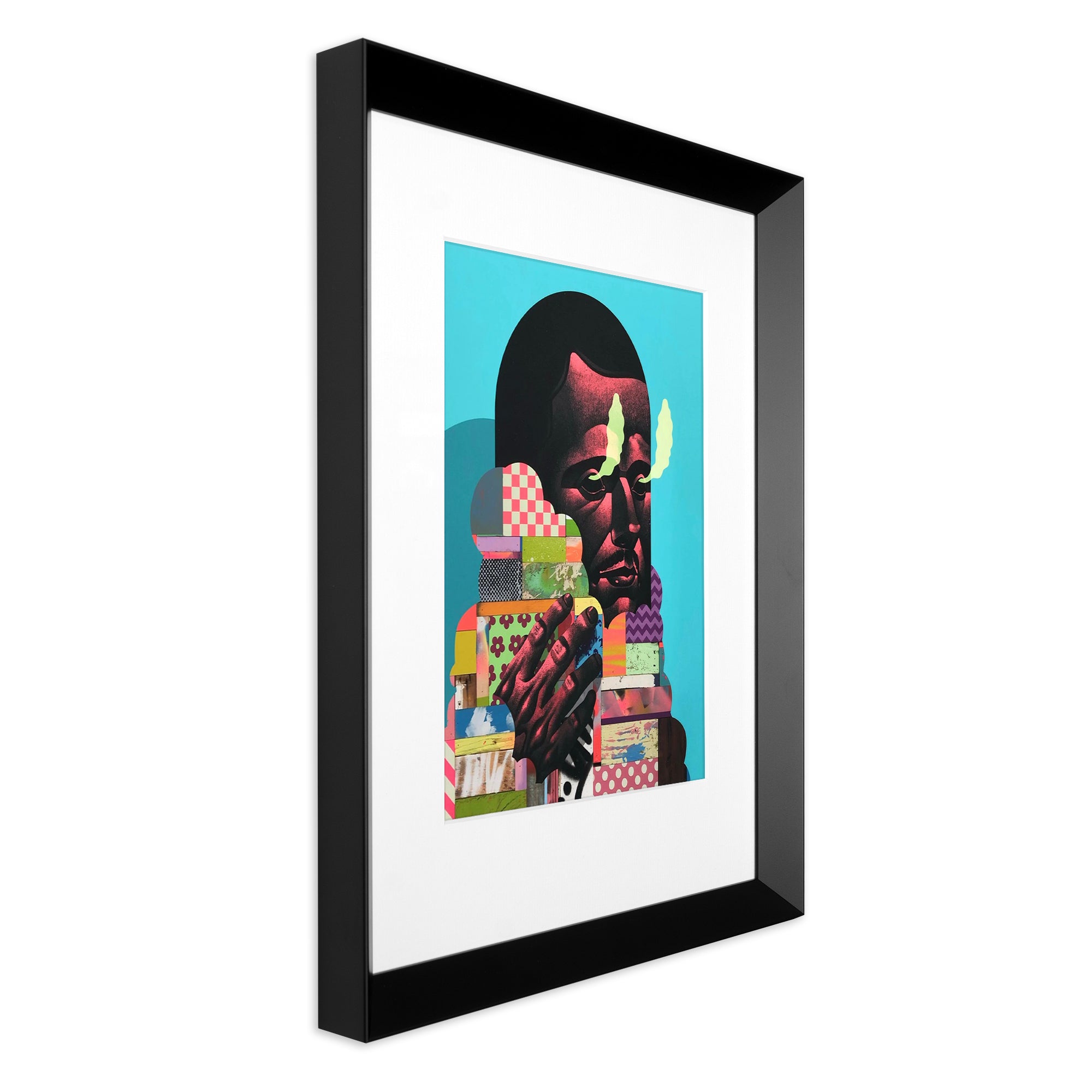 Standard frame: black mini retro frame and white mat OR thin white box back frame (no mat) / view framing style