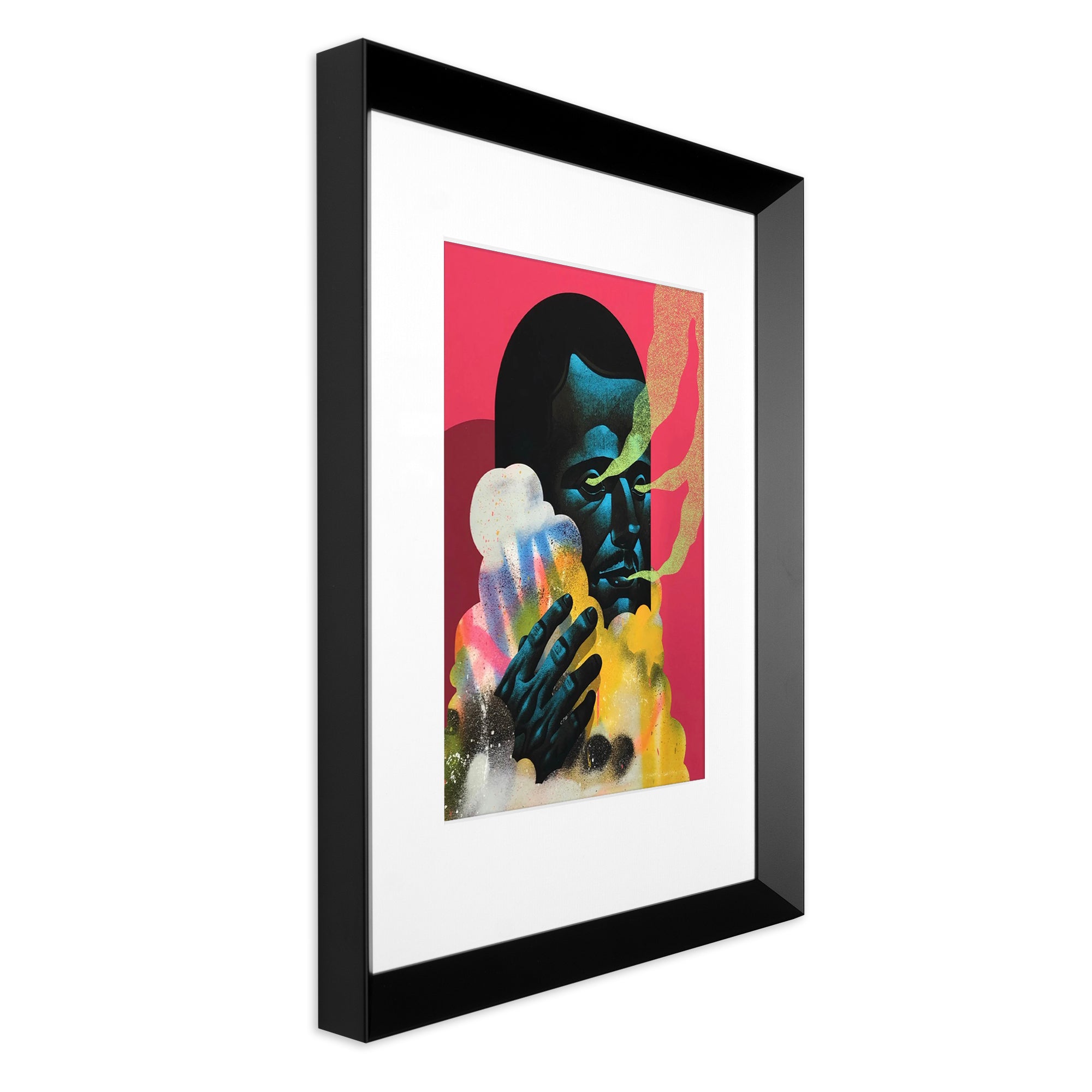 Standard frame: black mini retro frame and white mat OR thin white box back frame (no mat) view framing style