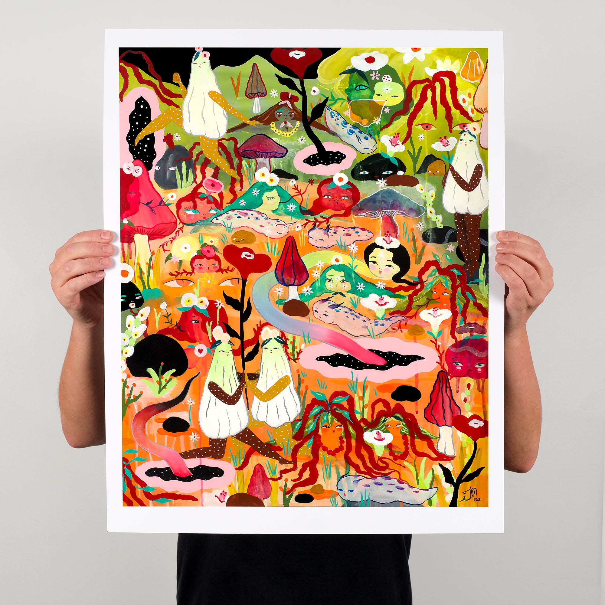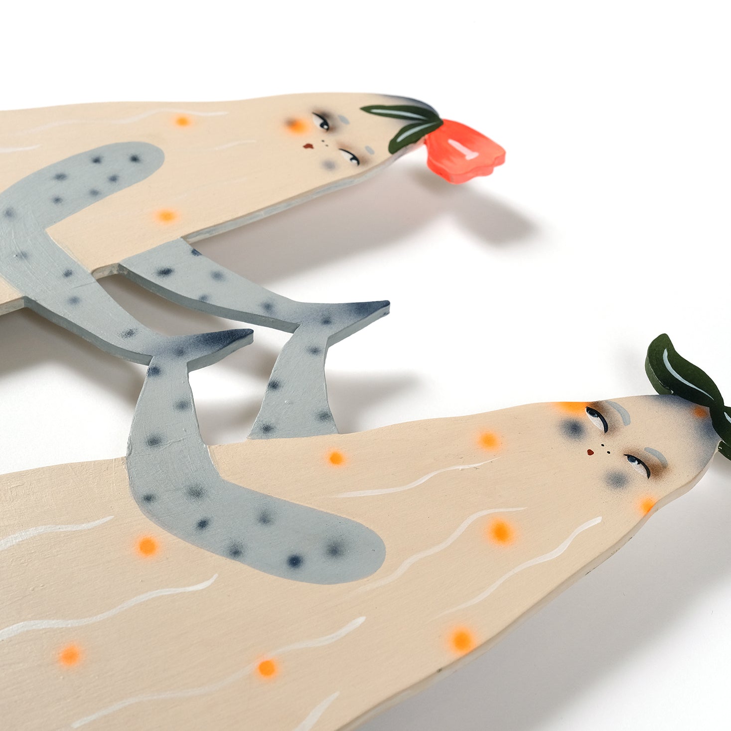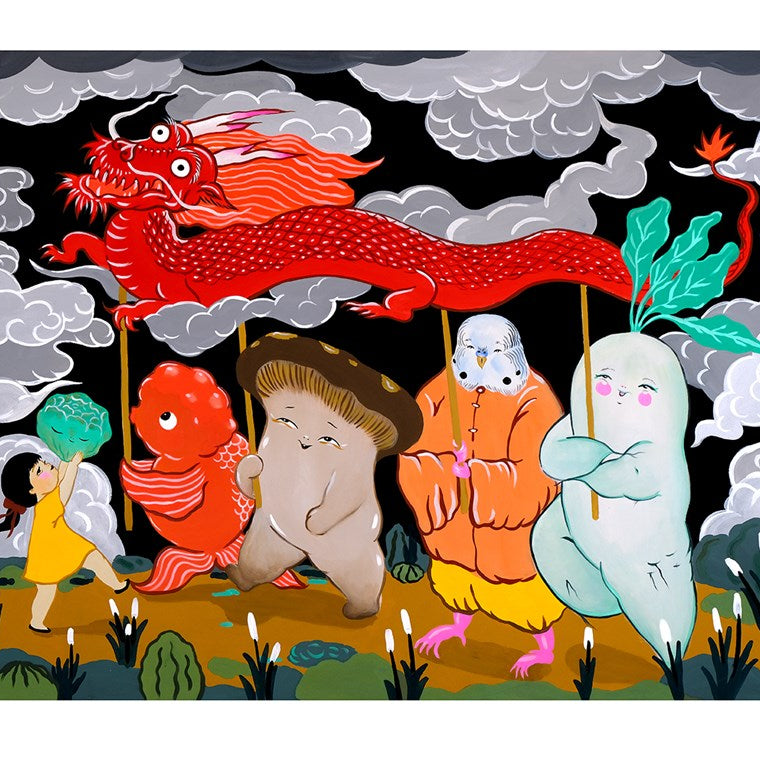 Tanja McMillan (Misery) is a New Zealand-based wall and pop artist. Tanja has exhibited in Berlin, Taiwan, Melbourne, Paris, Hawaii and Los Angeles. Her creative reach is extensive, ranging from highly crafted paintings and wall art to animation, fashion, toys and children’s decor brand Misery Guts. Tanja also sculpts, having completed two commissioned bronzes in Auckland’s Art District of Karangahape Road in 2016. Stylistically she could be equated to a saccharine Bill Hammond, with obvious visual references to her Tahitian / Chinese heritage, which can be seen through her subject matter, flattened depth of field, mode of storytelling and outstanding ink work.