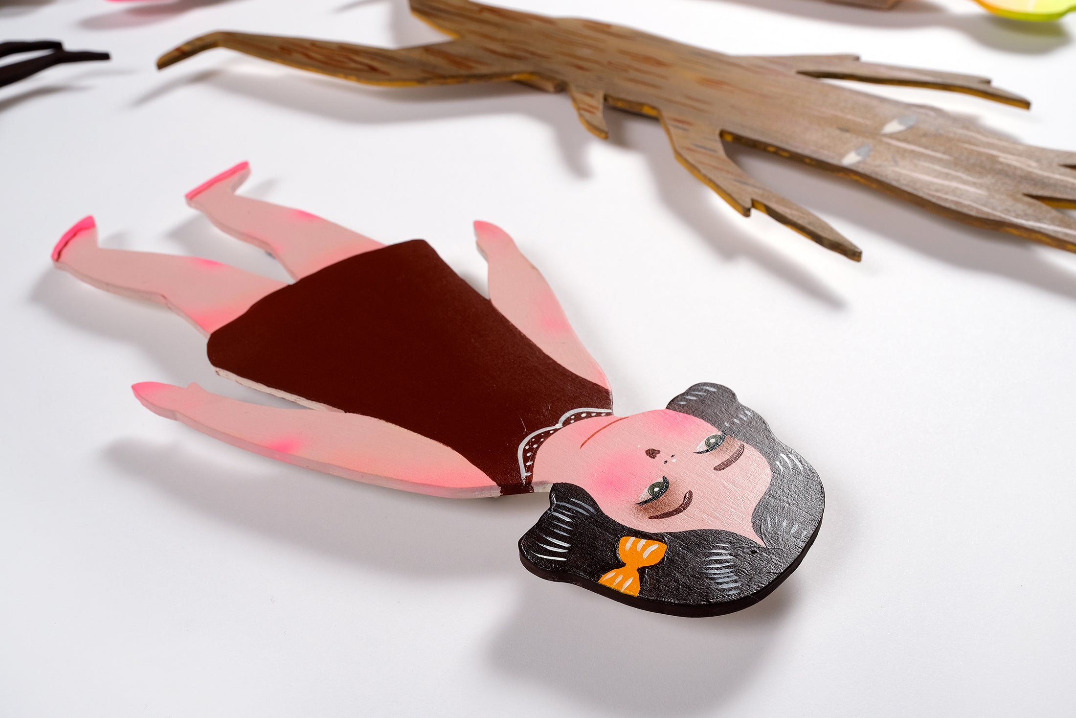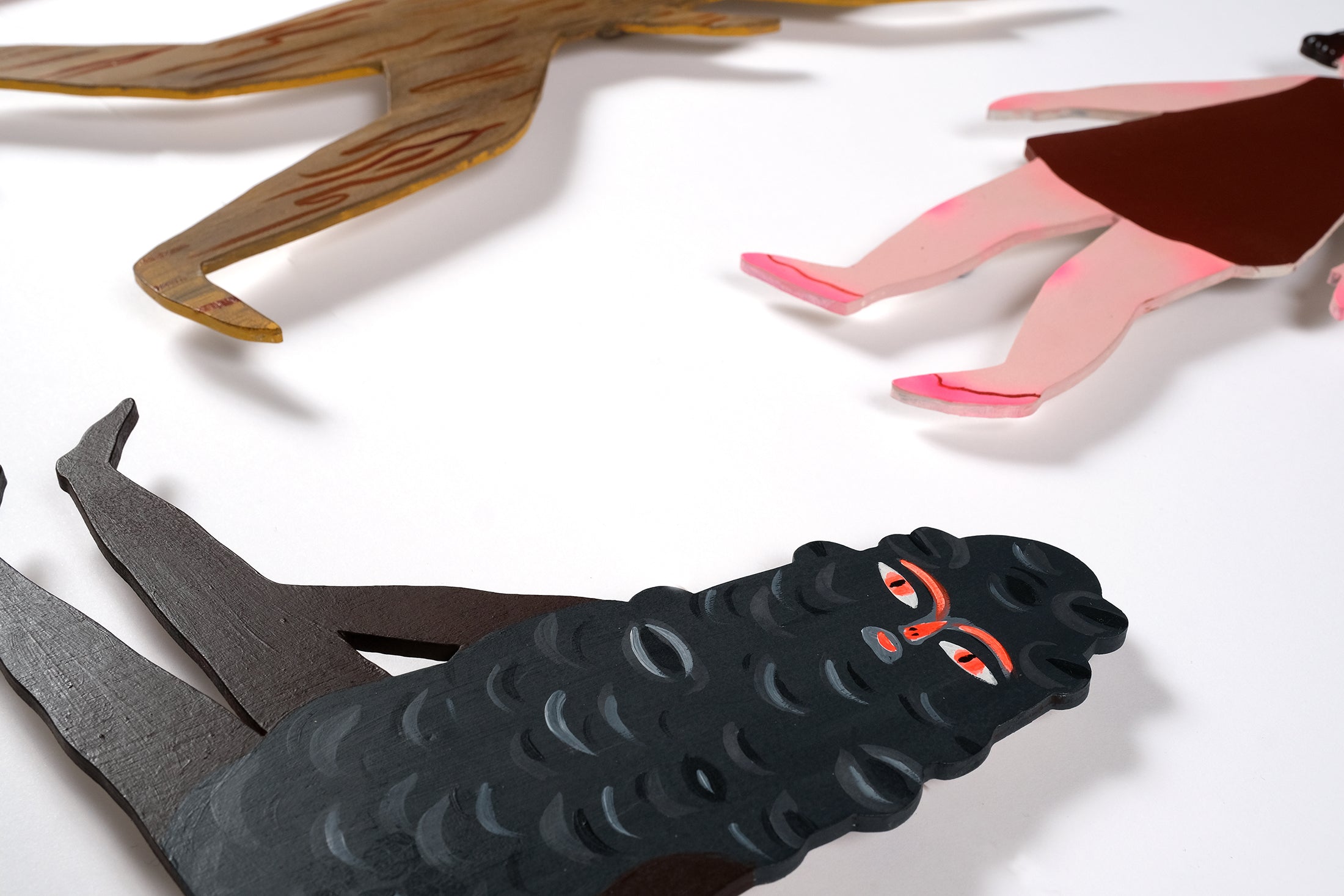 Description: Set of 7 painted wooden cutout characters. Each cutout has a keyhole hanger on the back, and characters can be hung in different arrangements.