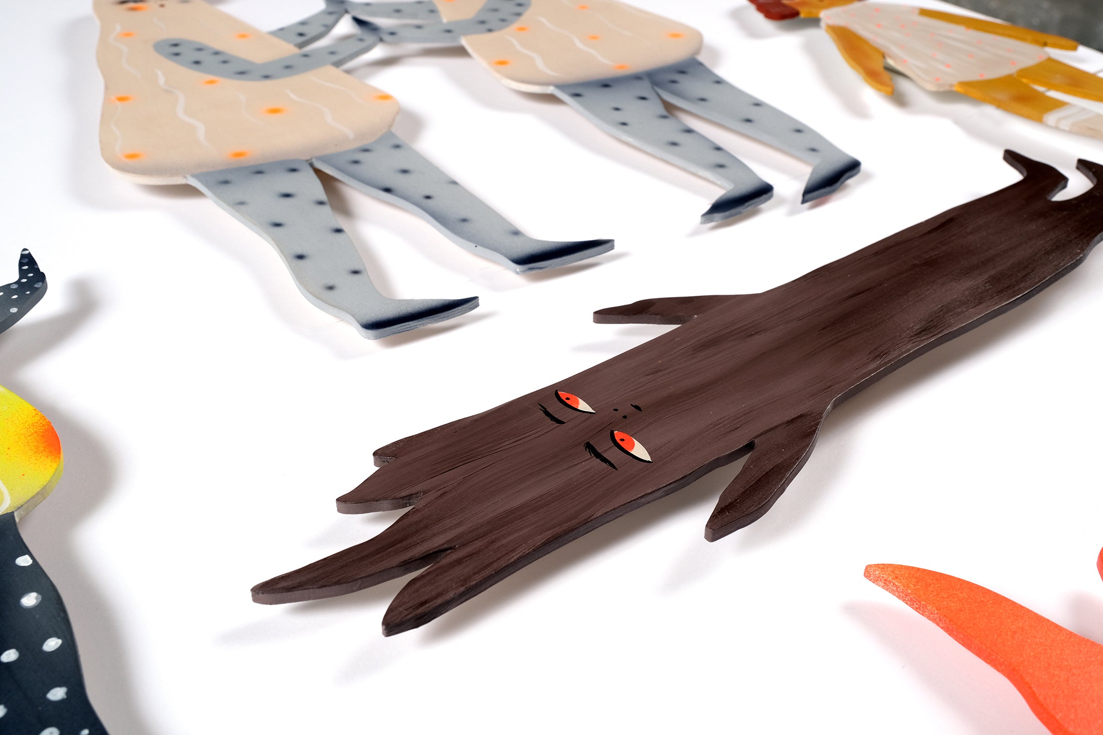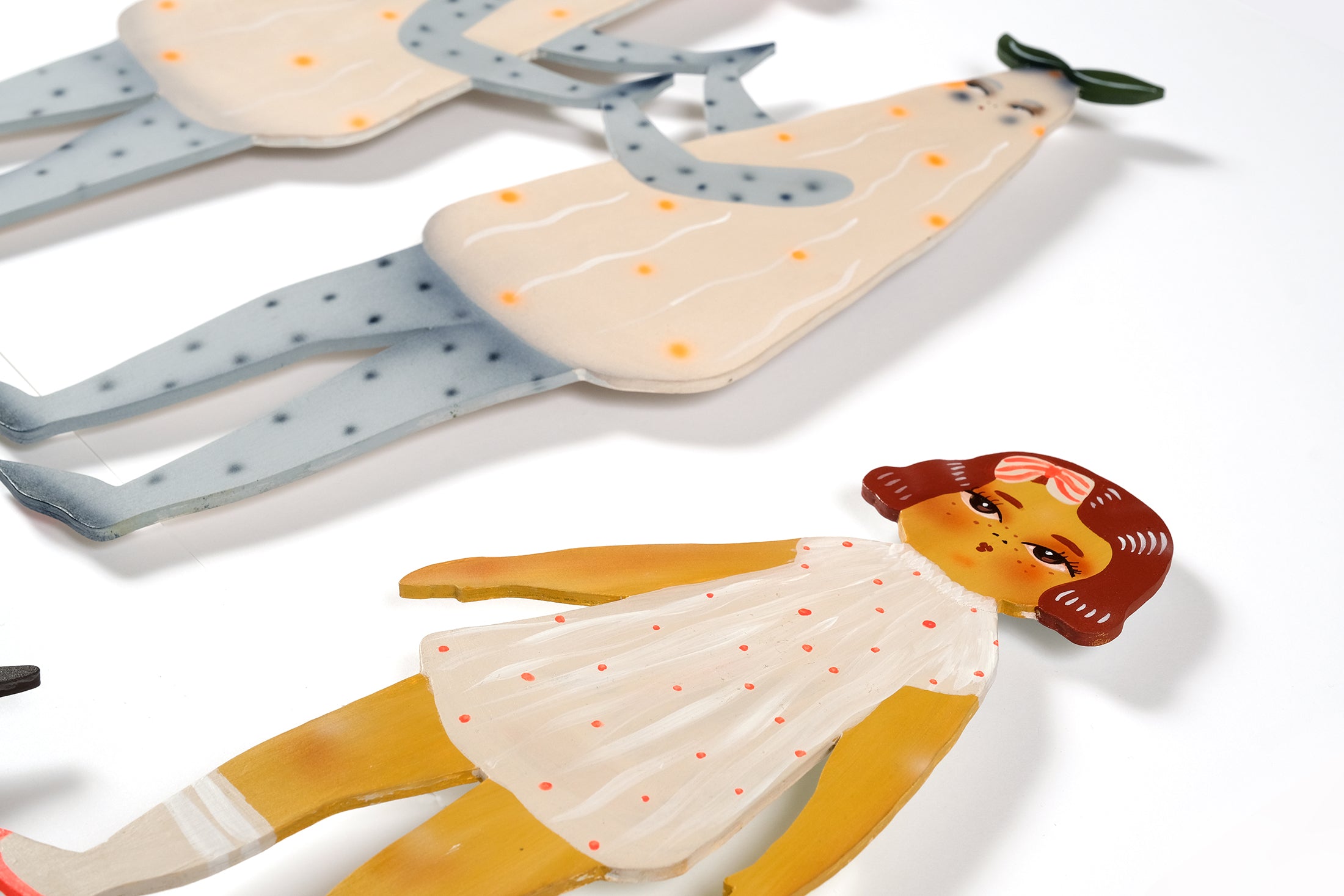 Description: Set of 6 painted wooden cutout characters. Each cutout has a keyhole hanger on the back, and characters can be hung in different arrangements.