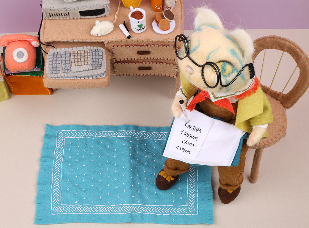 Medium: Soft sculpture: wool felt, needle felt, new and vintage fabric, cardboard, cotton, armature wire, polyester stuffing