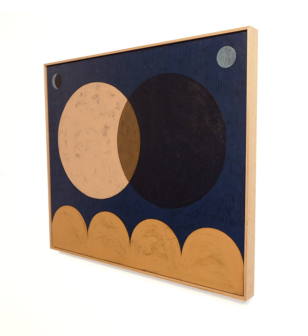 From the artist: "Group shows continue to draw from me new ways of seeing and approaching ideas. This piece resembles a world map, and rather than accurate cartography it shows a symbolic graceful, harmonious overlap of the old and new world, and a deliberate exclusion of the gigantic mass of territory beneath only identified as Terra Australis Incognita, the ‘unknown southern land’. If you dig up some old maps the scale difference is astounding, just how large navigators estimated the mass to be, and may have included parts of continents that we now know as Asia and Antartica. Here I’ve separated the southern mass because I’ve had this alternate story going over and over again in my mind that when navigators set off to explore, the land disappeared, magically retreated, became invisible or simply camouflaged via some sort of marine mirage, and was in fact never ever ‘discovered’ or ‘conquered’. Yet it was. And whenever it was that they would inevitably turn up the land was already further ‘progressed’ than any of their countries were: cohesive, inclusive, uncompetitive, uncorrupted.
