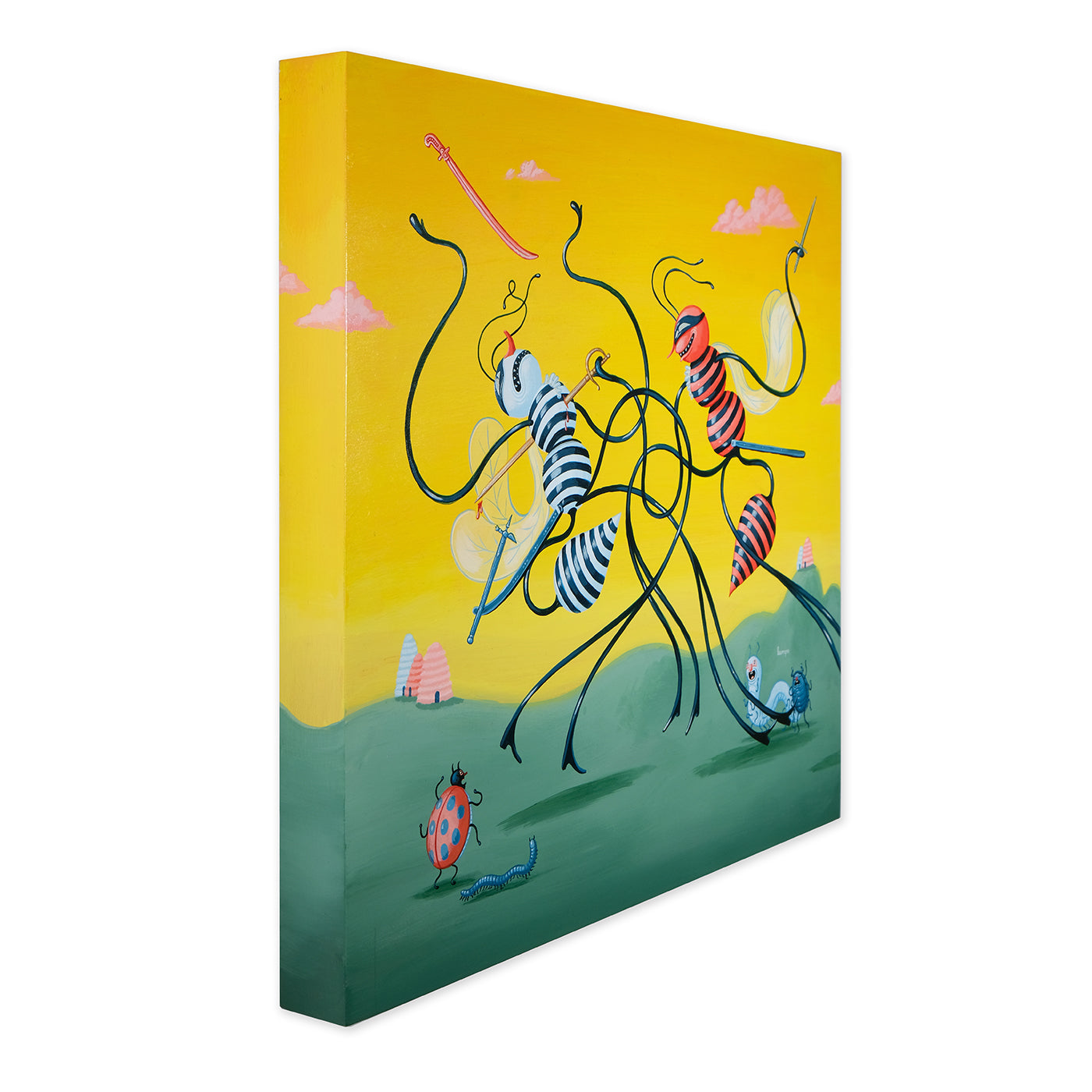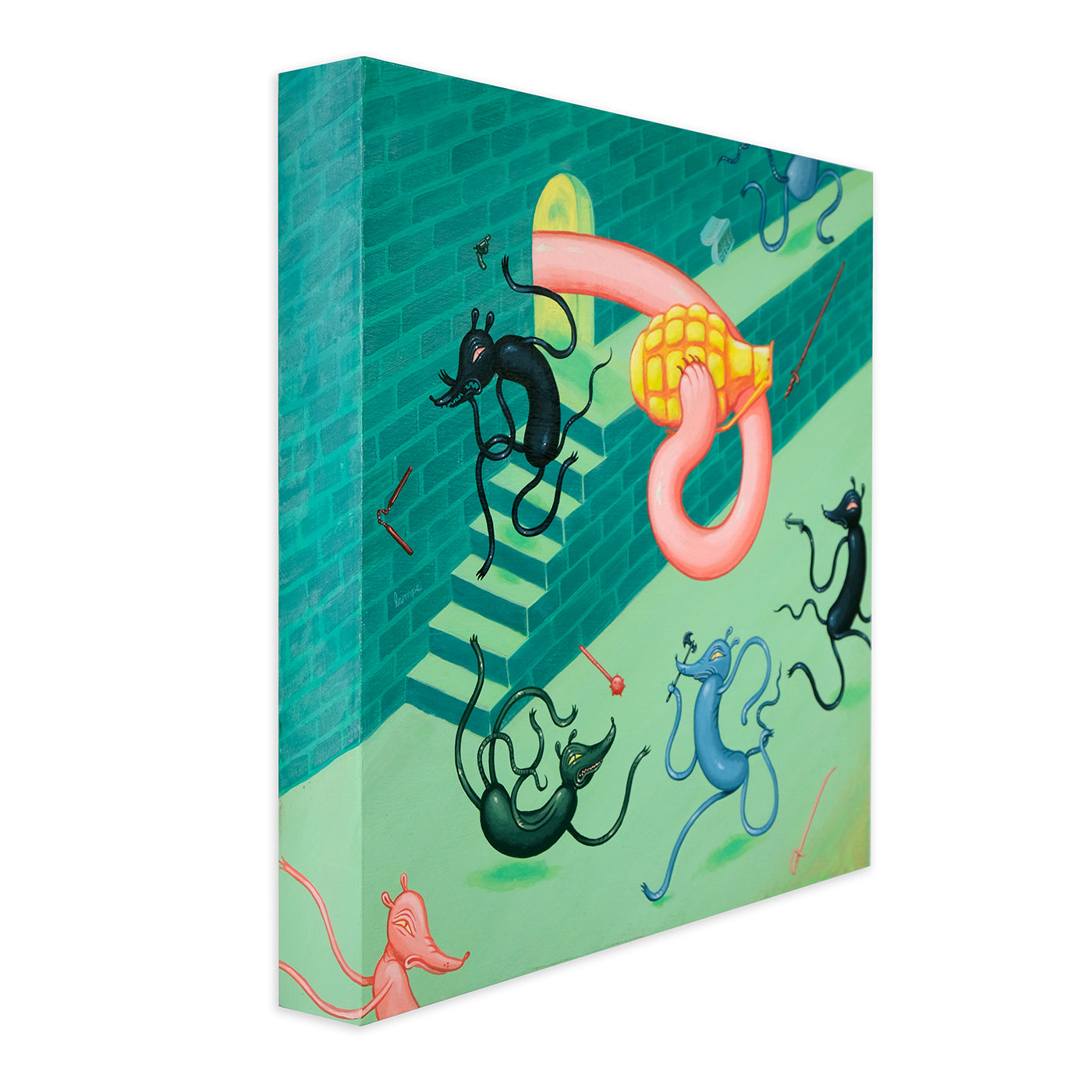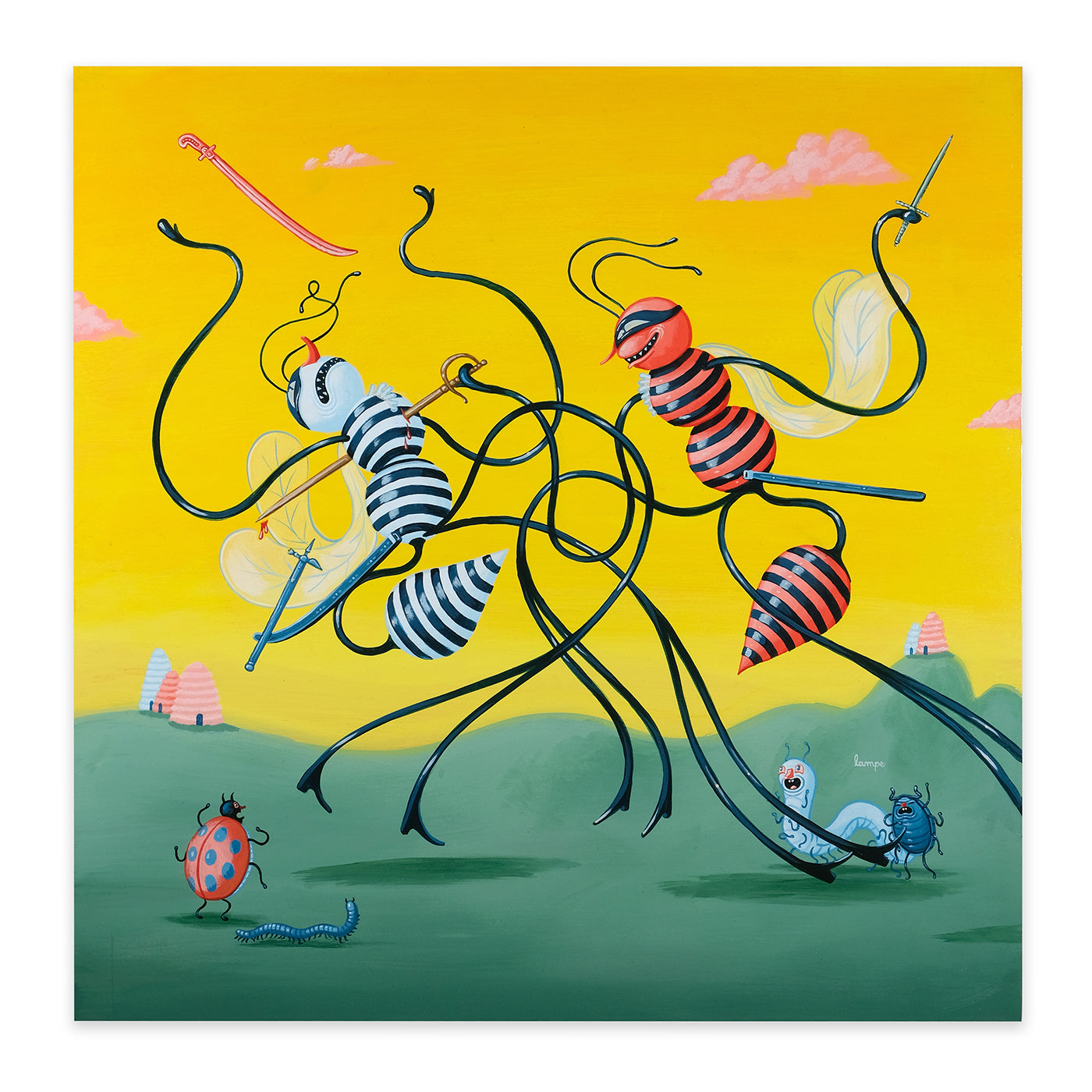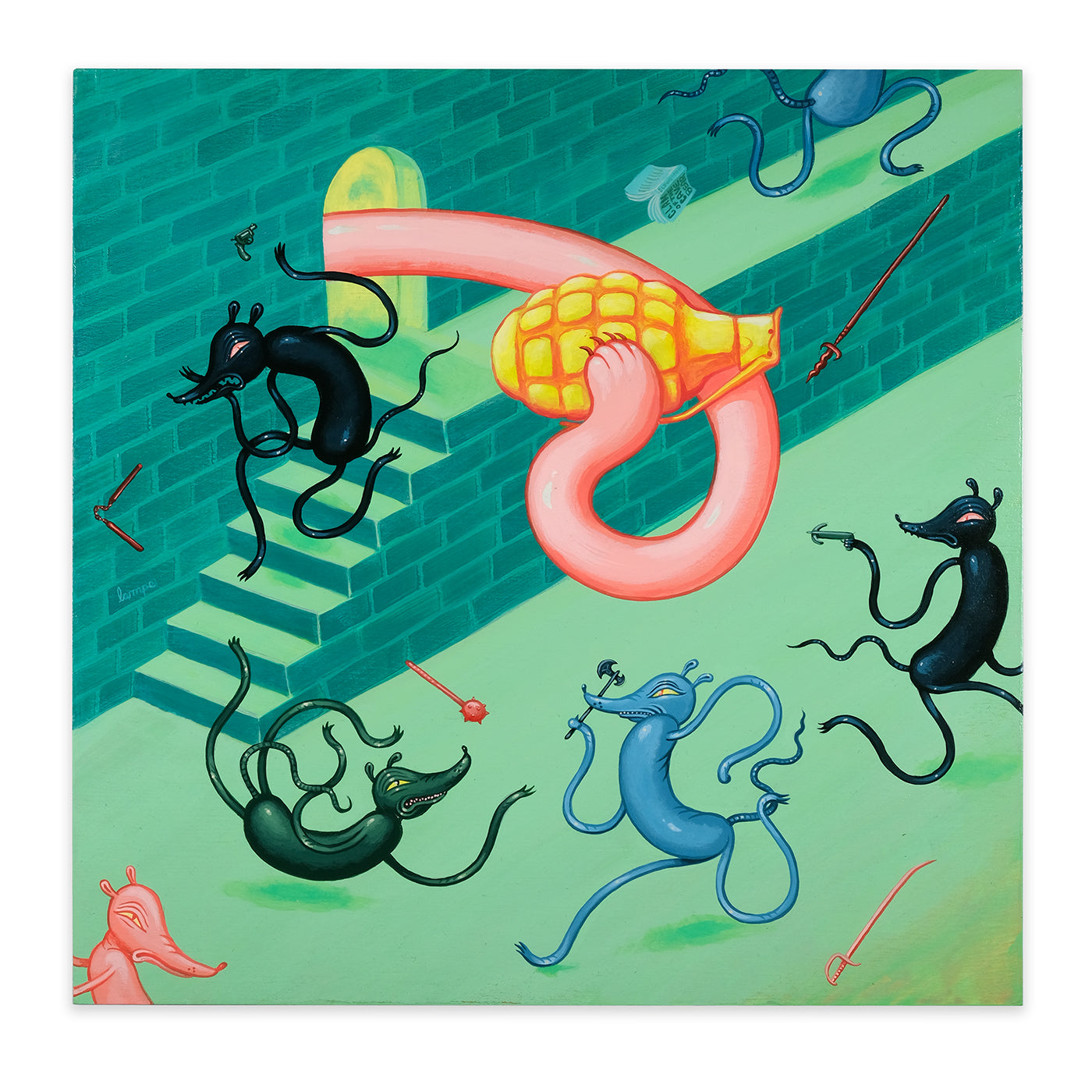 In Outright Foolerishment, Travis is sharing a new body of work with a bit of an Aesop's Fable feel to it this time. Travis stated, "Each painting comes with a lesson, but not the kind of lesson you'd want to 'take on board', so to speak. More the kind of lessons you learn from a pre-teen babysitter who starts smoking the second your parents leave the house."