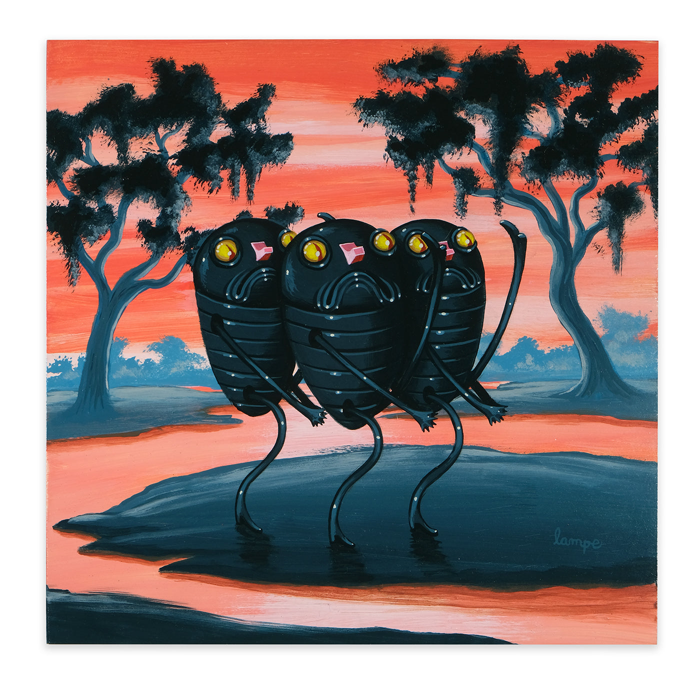 Travis Lampe is an artist based in Chicago, US. He grew up in a small town in Kansas. After earning a degree in graphic design, he took a job in advertising as an art director in Chicago. While making ads for breakfast cereals and well known purveyors of inexpensive furniture over a period of several years, he secretly began “developing his illustration style,” which is not the same thing as “procrastinating.” Finally, when he felt the world was ready, he began his slow explosion onto the art and illustration scene, as it were.