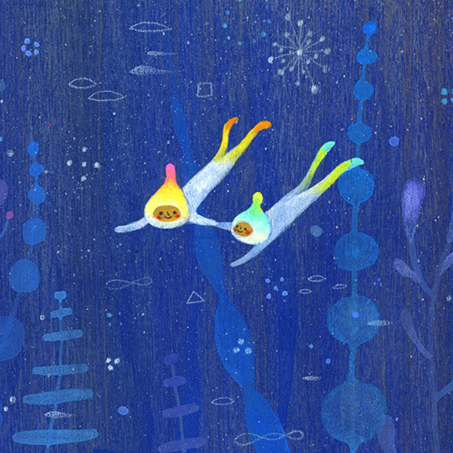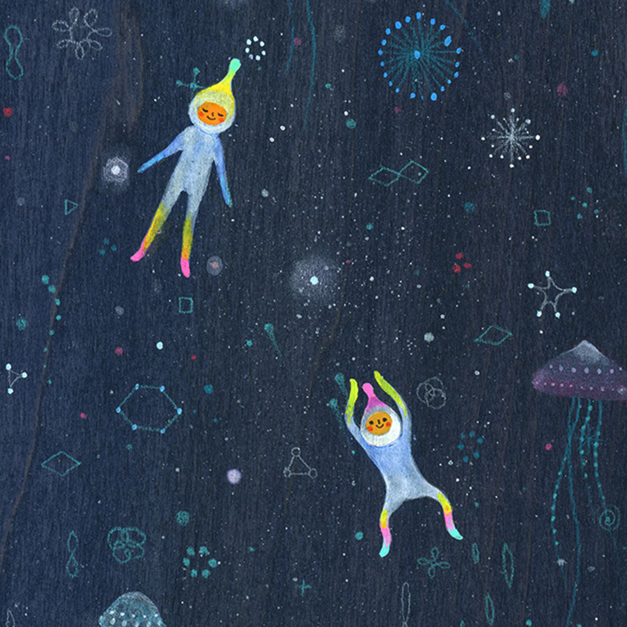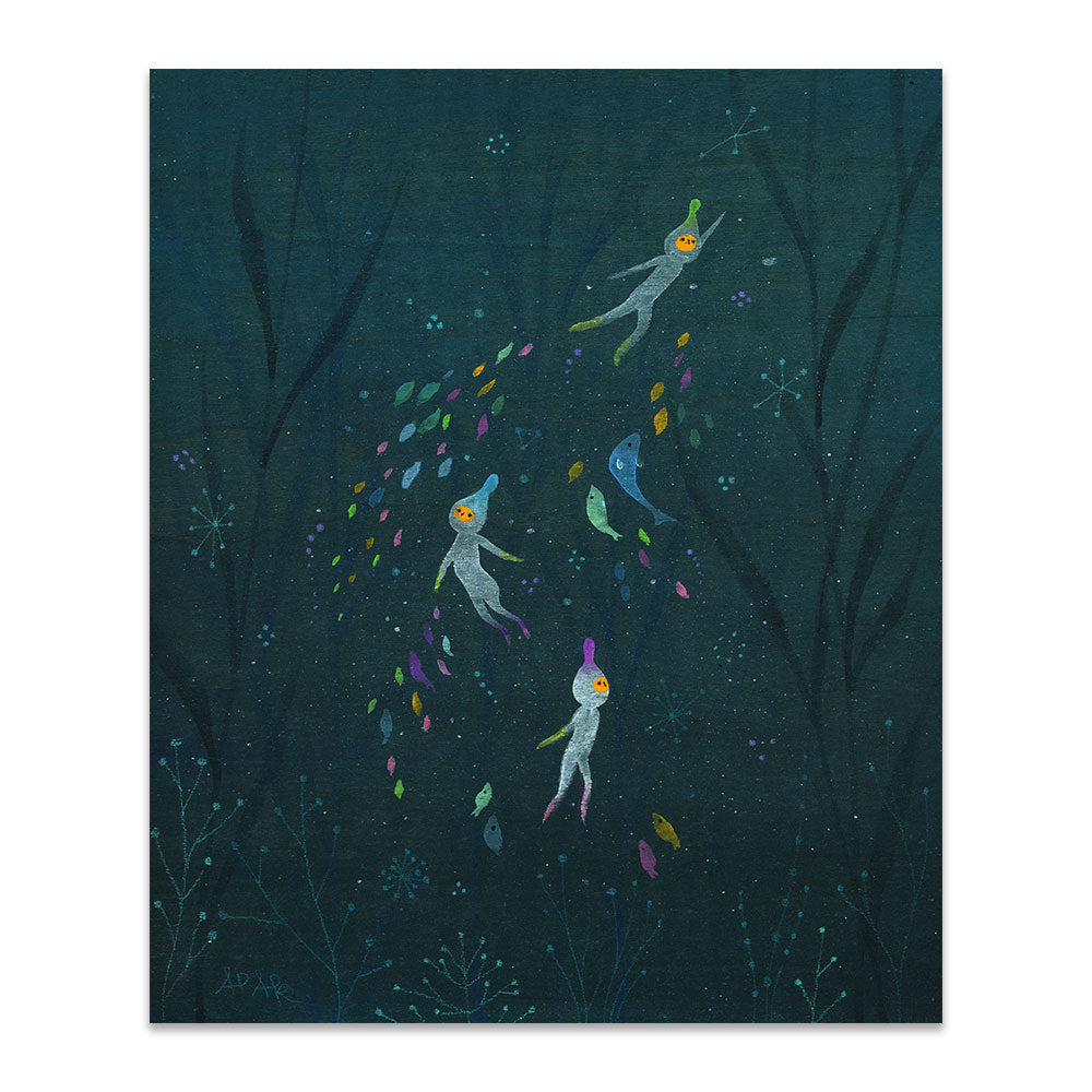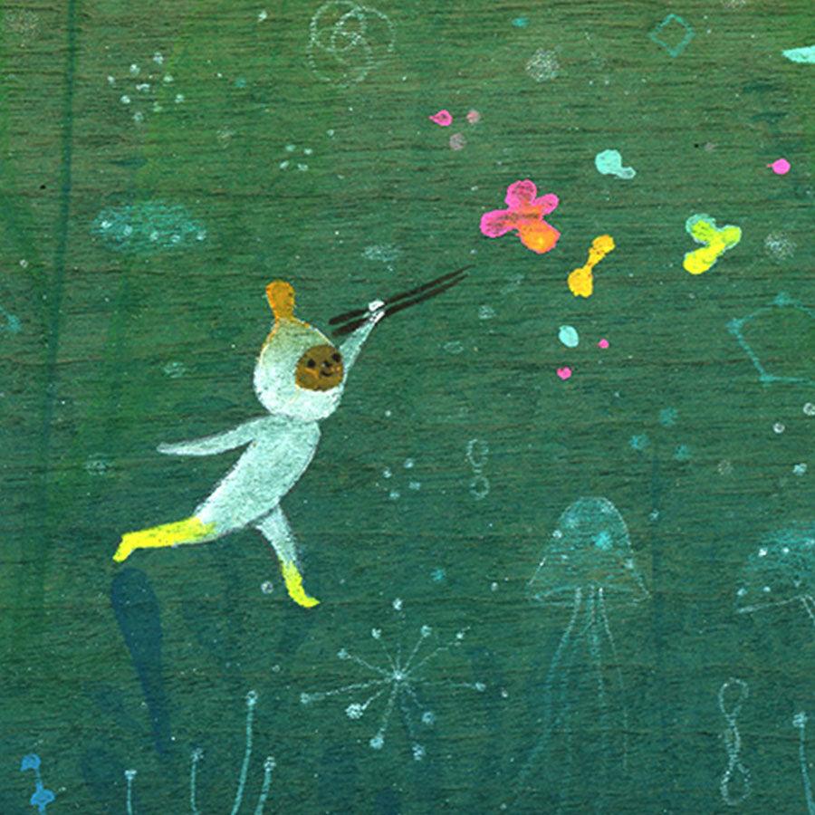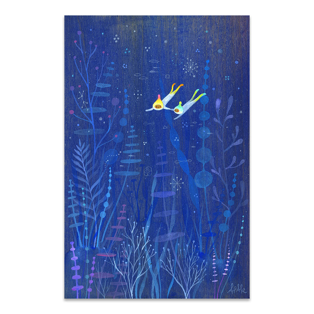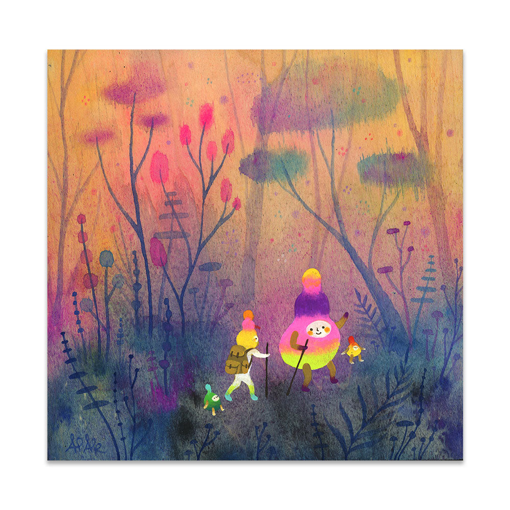 Apak Studio is a collaborative project between Aaron Piland and Ayumi Kajikawa. They create artwork together as a way exploring the beauty, mystery, and magic of life. Apak paint rich and colorful gouache/acrylic artworks on wood featuring the utopian lives and adventures of curious little beings living harmoniously in lush fantastic environments surrounded by friendly little animals.