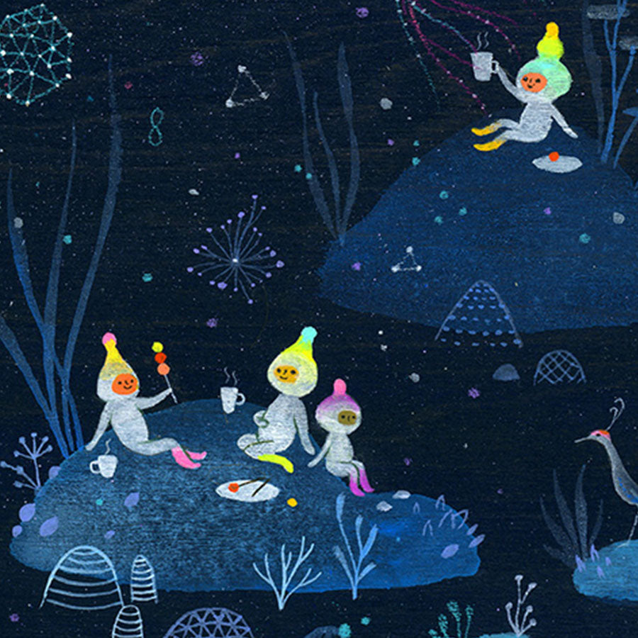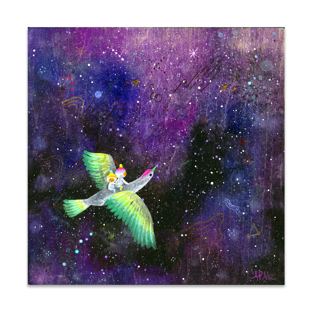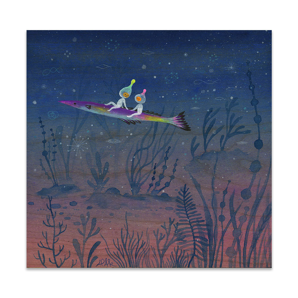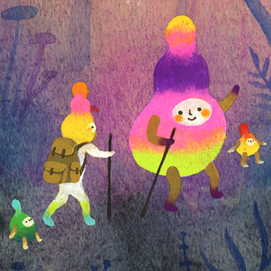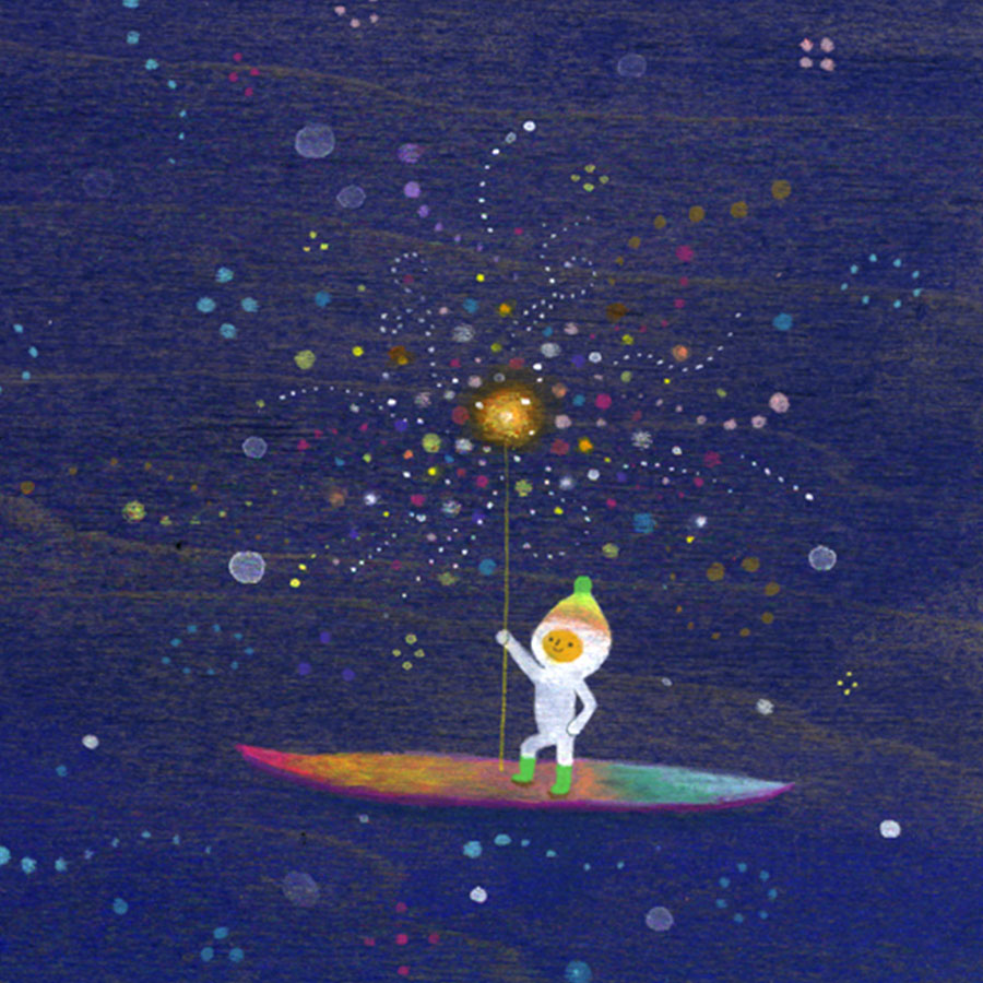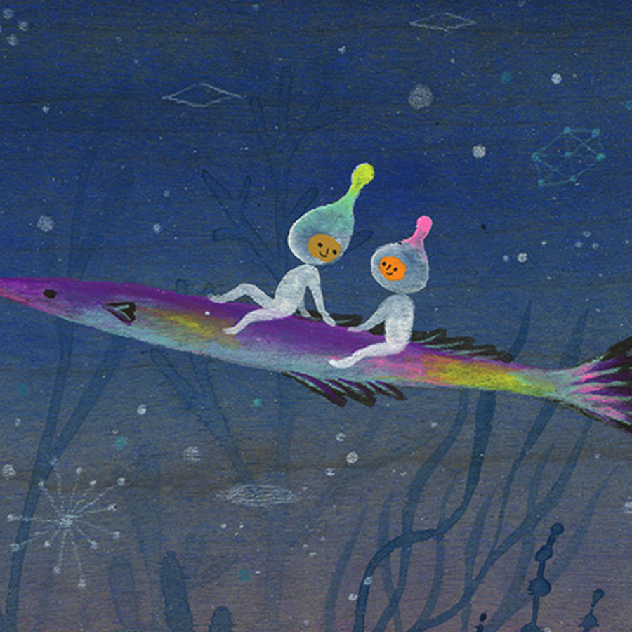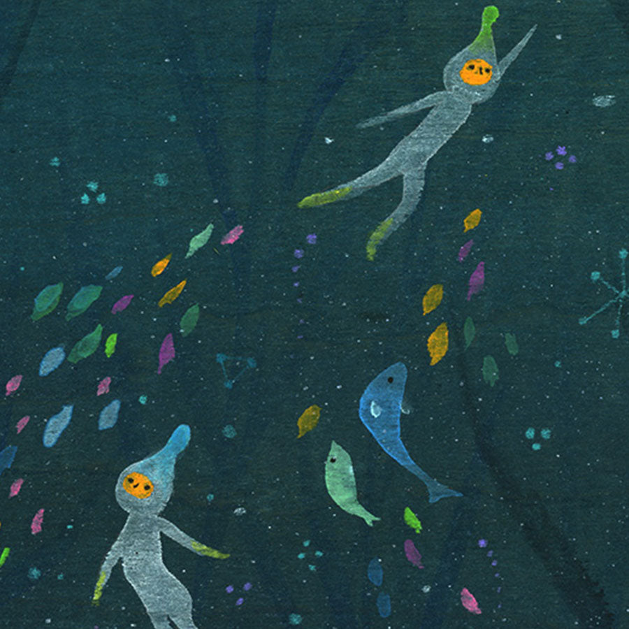 Apak Studio is a collaborative project between Aaron Piland and Ayumi Kajikawa. They create artwork together as a way exploring the beauty, mystery, and magic of life. Apak paint rich and colorful gouache/acrylic artworks on wood featuring the utopian lives and adventures of curious little beings living harmoniously in lush fantastic environments surrounded by friendly little animals.