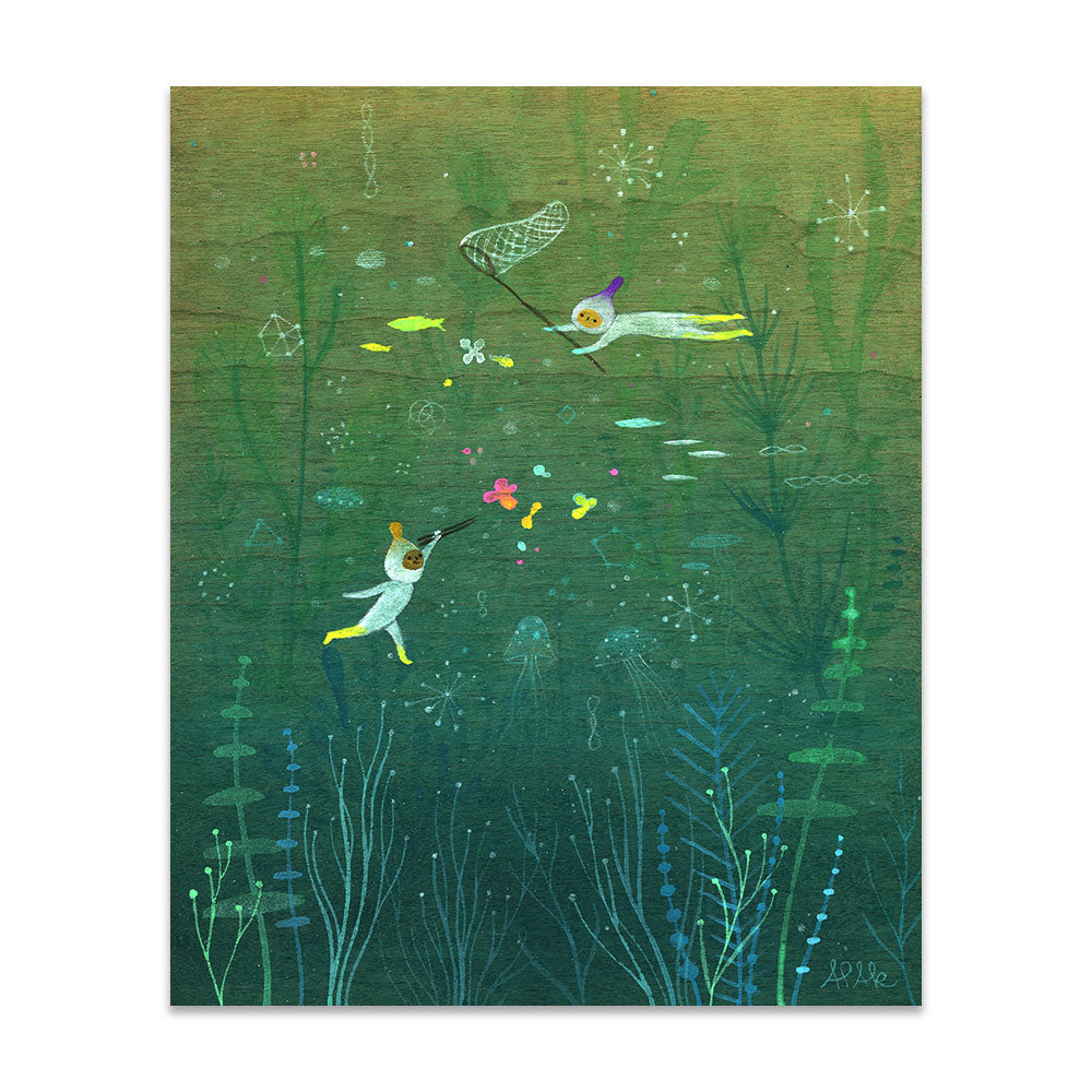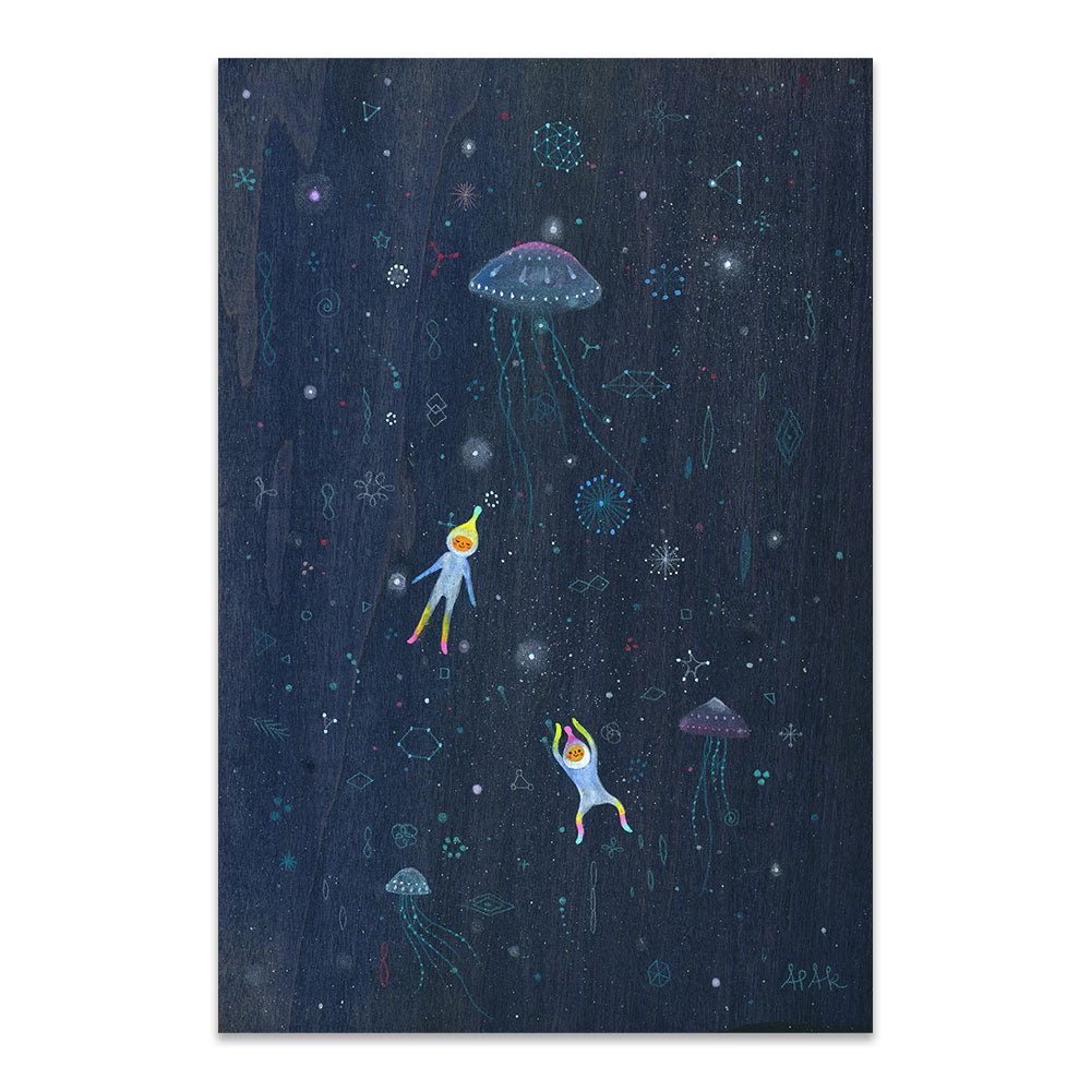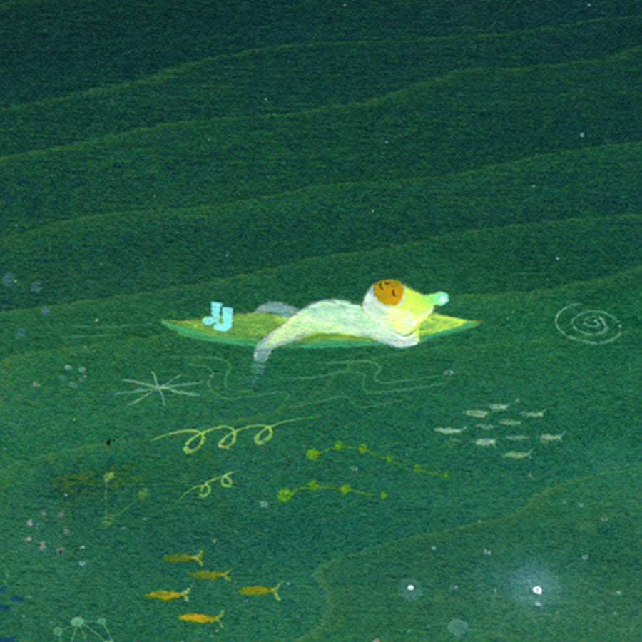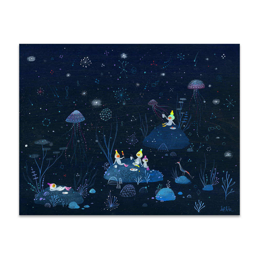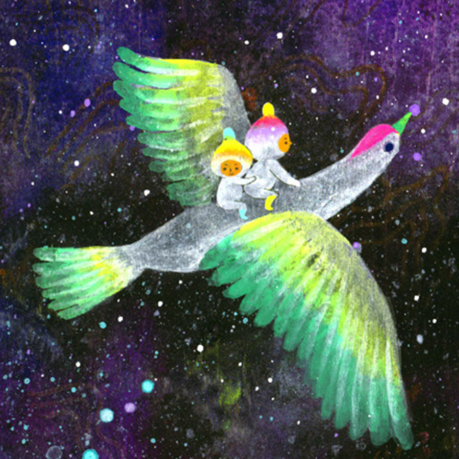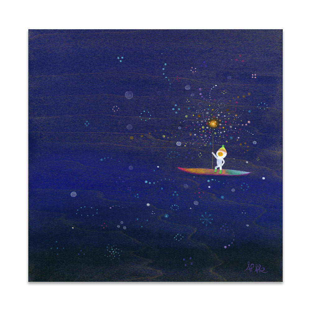 Apak Studio is a collaborative project between Aaron Piland and Ayumi Kajikawa. They create artwork together as a way exploring the beauty, mystery, and magic of life. Apak paint rich and colorful gouache/acrylic artworks on wood featuring the utopian lives and adventures of curious little beings living harmoniously in lush fantastic environments surrounded by friendly little animals.