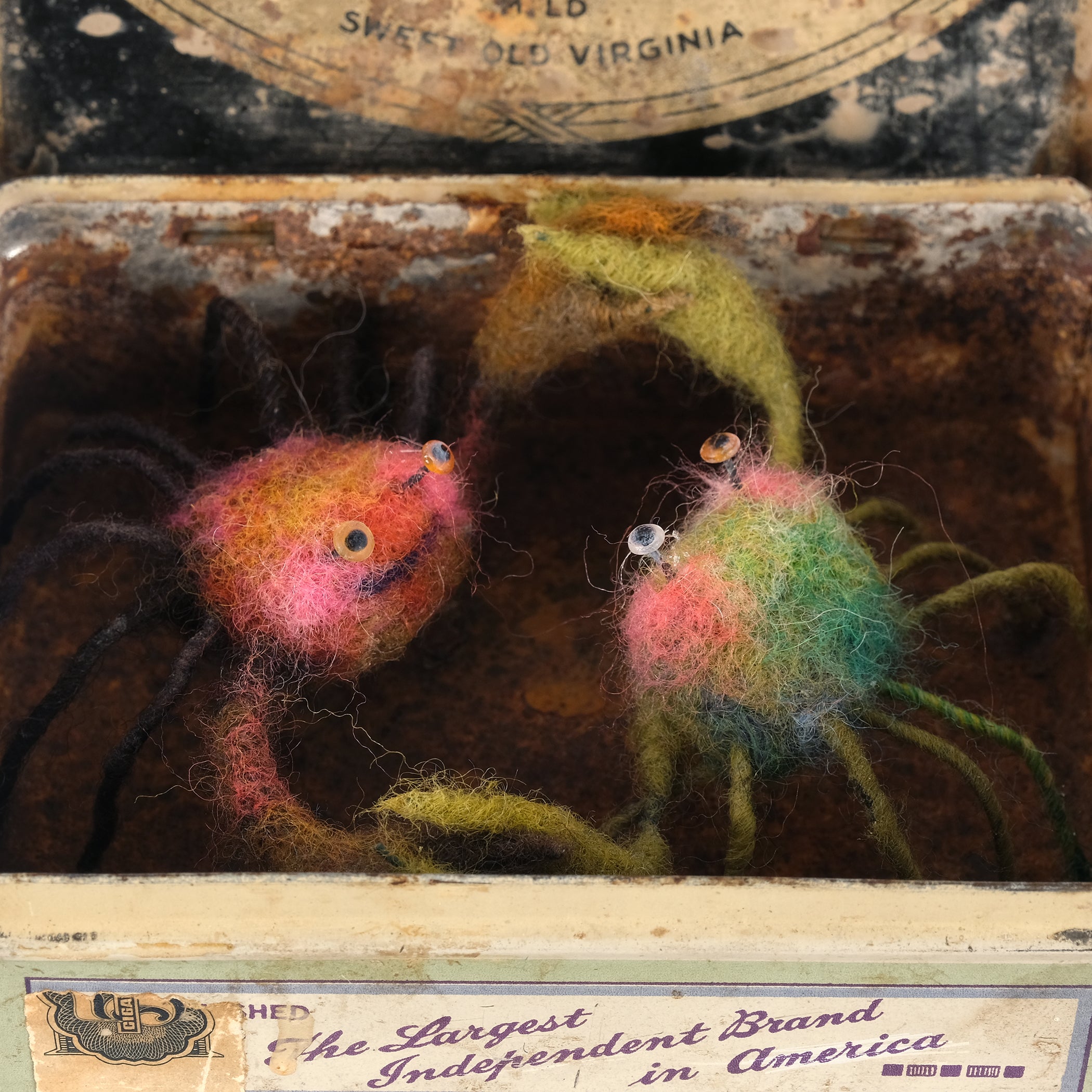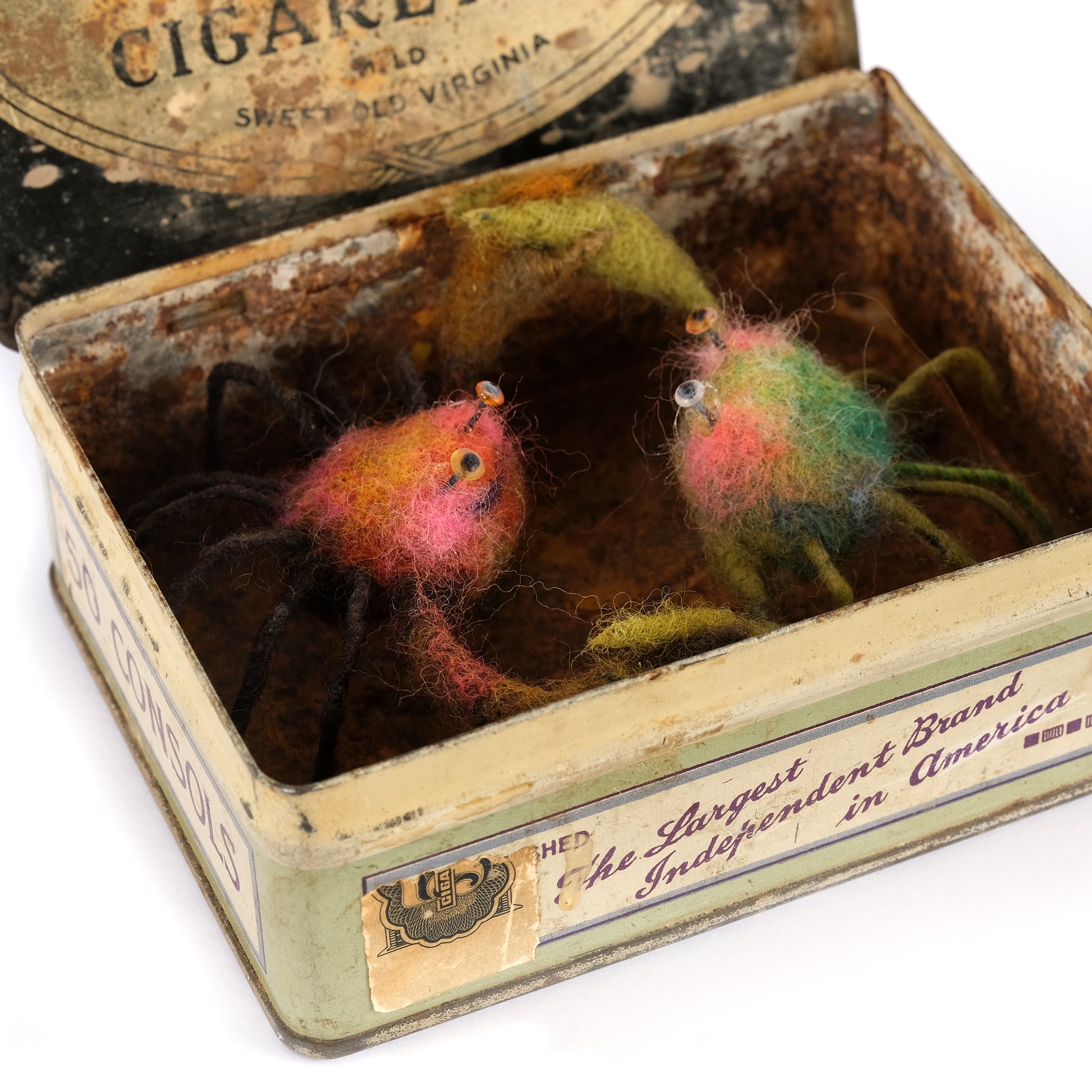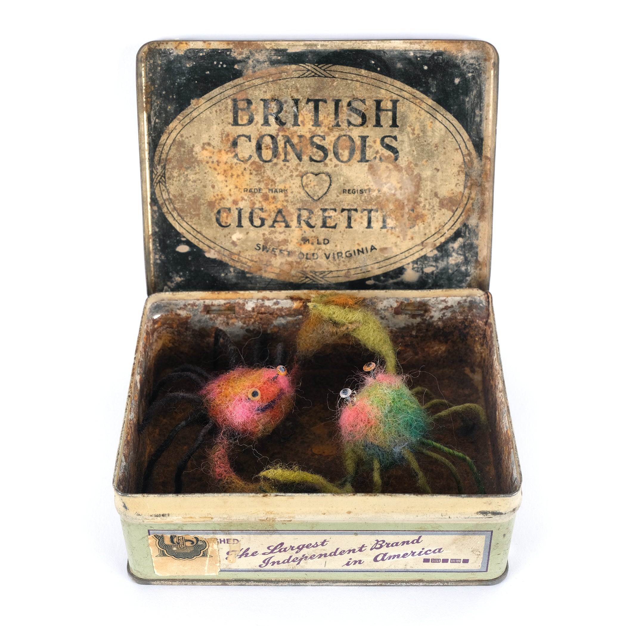 Medium: Mixed media, needle felted figures, vintage cigarette tin.