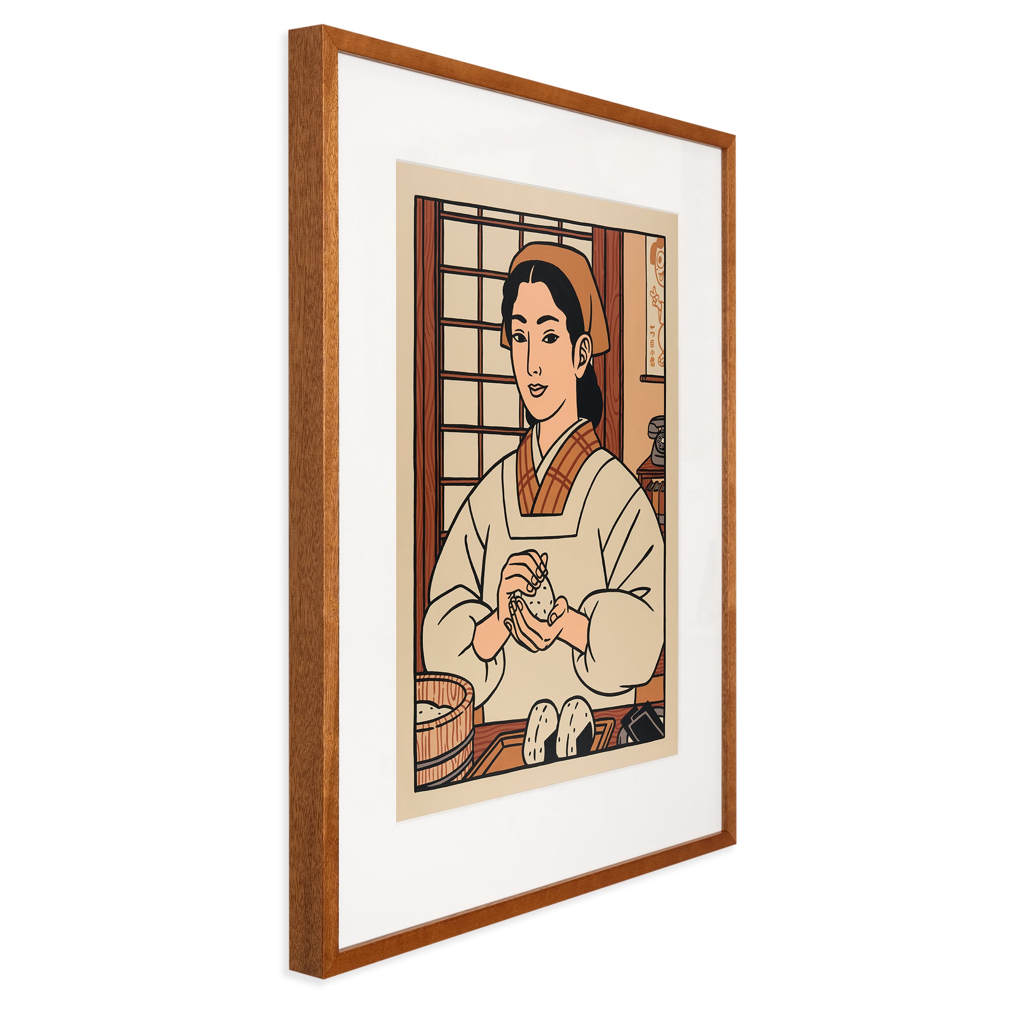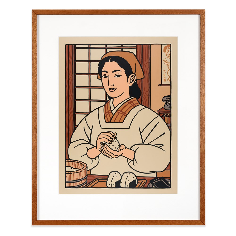 The works can be divided into two 'series', the first being a set of eight portraits showing various characters eating or serving Japanese food. The title of the show - Itadakimasu - is what Japanese people say before eating. These artworks are very brief moments in the day of the characters that are depicted, like a quick photo someone would have taken. It’s everyday life.